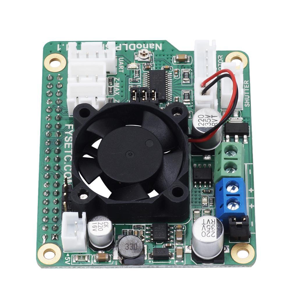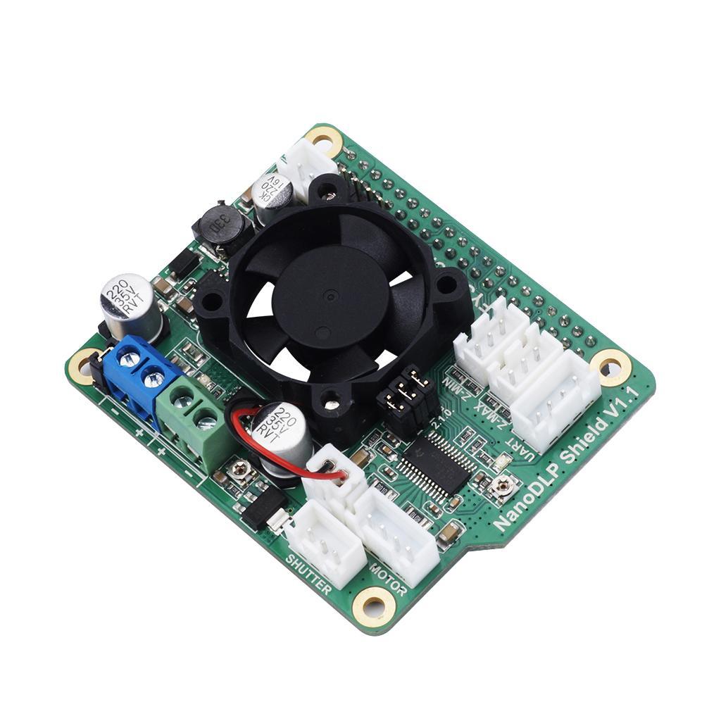 The board contains a 9-28V to 5V circuit, providing up to 3A of current, as well as the required NanoDLP 9V-28V to 5V@3A Buck Converter, DRV8825 Stepper Driver, 12V Fans (cooling the Raspberry Pi).