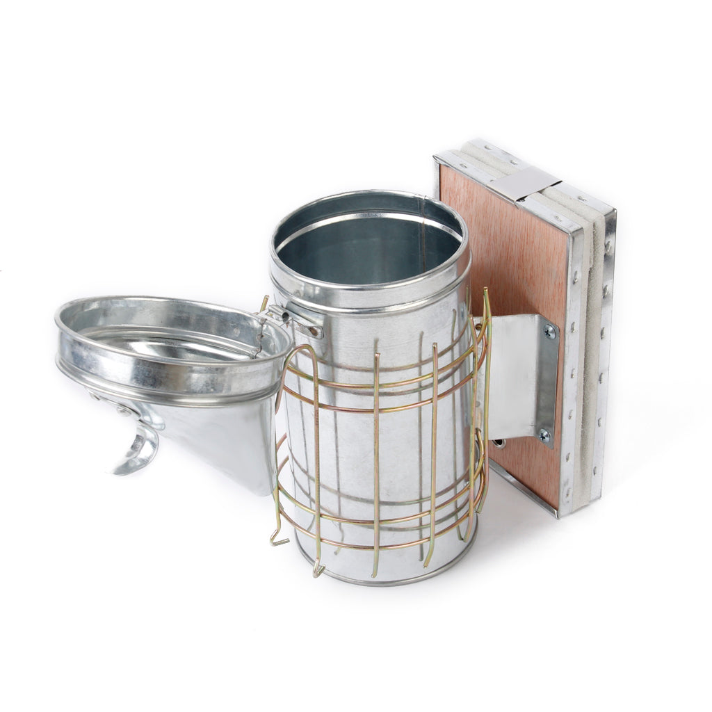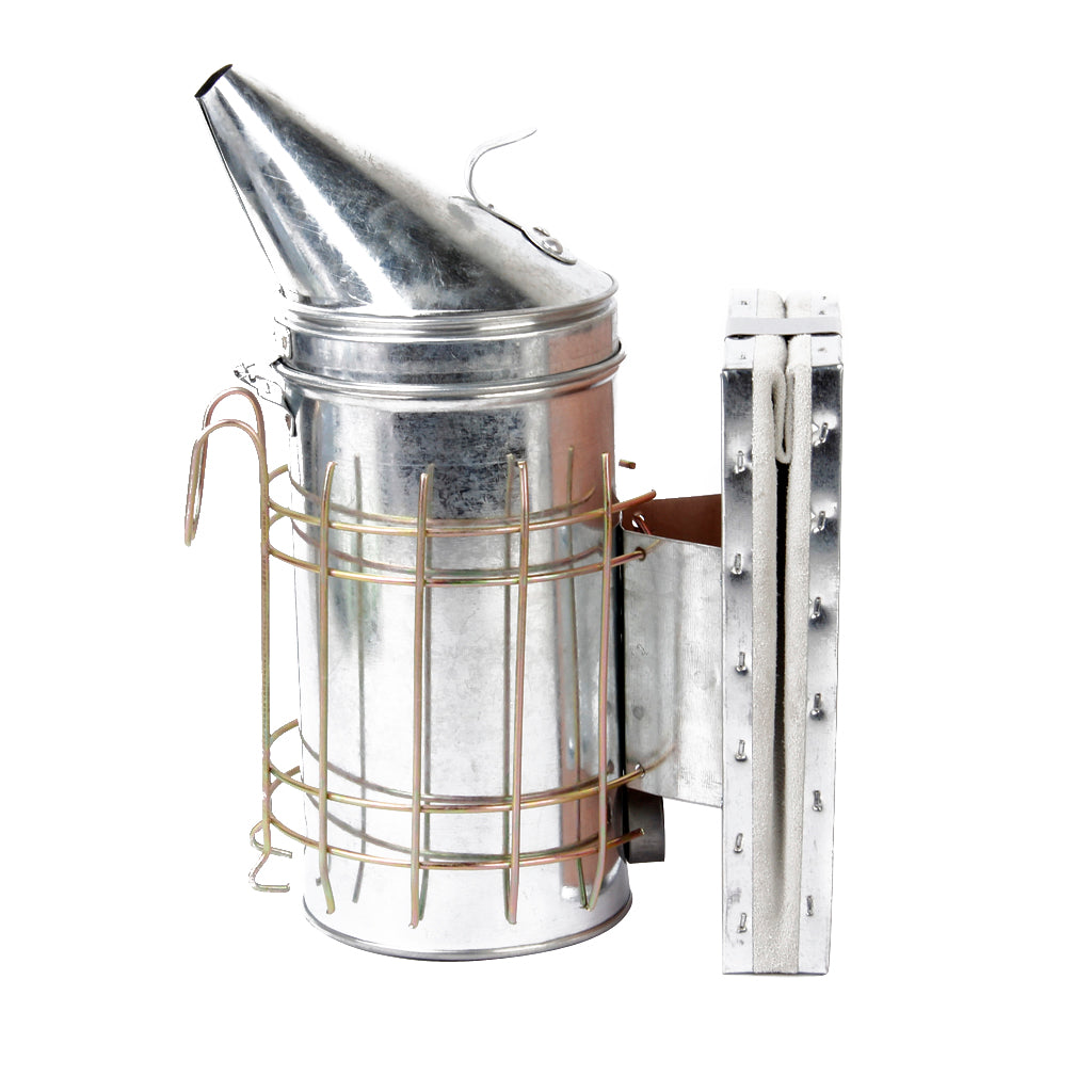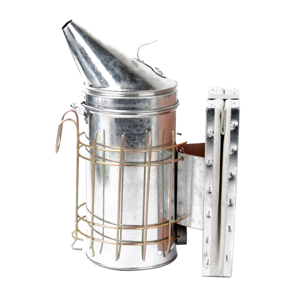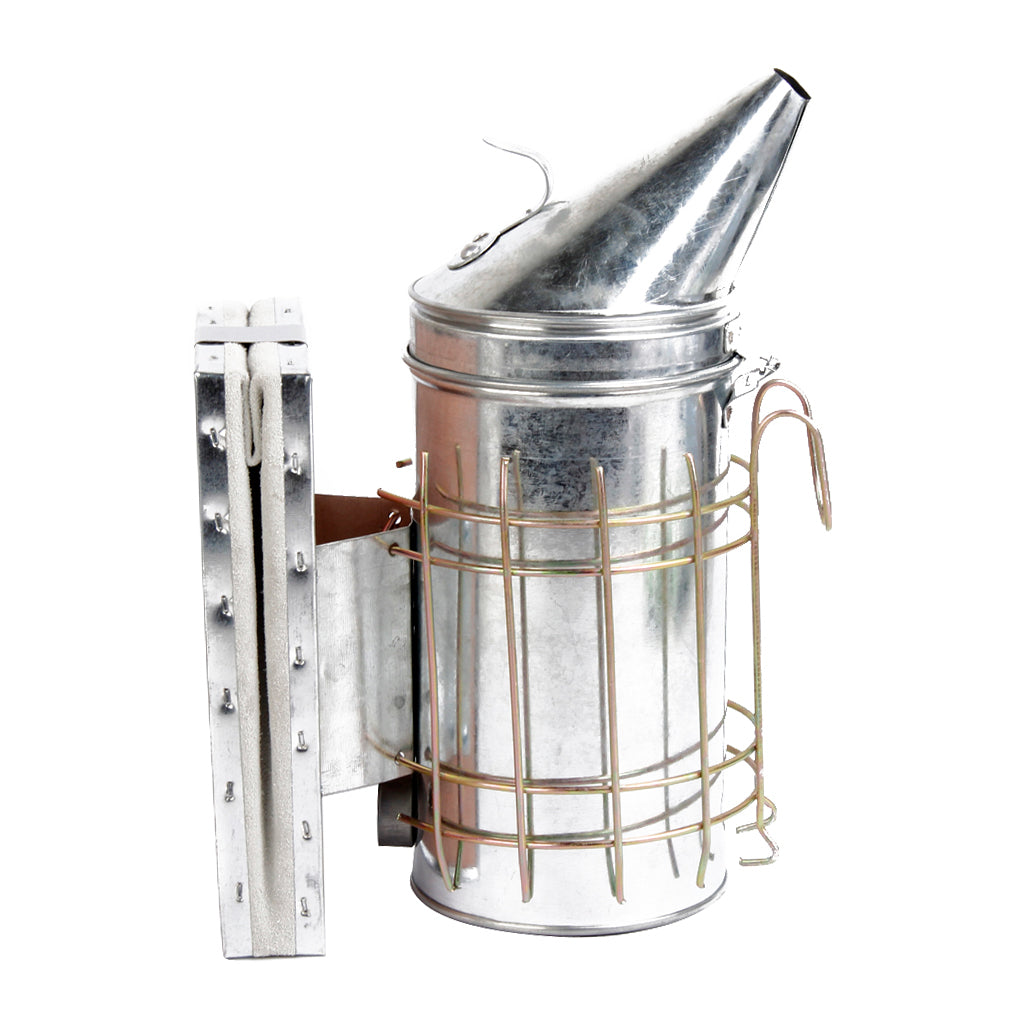This is a new bee smoker made with galvanized sheet steel with a heat and cowhide leather bellows. The heat protects the user from touching the hot canister. Part of the heat has a hook so it can hang on the side of an open hive box or honey super. There is a floor spacer to provide an air pocket at the bottom of the smoker body to ensure good air flow.