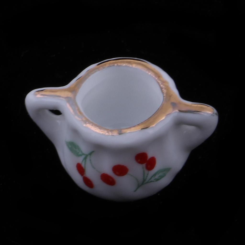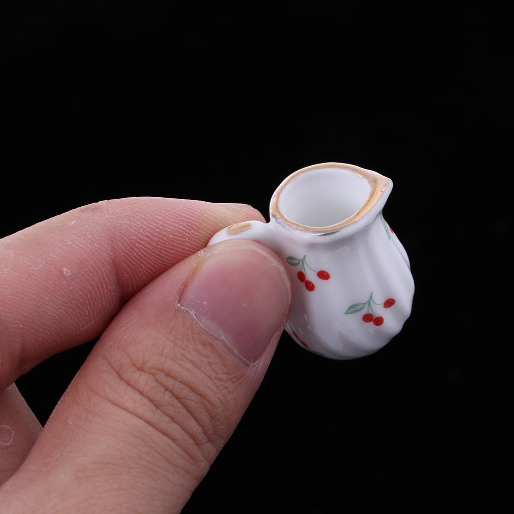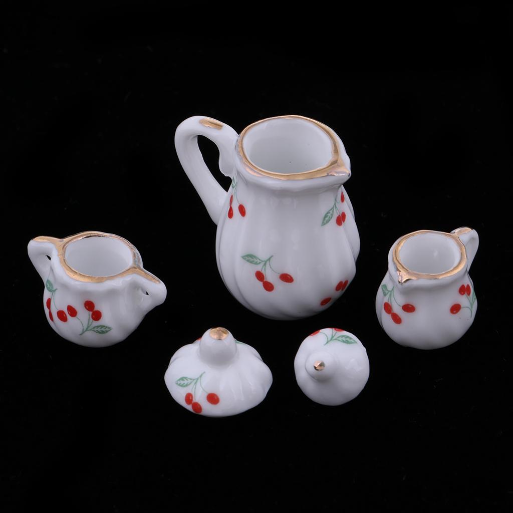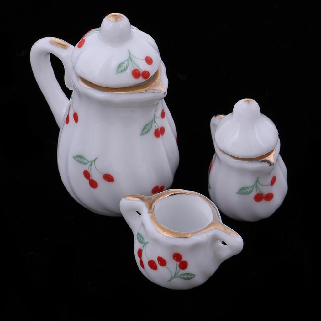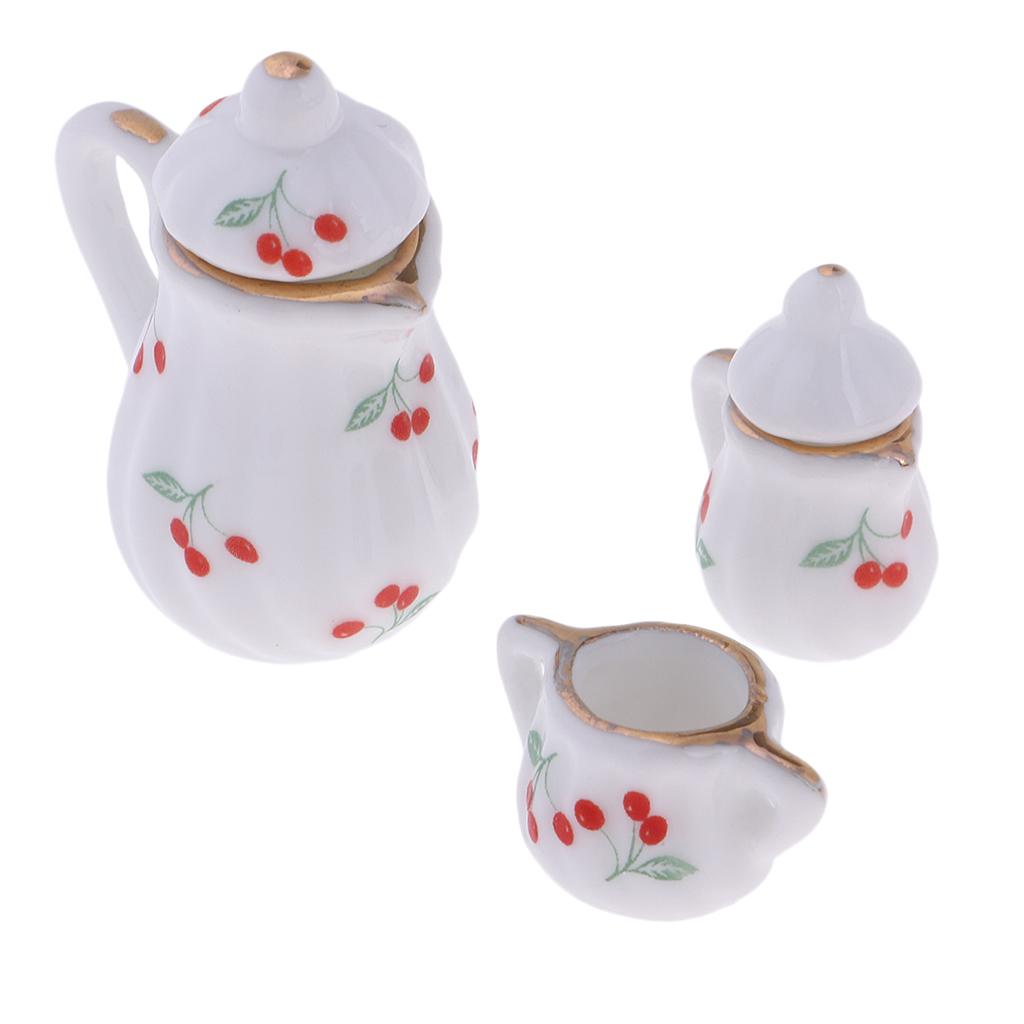 dollhouse miniature porcelain tea pot cherry pattern kettle model set for kitchen,