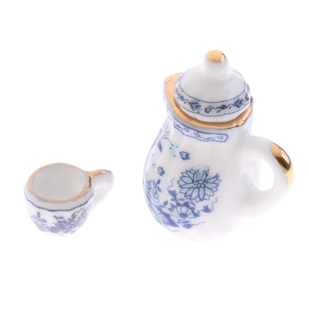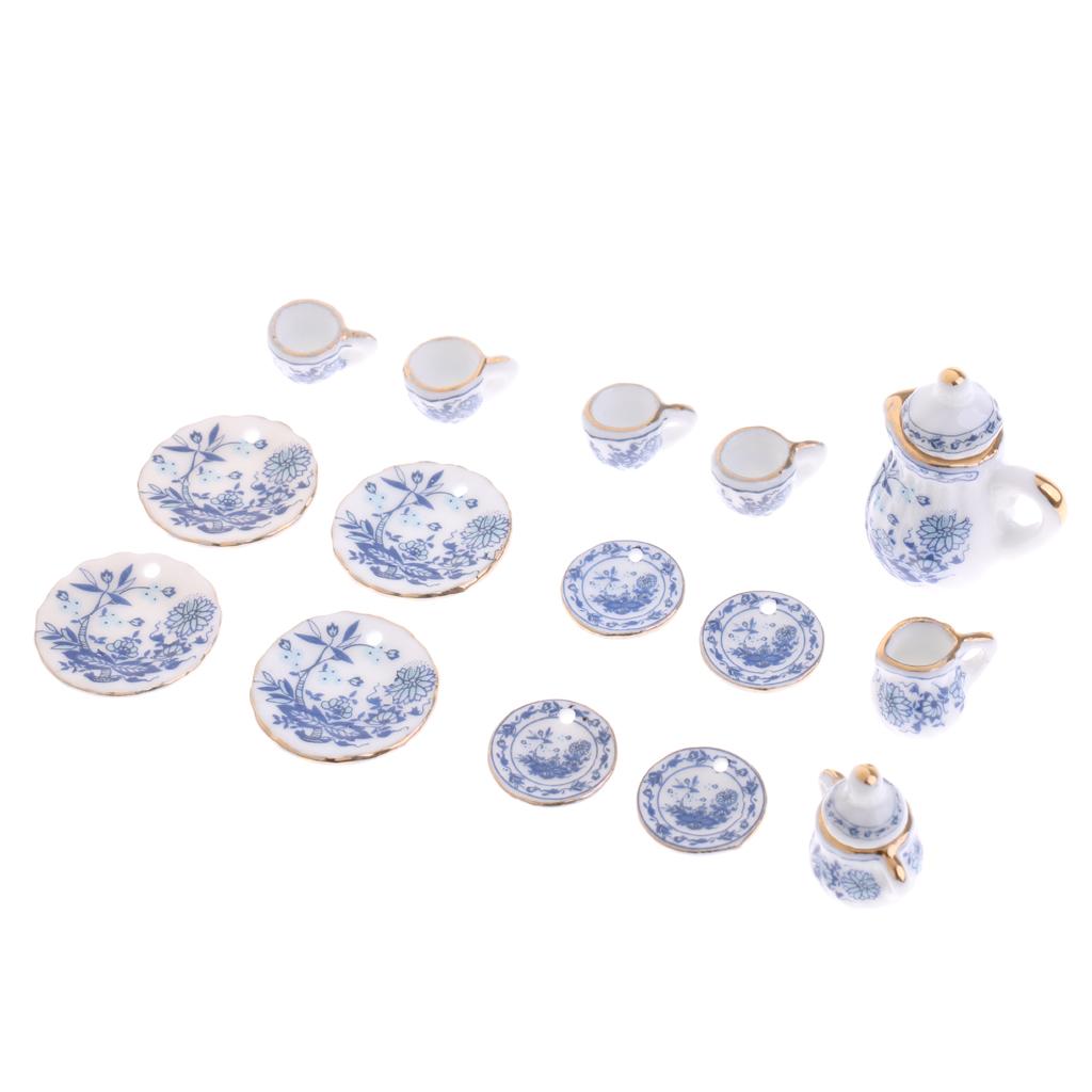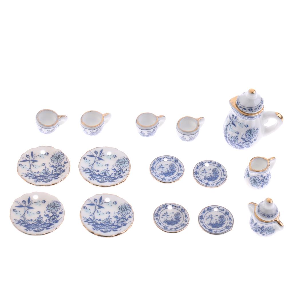 1/12 Scale Miniature Classic blue flower printed china tea set pot cup saucer plate 15 pieces set