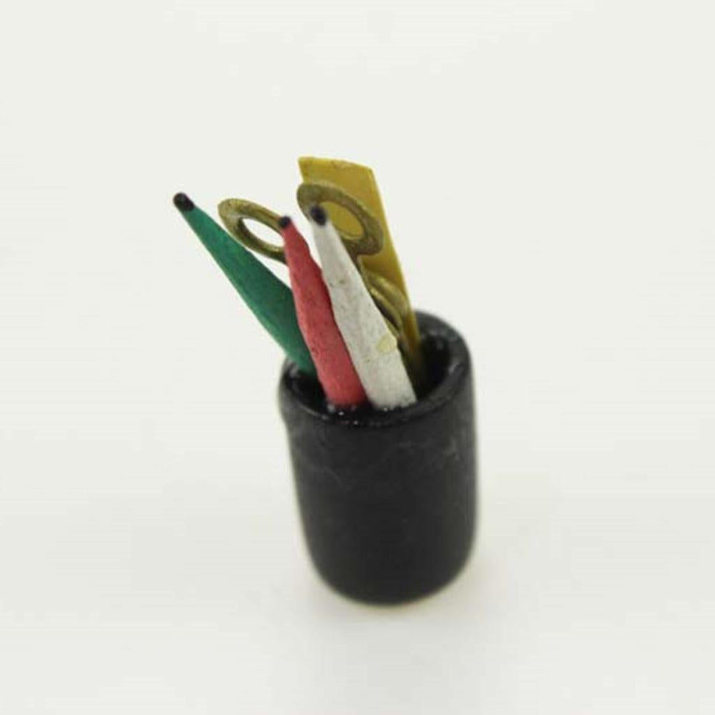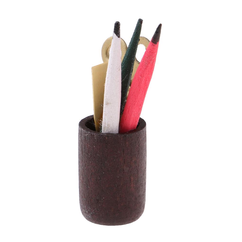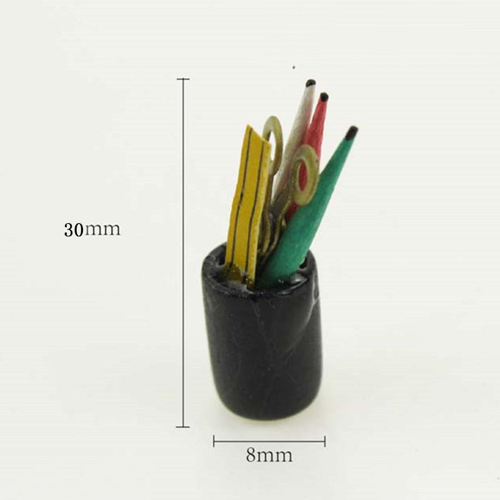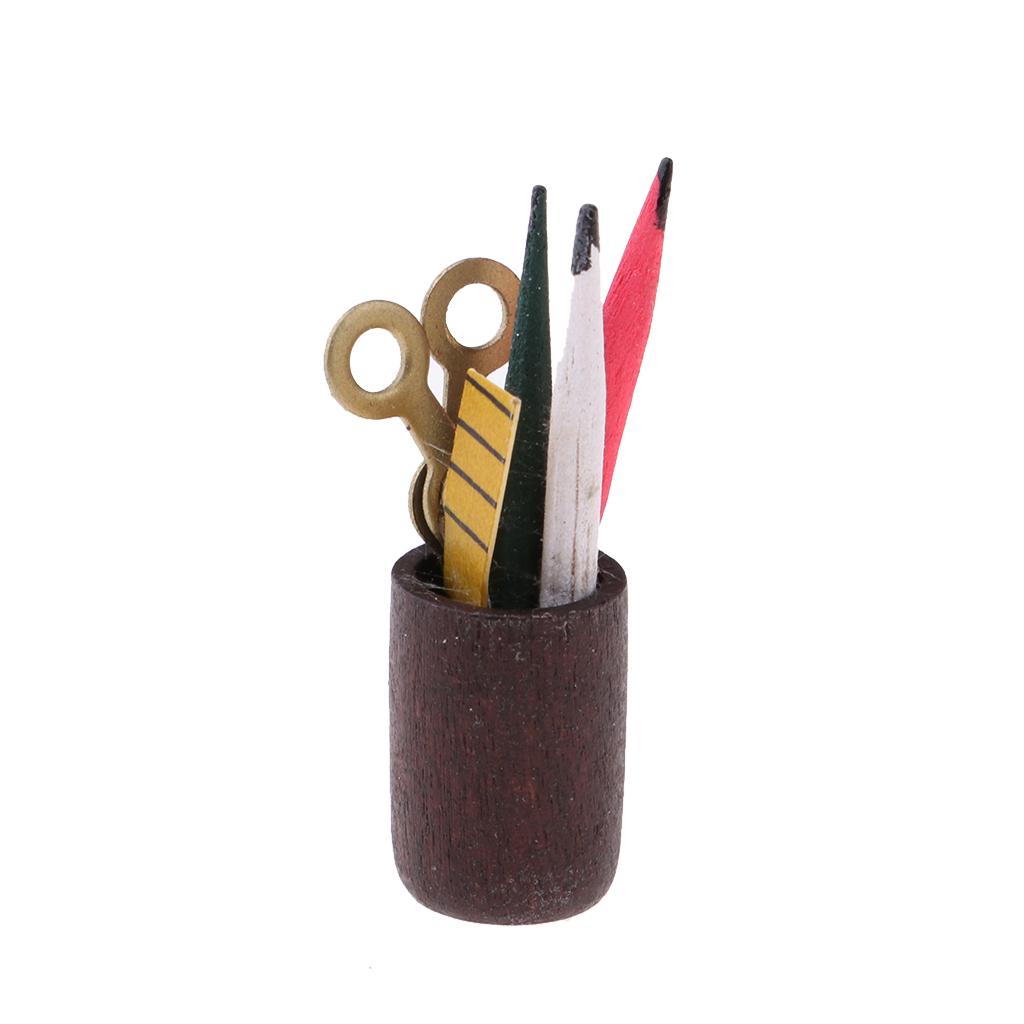 Handmade miniature wooden pen cup pen holder, including 3 pieces pencils, 1 piece ruler and 1 pair of scissor model for dollhouse kids DIY projects