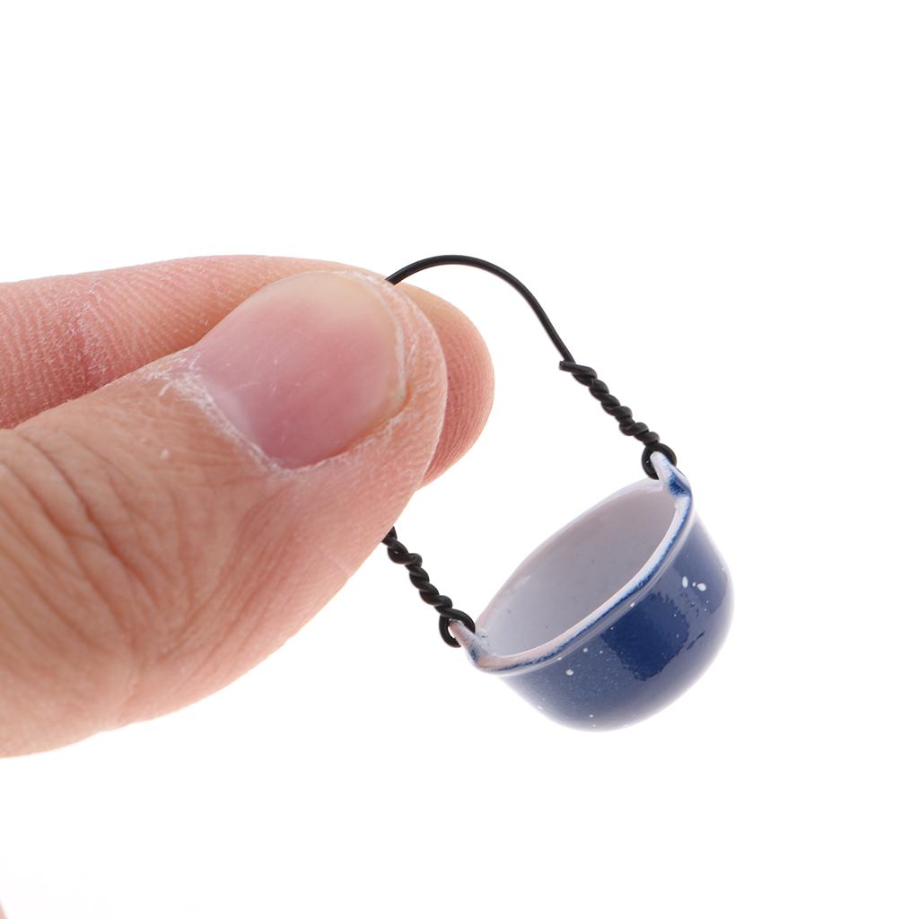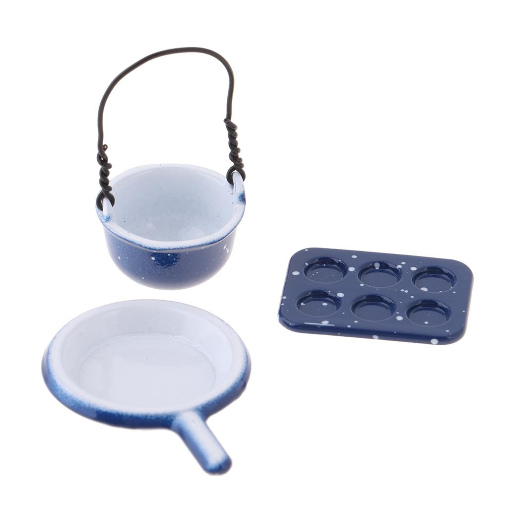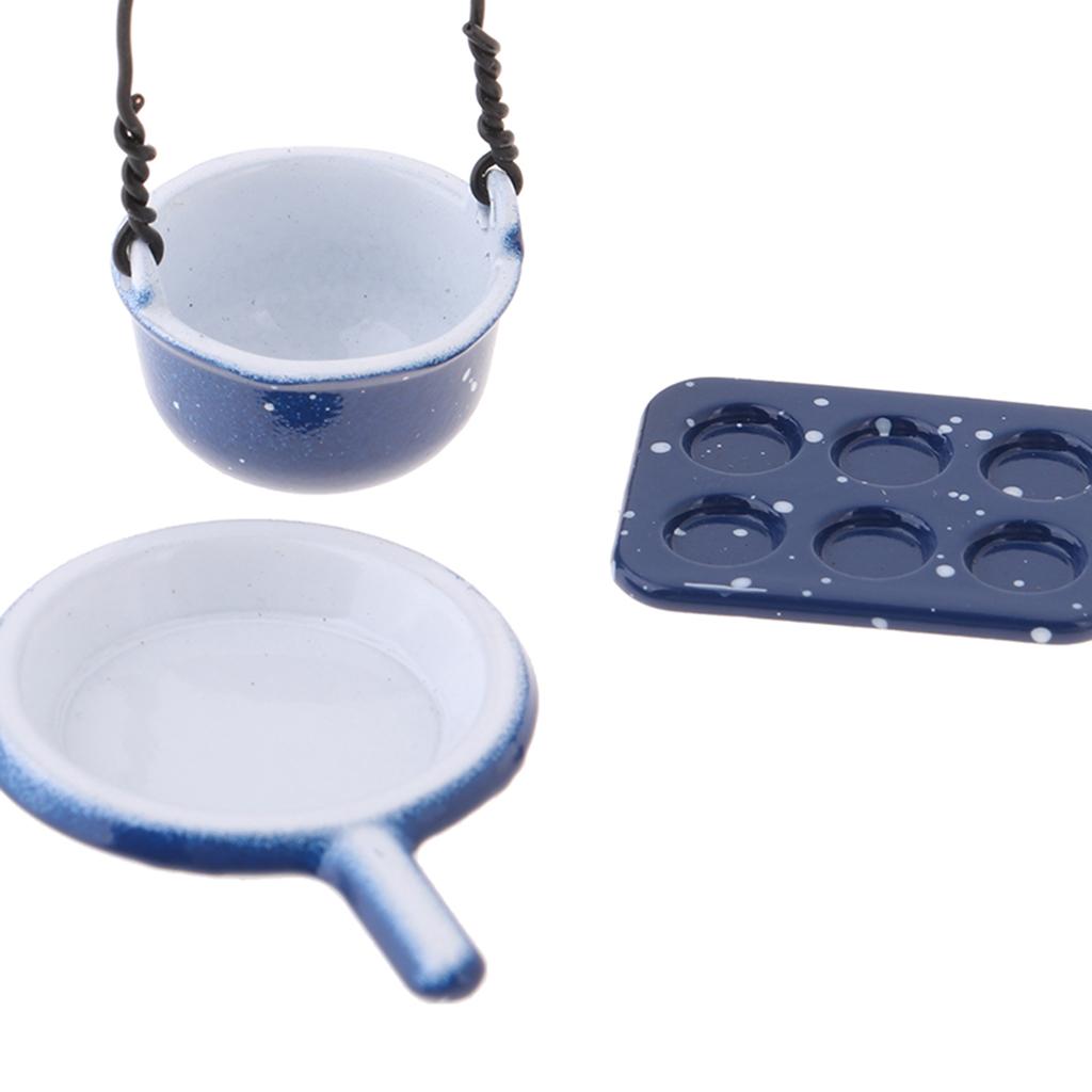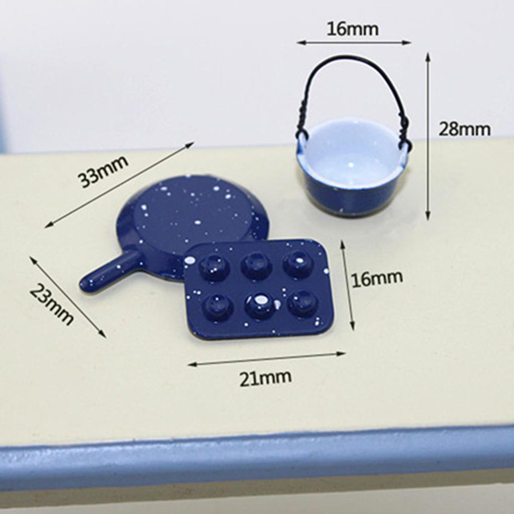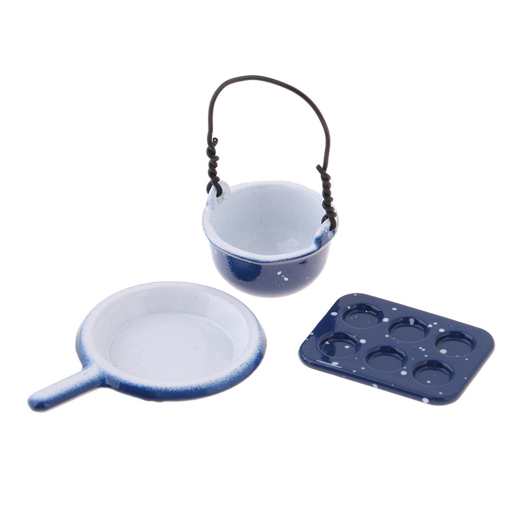 1/12 Scale Blue Ceramic Plate Frying Pan Pot 3pcs Model for Dolls House Kitchen Life Scenes Decor Accessories