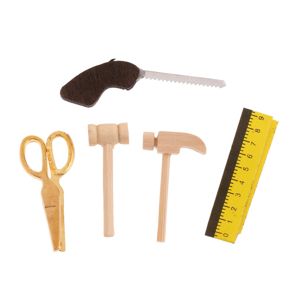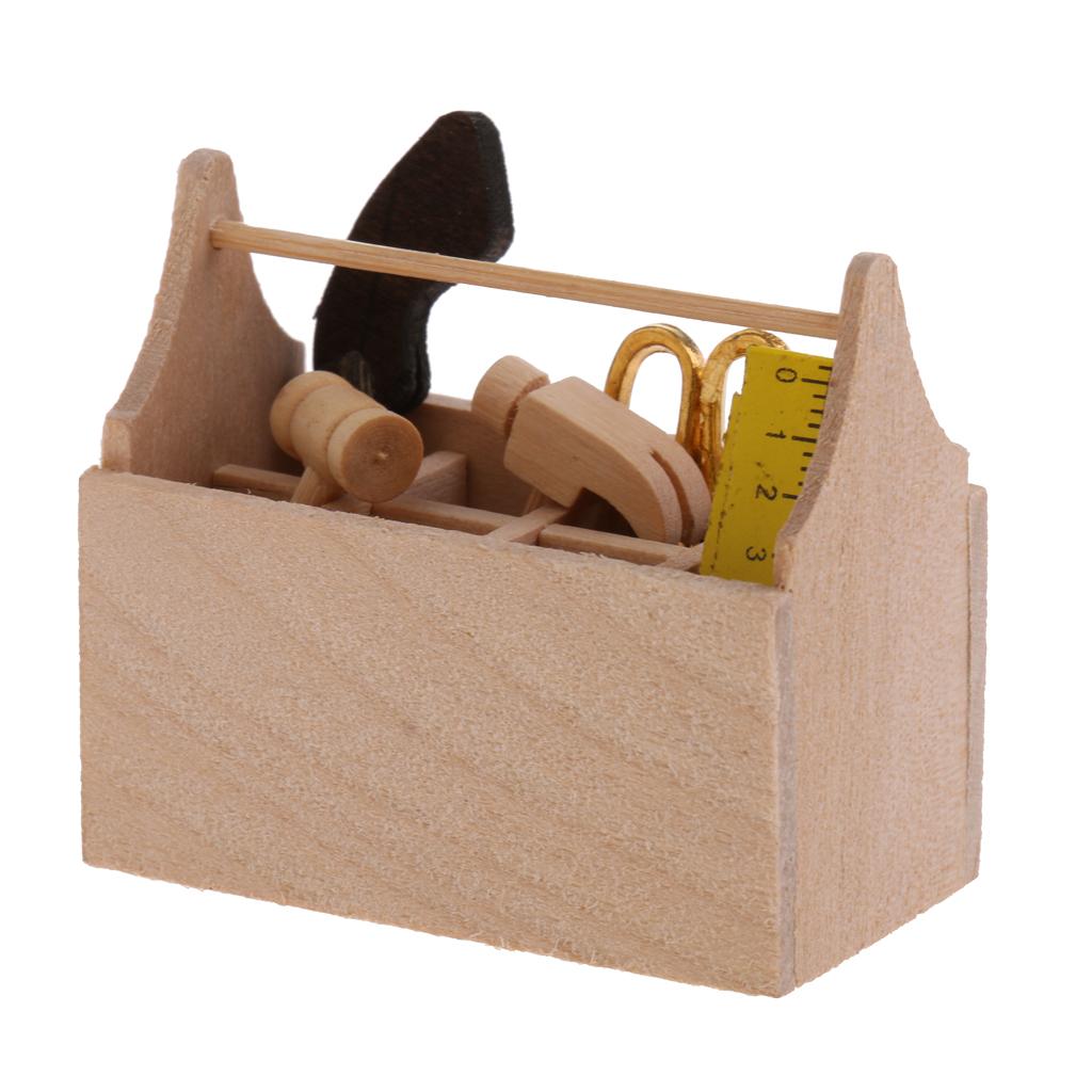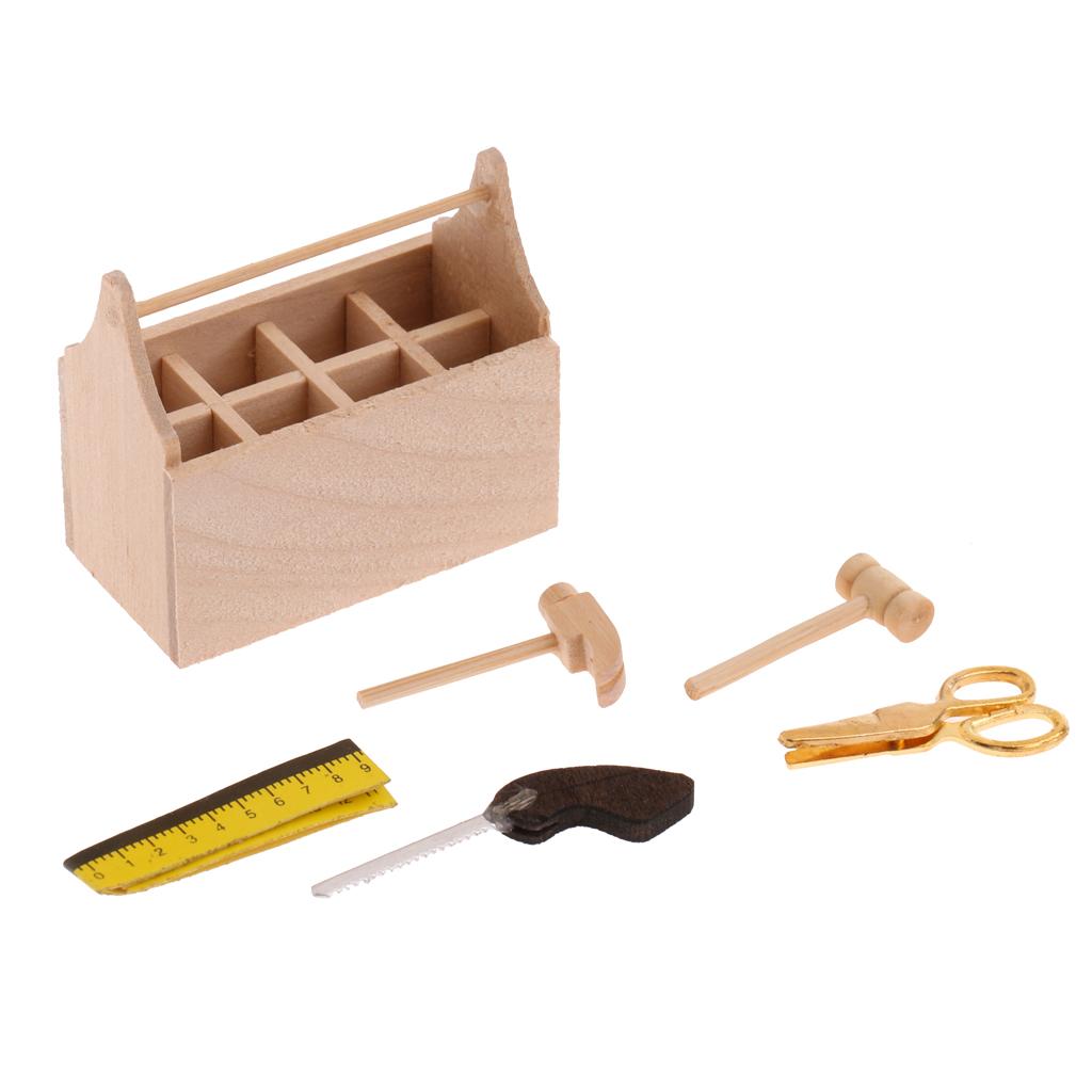 Dolls House Wooden Toolkit Toolbox Furniture Set-Scissors,Hammer,Sawtooth,Peg Hammer,Tap and Box
