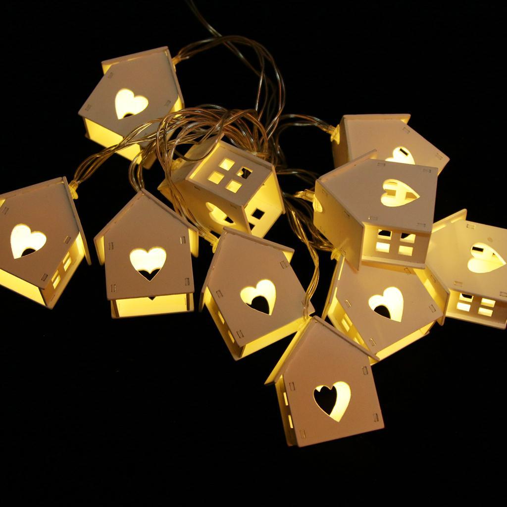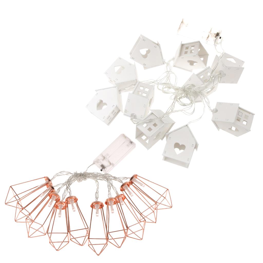 10 LED metal rose gold diamond geometric string lights, and 10 LED house ornament bulbs, total 20 LED, all with warm white light, and all operated on 2x AA batteries (not included).