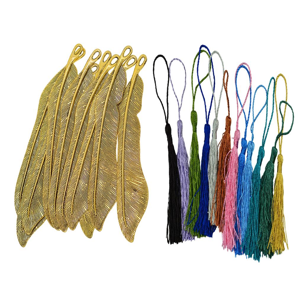 10Pcs antique gold feather shape metal bookmarks+ 12pcs multicolor tassels