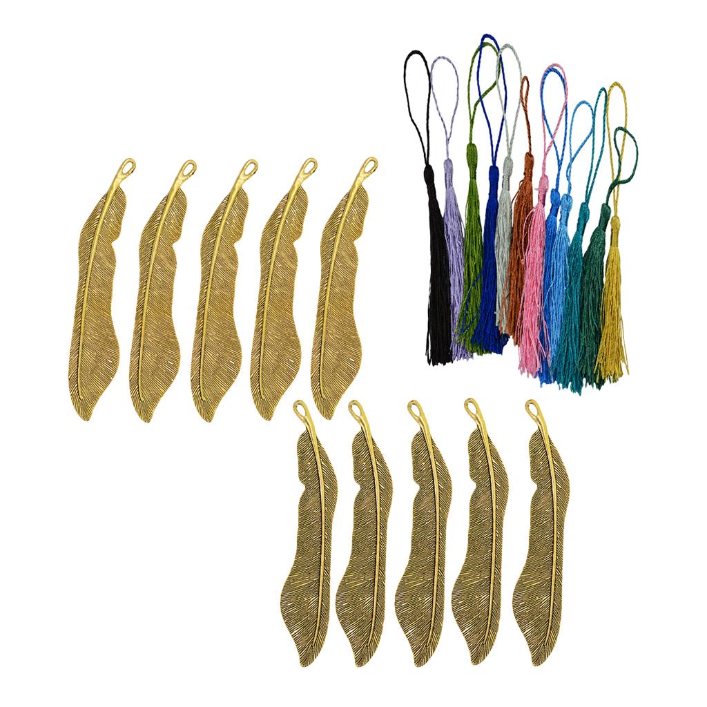 10 Pieces 110mm Antique Gold Metal Feather Bookmarks with Loop & 12 Silky Tassel Pendant DIY Handmade Beading Book Markers School Office Reading Gift