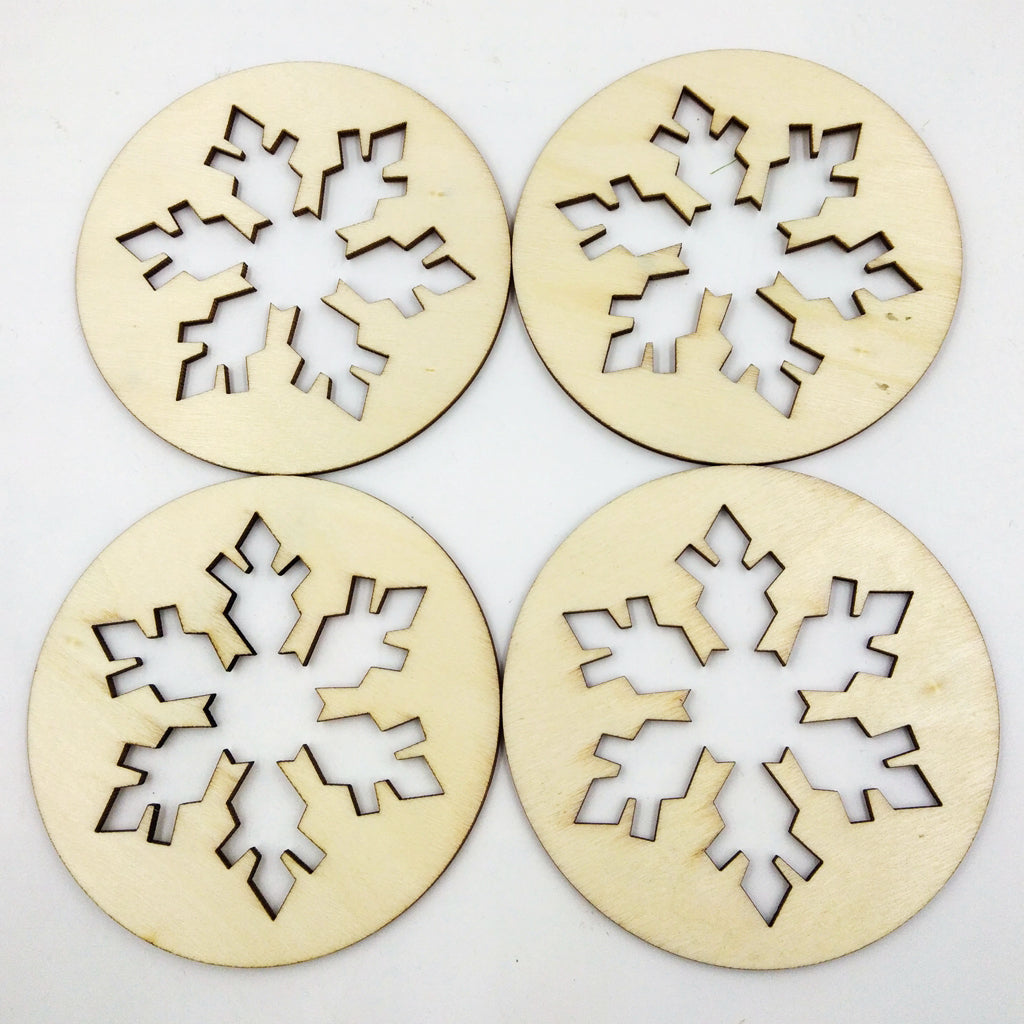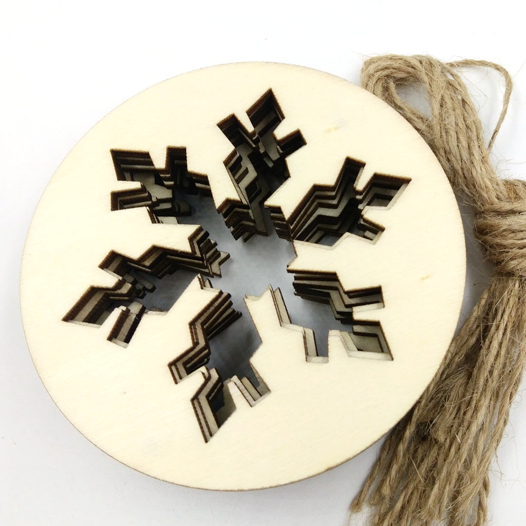 Wooden round hollow snowflake shapes with string, cut from high quality wood.