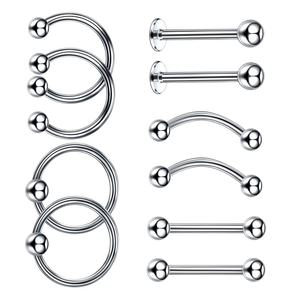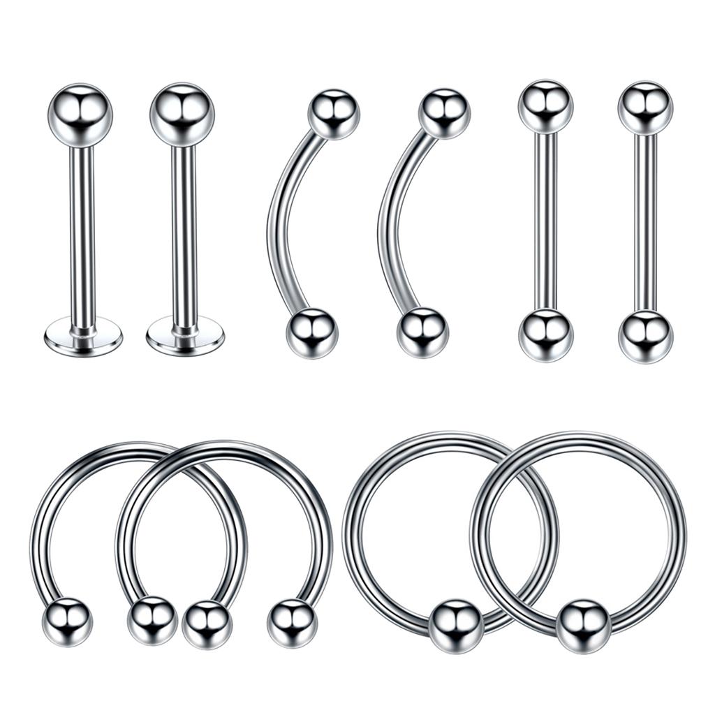 10 Pieces Nose Lip Tongue Eyebrow Tragus Navel Belly Ring Piercings 16g 10mm