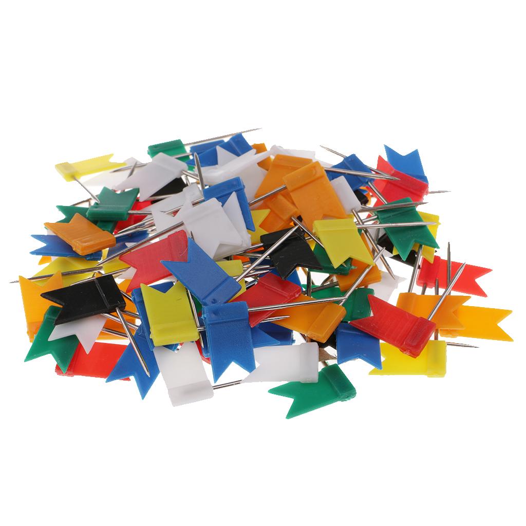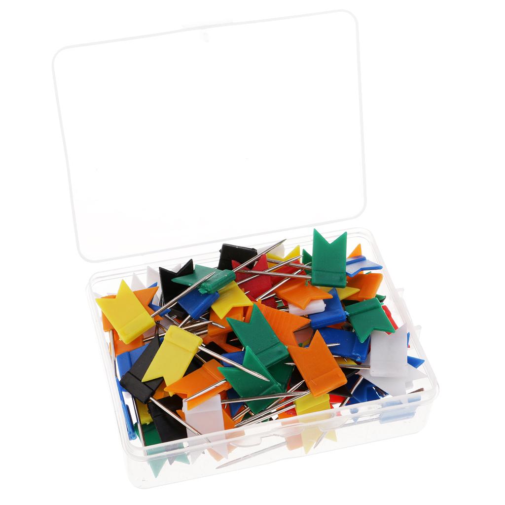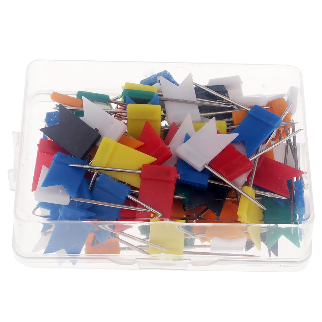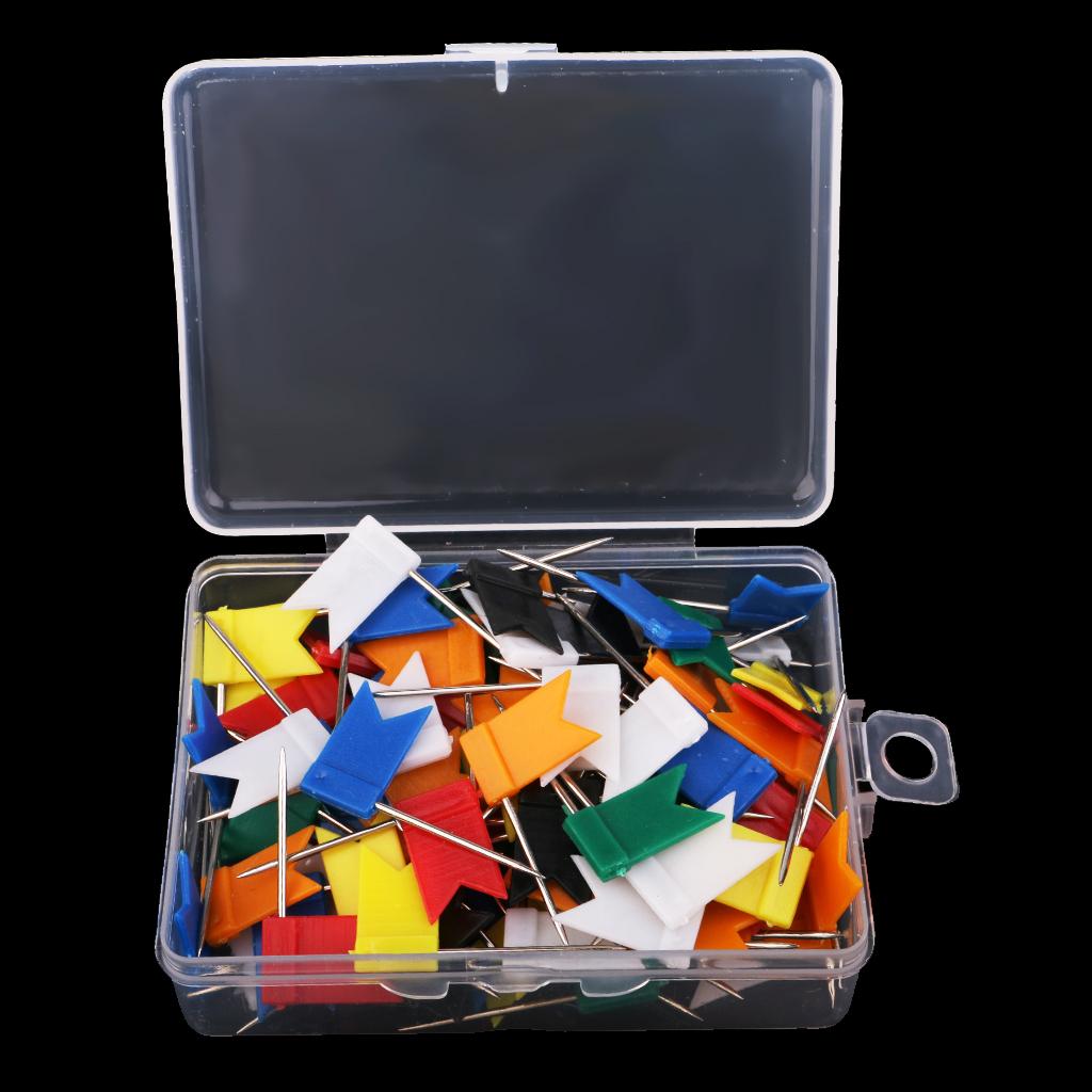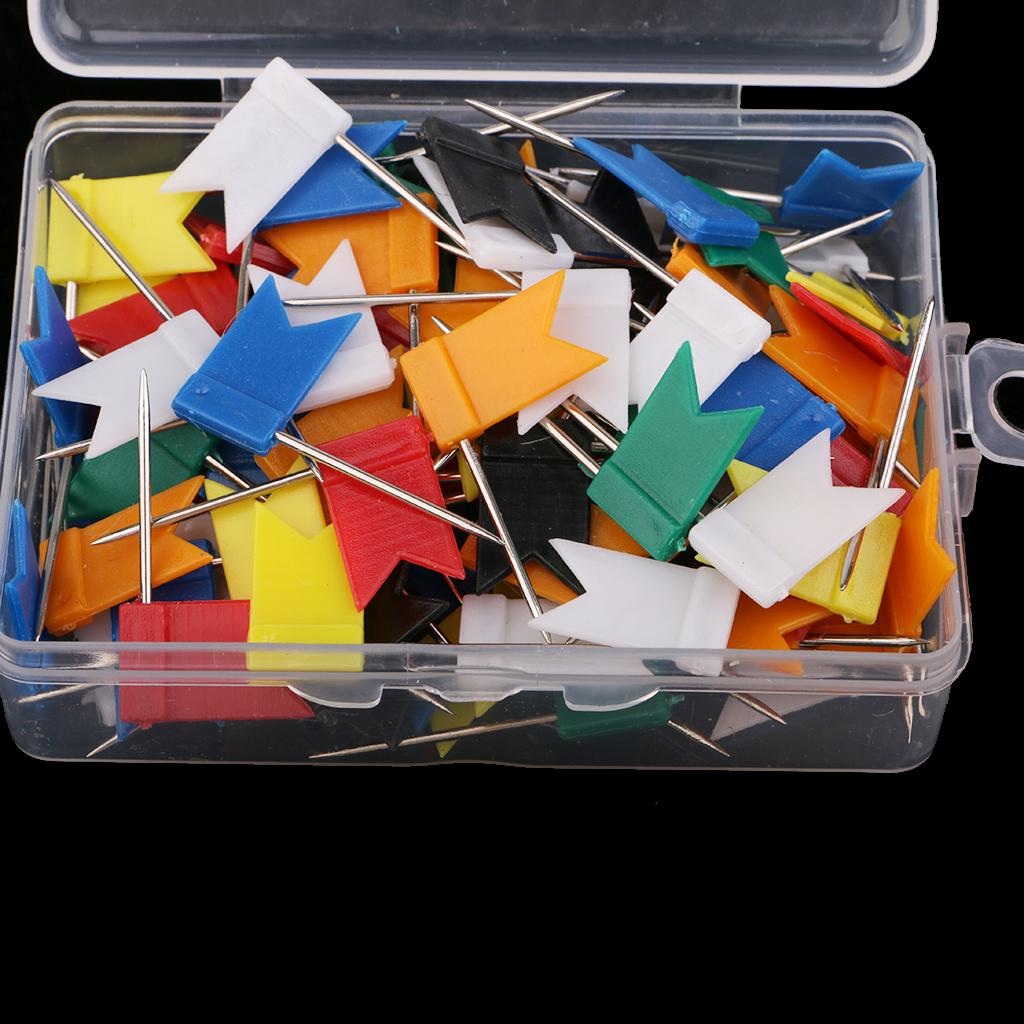 A box of 100 Pieces colorful map flag shaped push pins with steel straight pins.