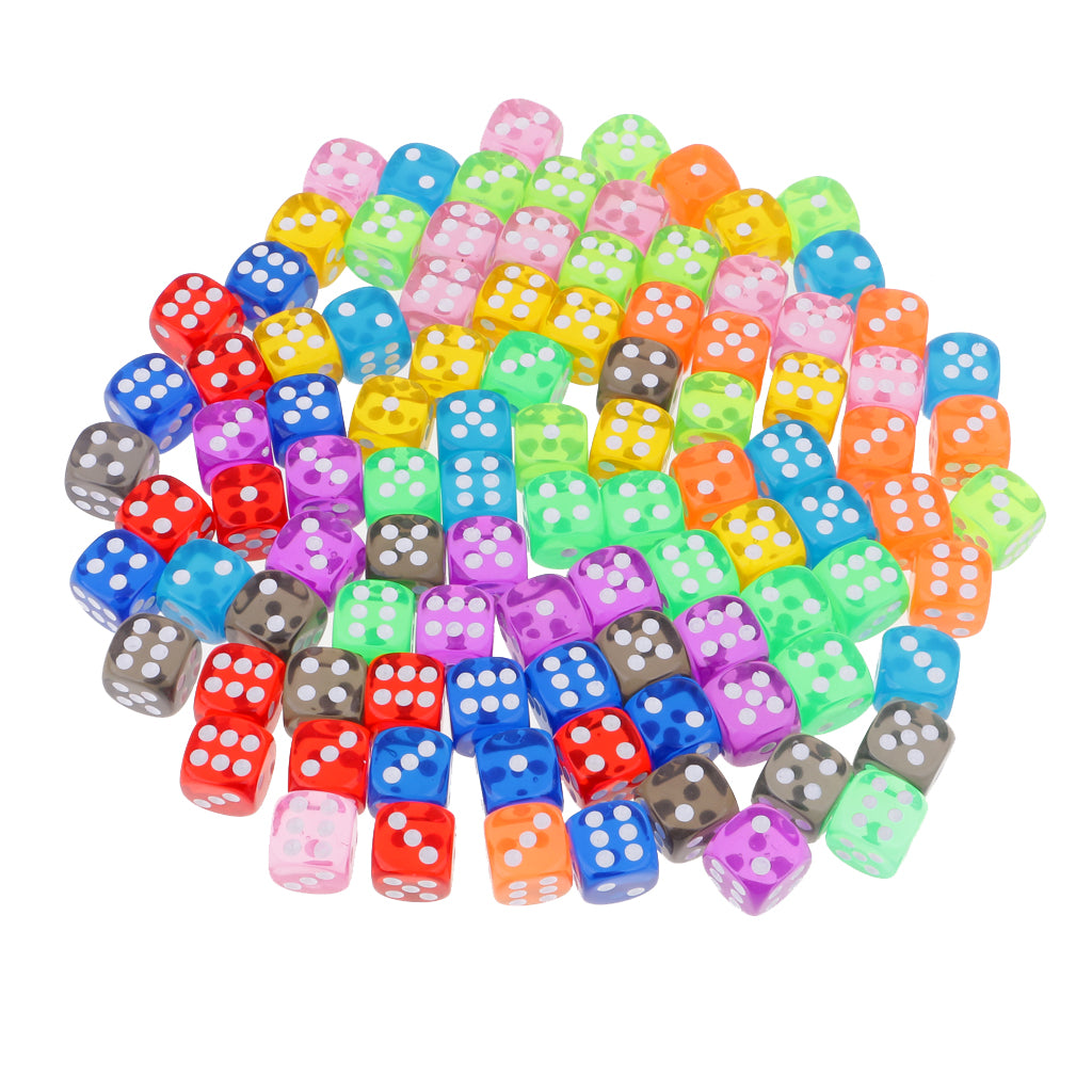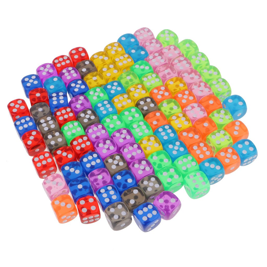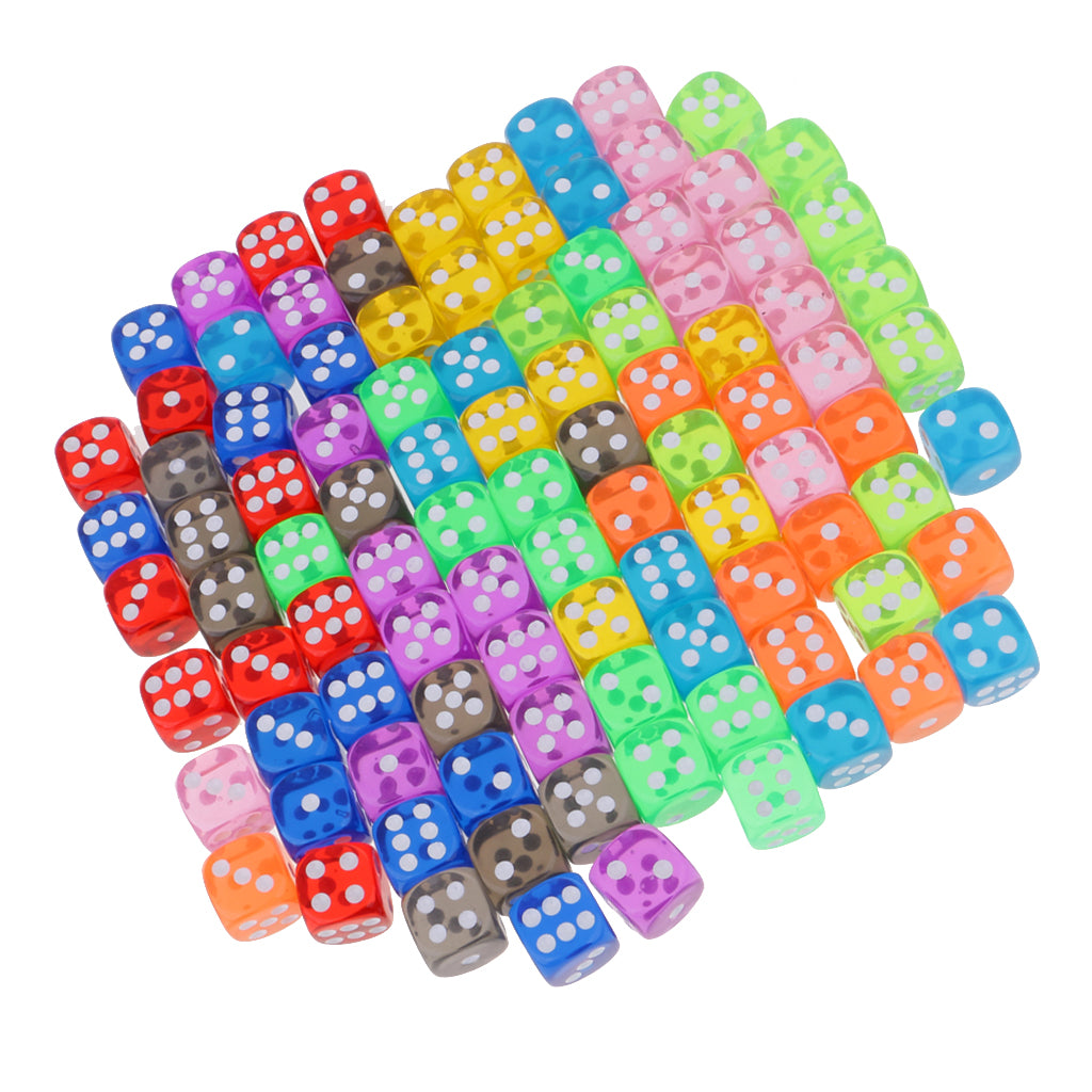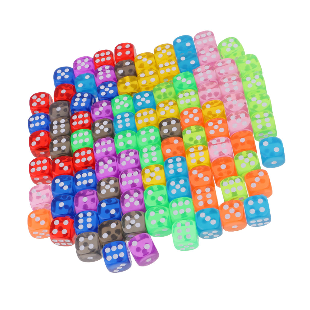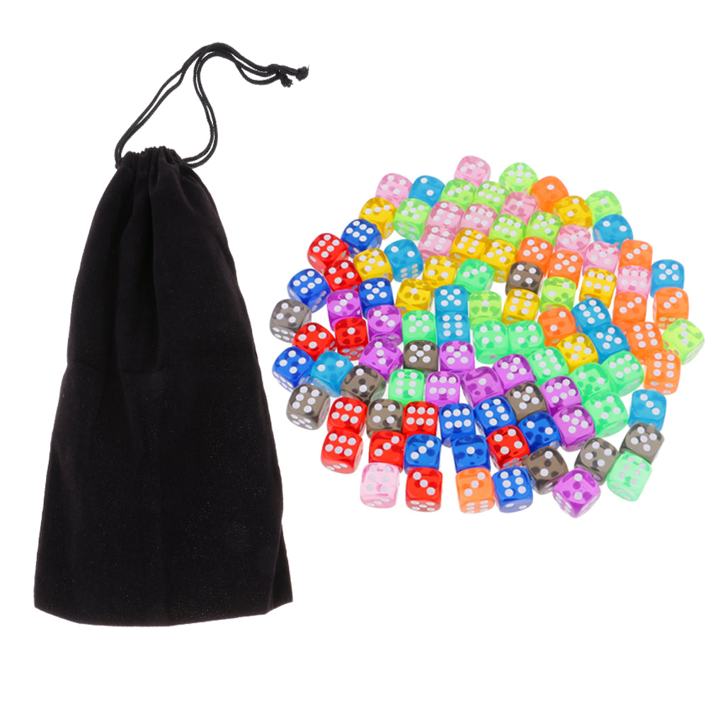 Pack of 100 16mm D6 multicolored transparent dice with beautiful carry bag, keeping you always portable with your dices.