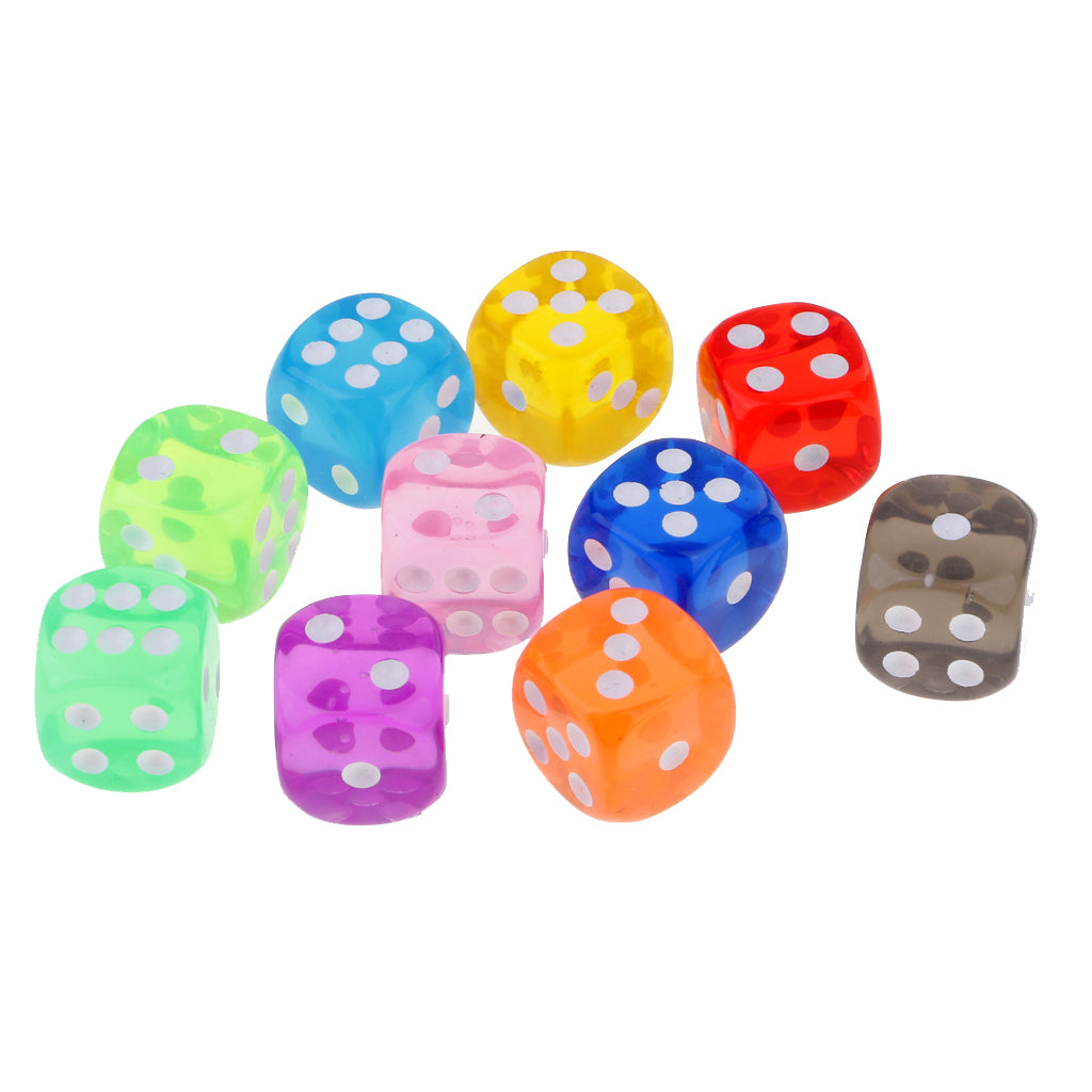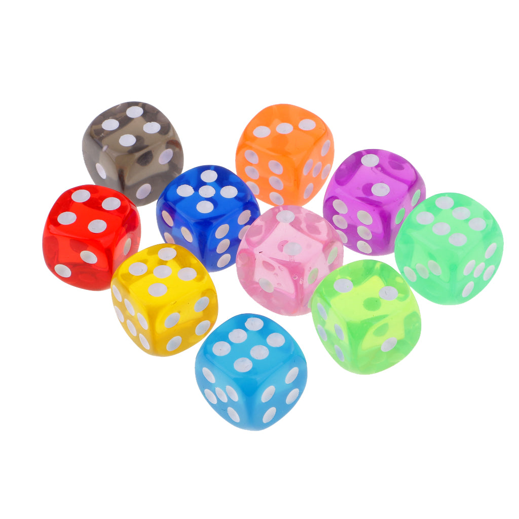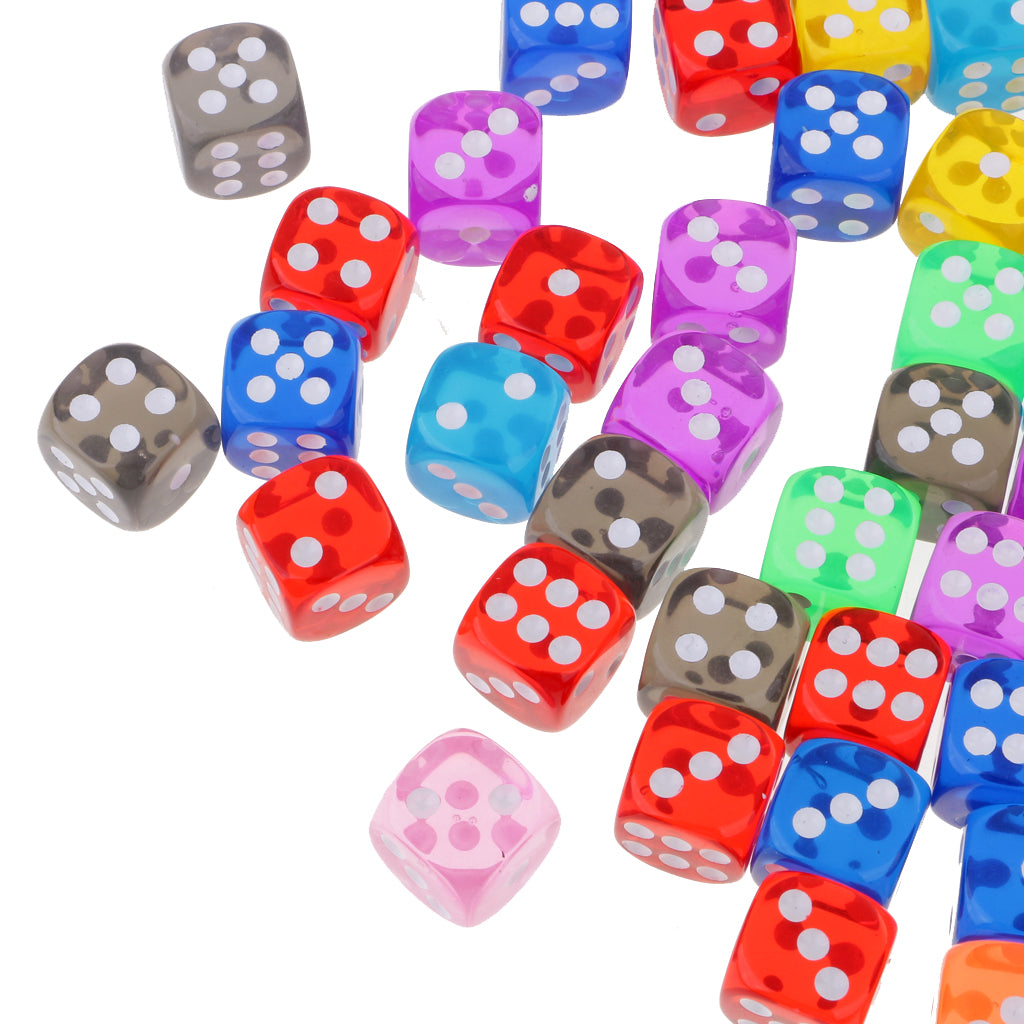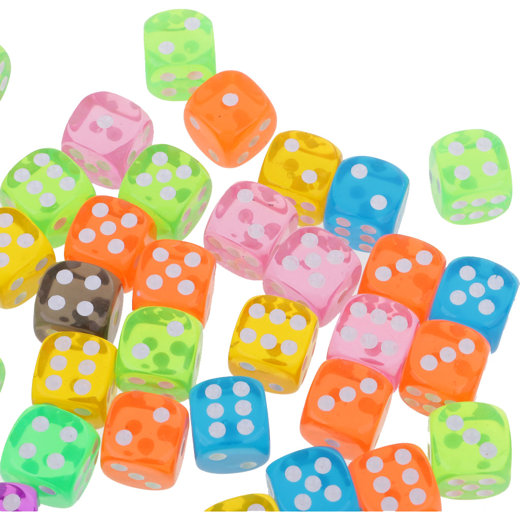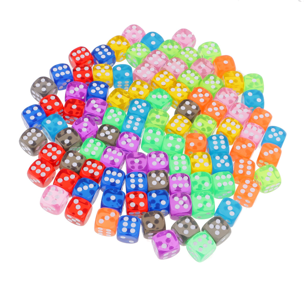 Pack of 100 16mm D6 multicolored transparent dice with beautiful carry bag, keeping you always portable with your dices.