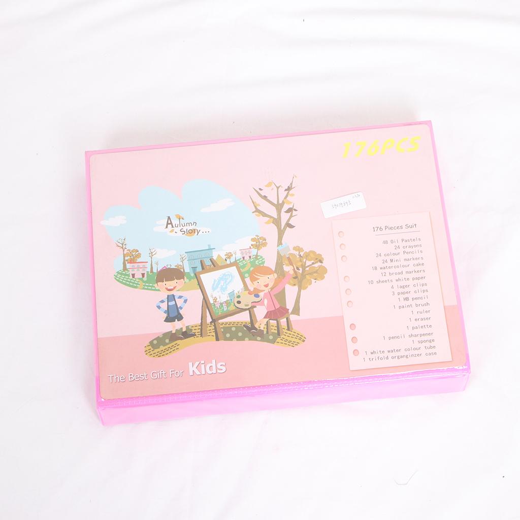 208 Pieces Wood Box Drawing Set Includes: 48 Oil Pastels, 24 Crayons, 24 Colour Pencils, 24 Mini Markers, 18 Watercolour cake, 12 Broad Markers, 10 Sheets White Paper, 4 Lager Clips, 3 Paper Clips, 1 HB Pencil, 1 Paint Brush, 1 Ruler, 1 Eraser, 1 Palette, 1 Pencil Sharpener, 1 Sponge, 1 White Water colour tube, 1 Trifol
