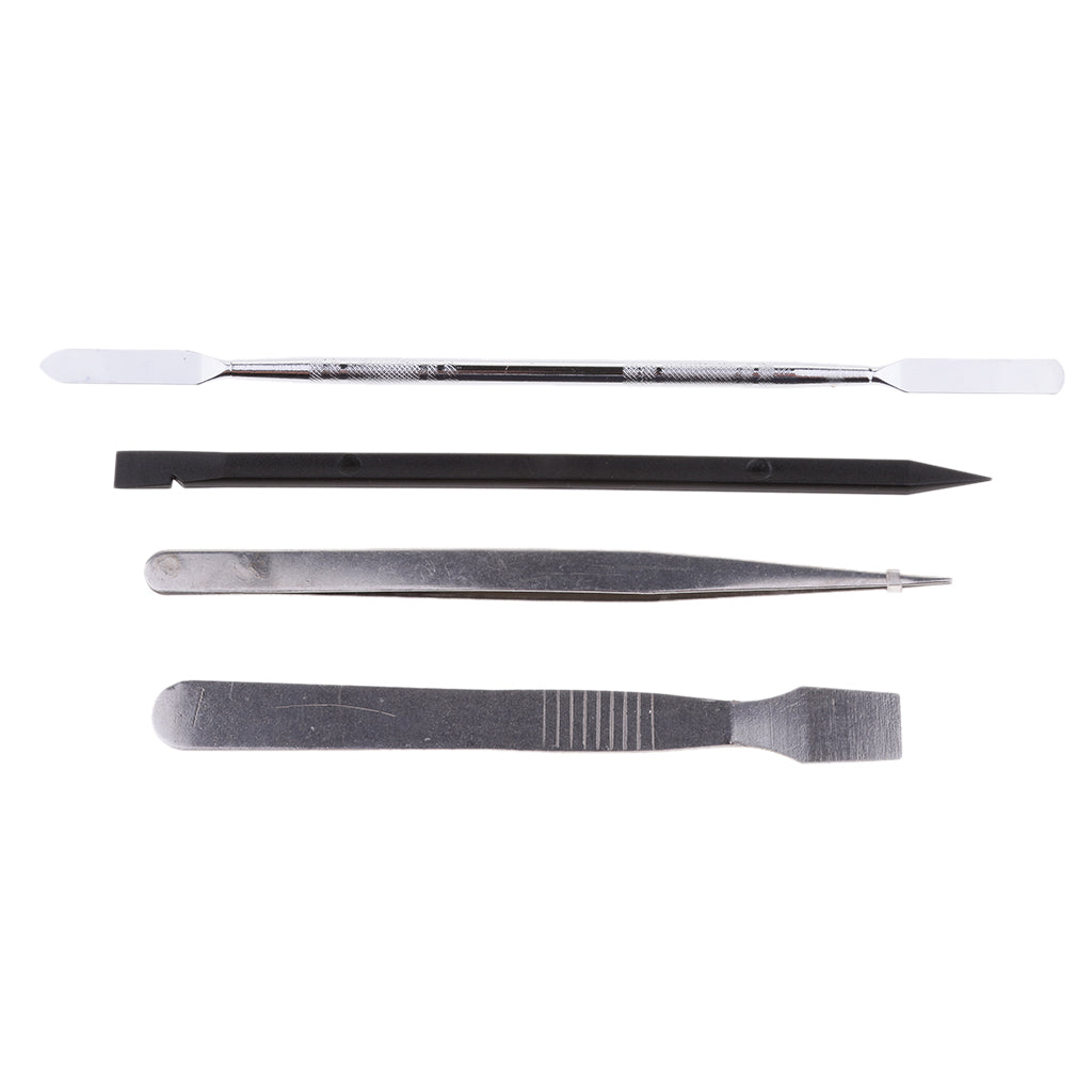 This screwdriver set in durable stainless steel tip and plastic handle with rubberized grip; anti-static tweezers and scrapers; hardened plastic pry bars and triangle paddles.