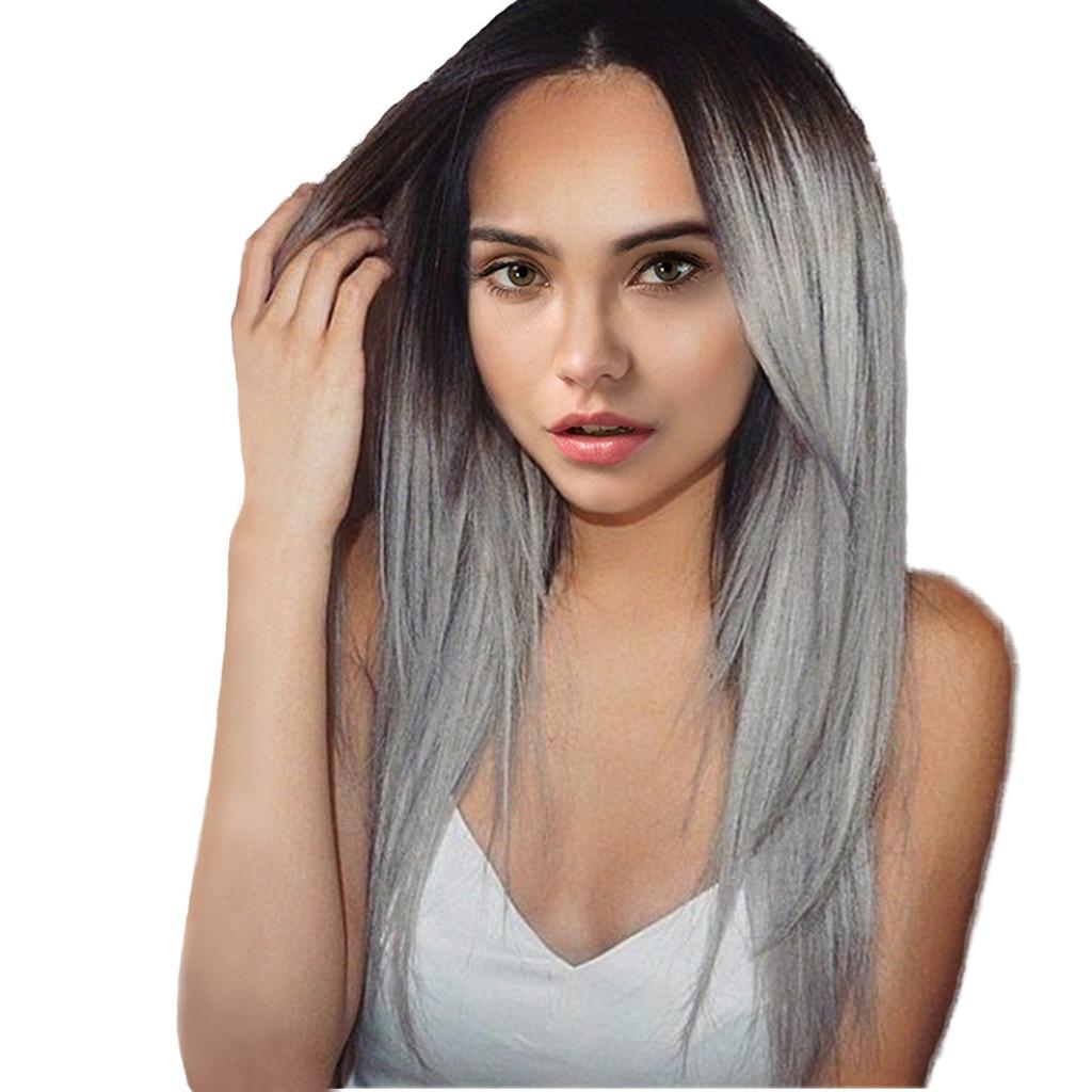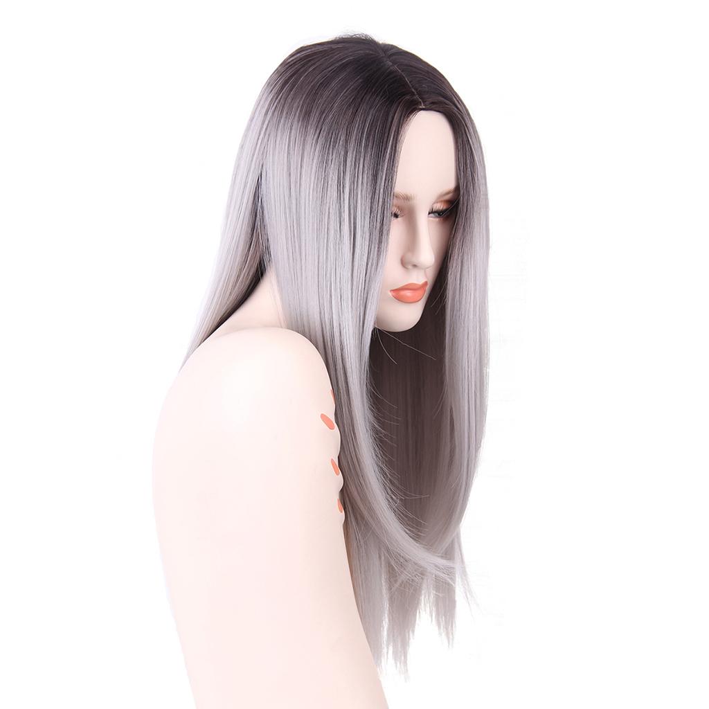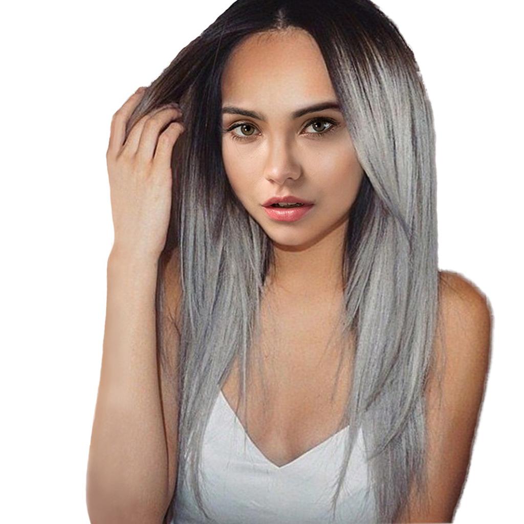 Gradient black grey long Straight wigs, stylish, fashionable and charming.