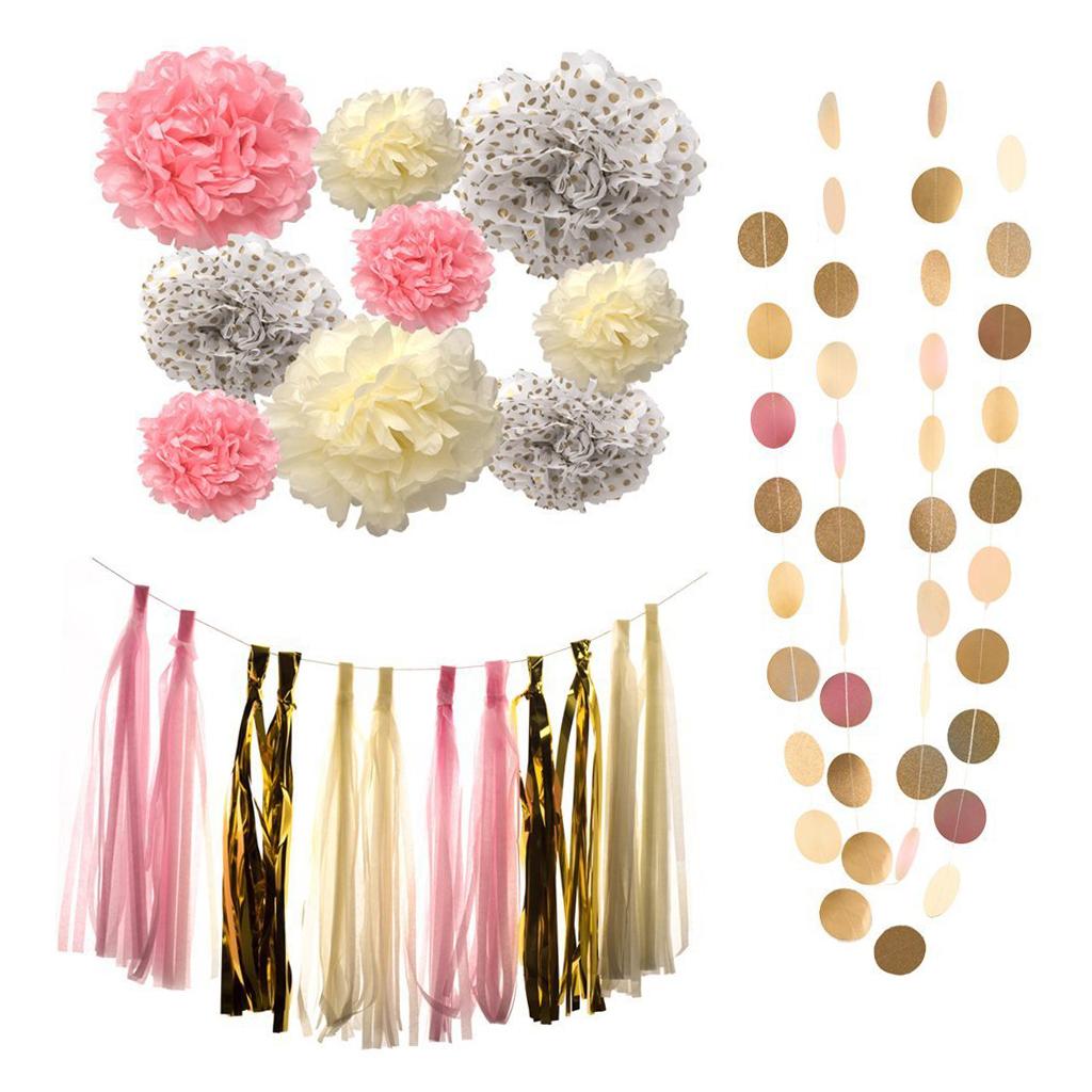 9 Pieces Tissue paper flowers have 2 sizes:3x12";6x10",and 12 Pieces tassel bunting,including 2 pieces polka dot paper garland