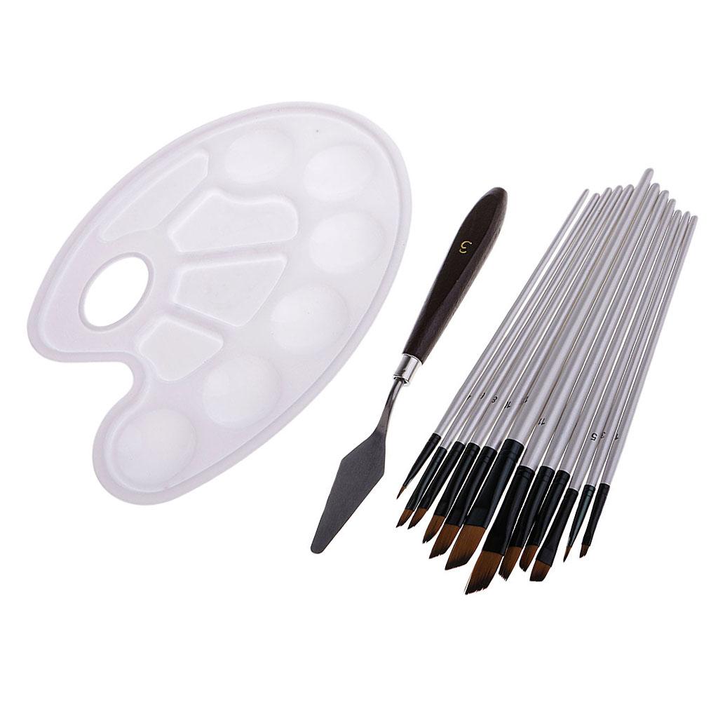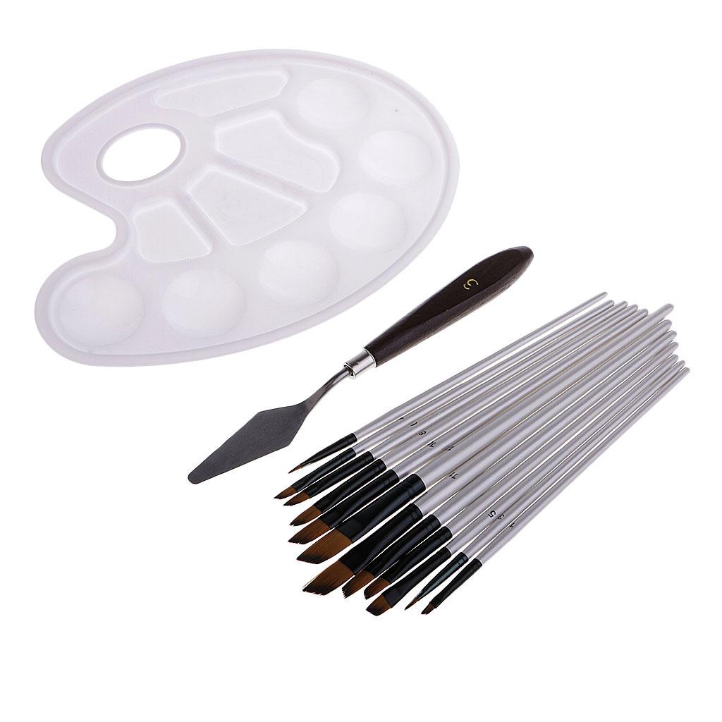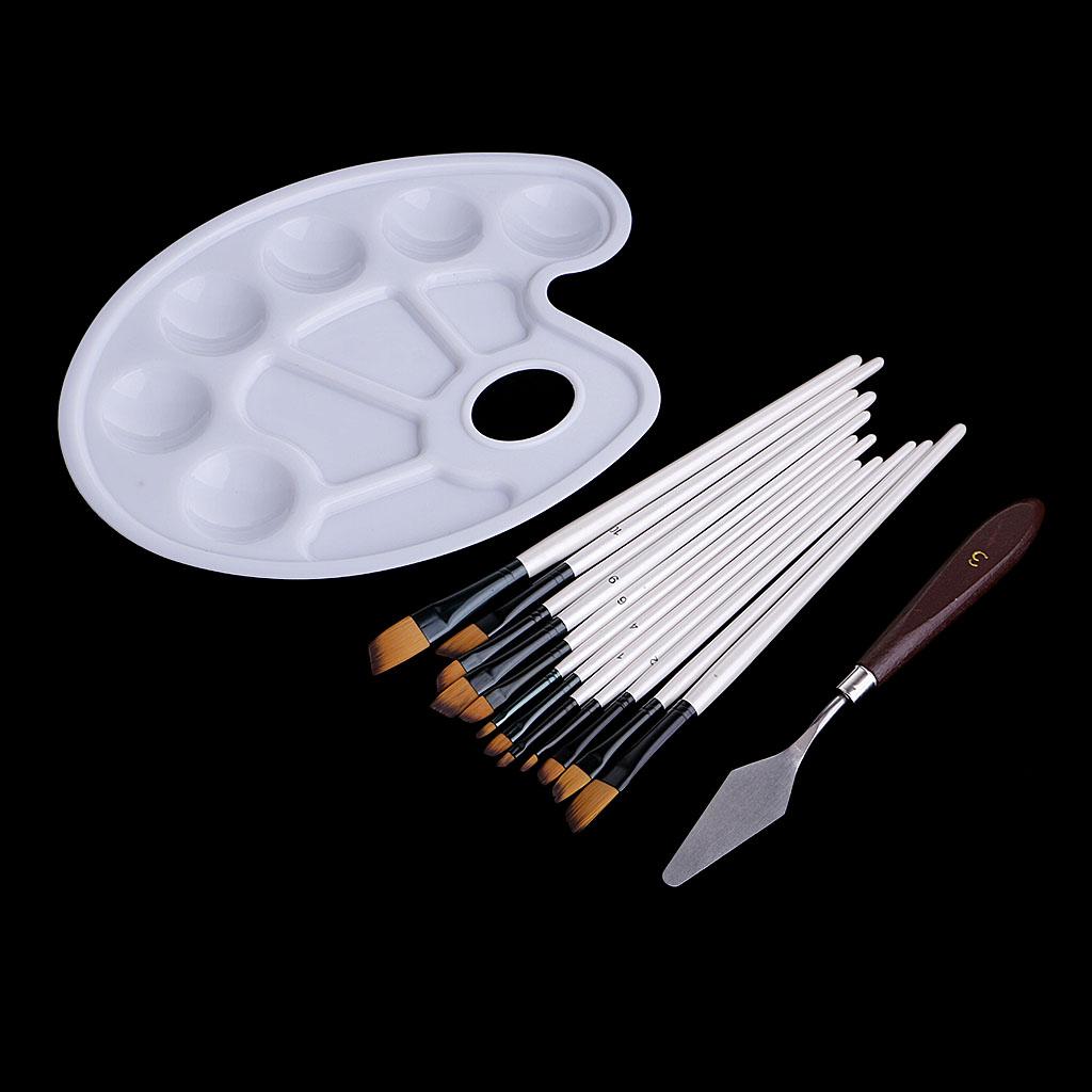 12 Pieces Art Acrylic Oil Watercolor Artist Paint Brushes With Palette and Color Mixing Cutter