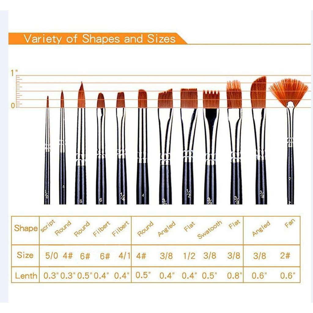 The brush set contains a variety of sizes and shapes: Wash, Flat, Angular, Filbert, Round, Liner and many other shapes;