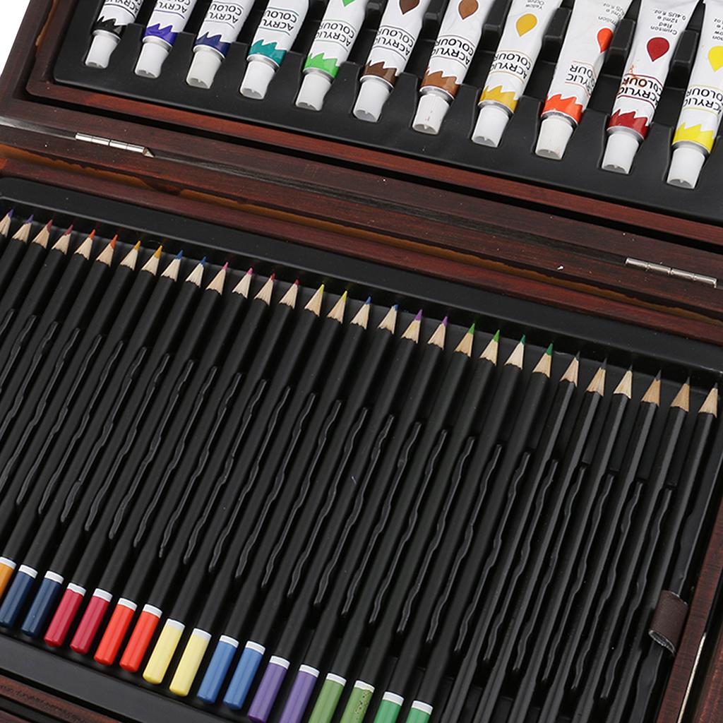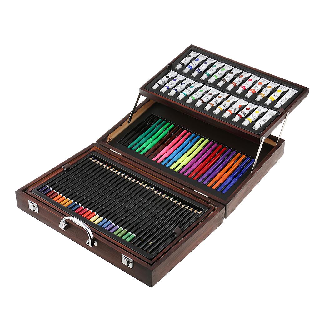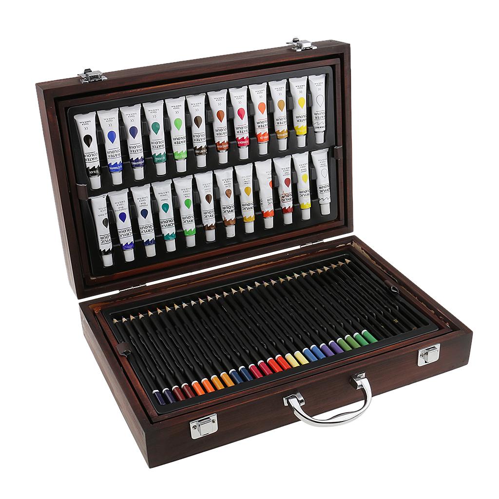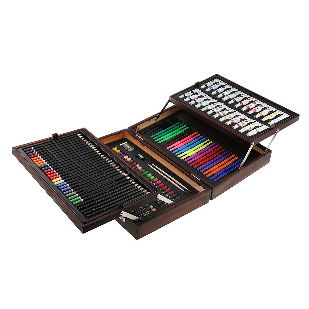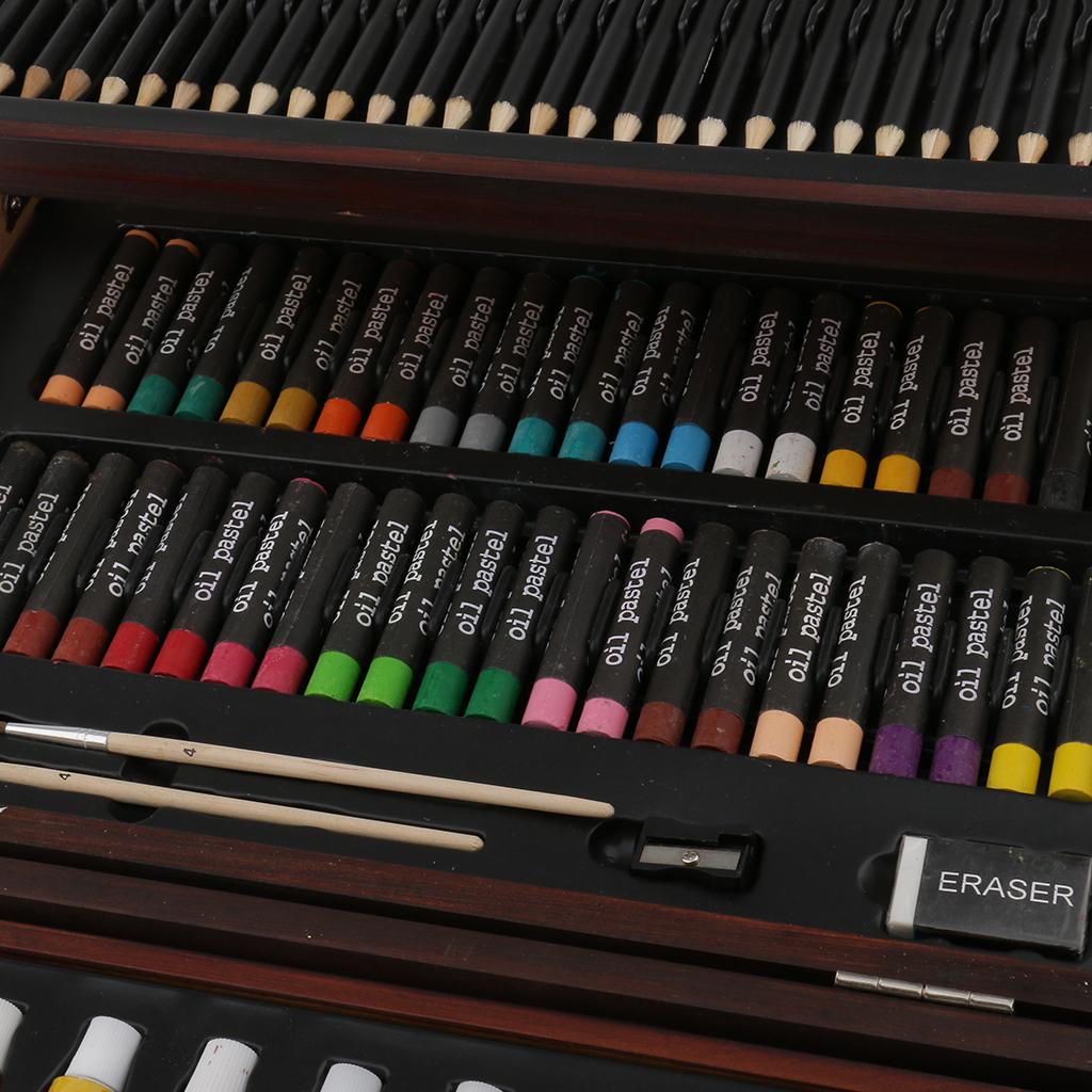 Quality wooden case,convertible and two-drawer designs,features a wide assortment of pencils, pastels, and paints