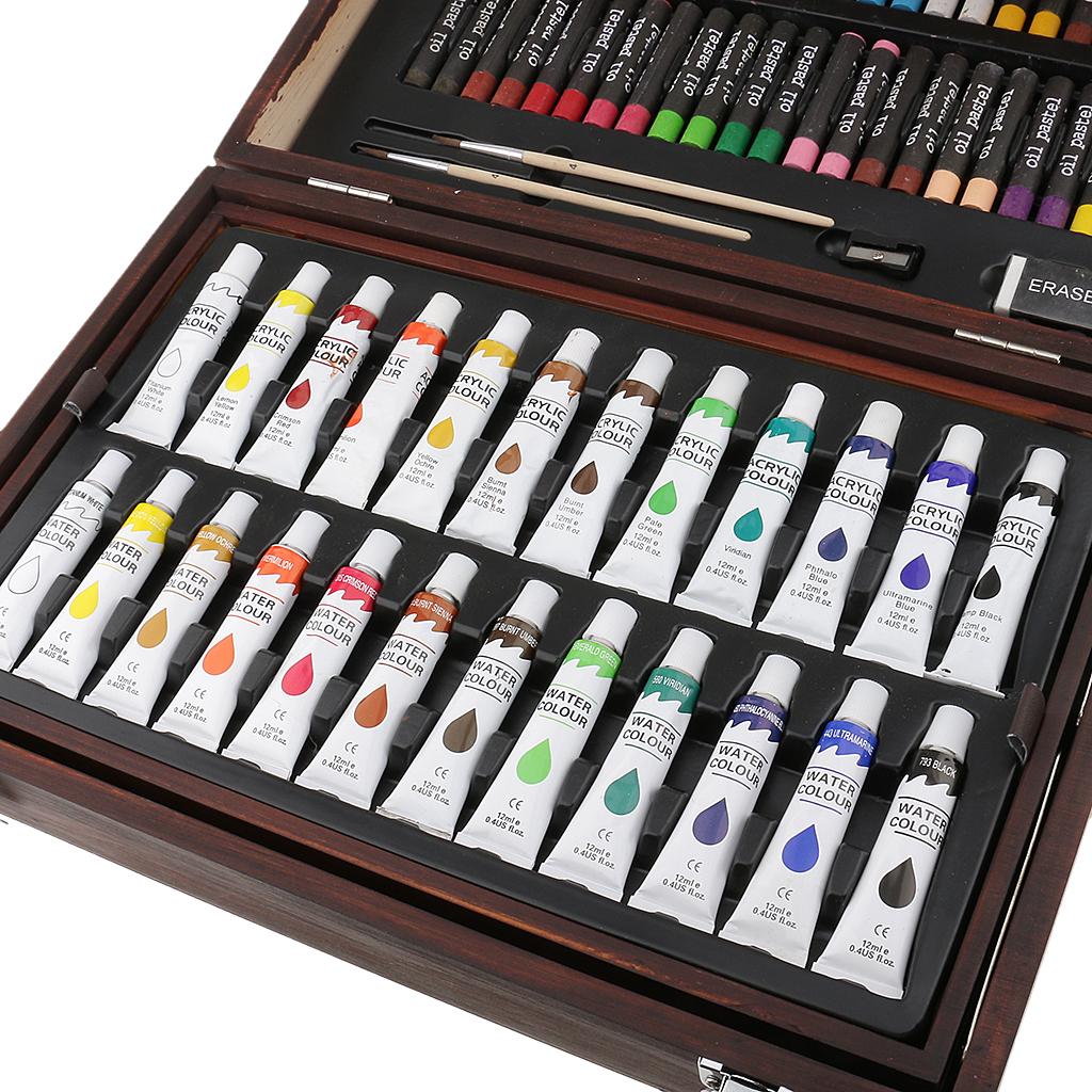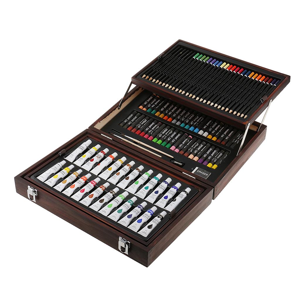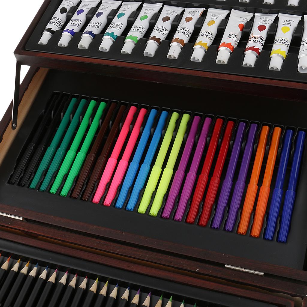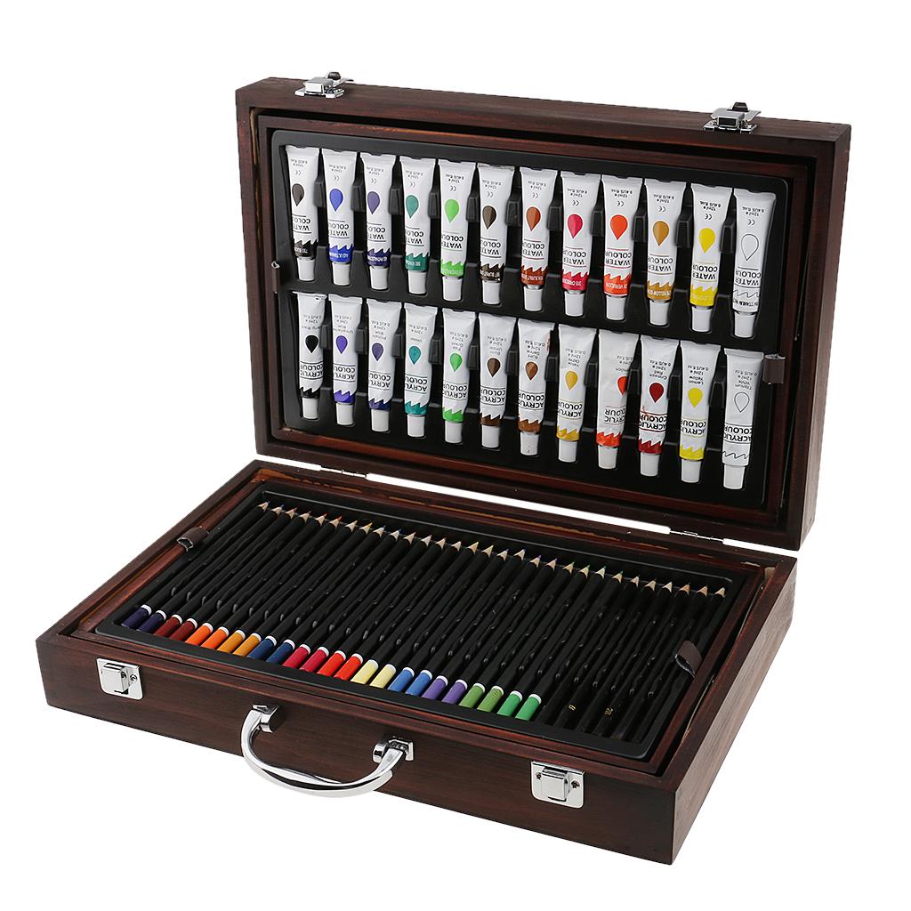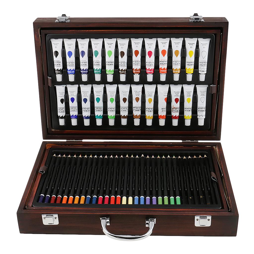 Quality wooden case,convertible and two-drawer designs,features a wide assortment of pencils, pastels, and paints