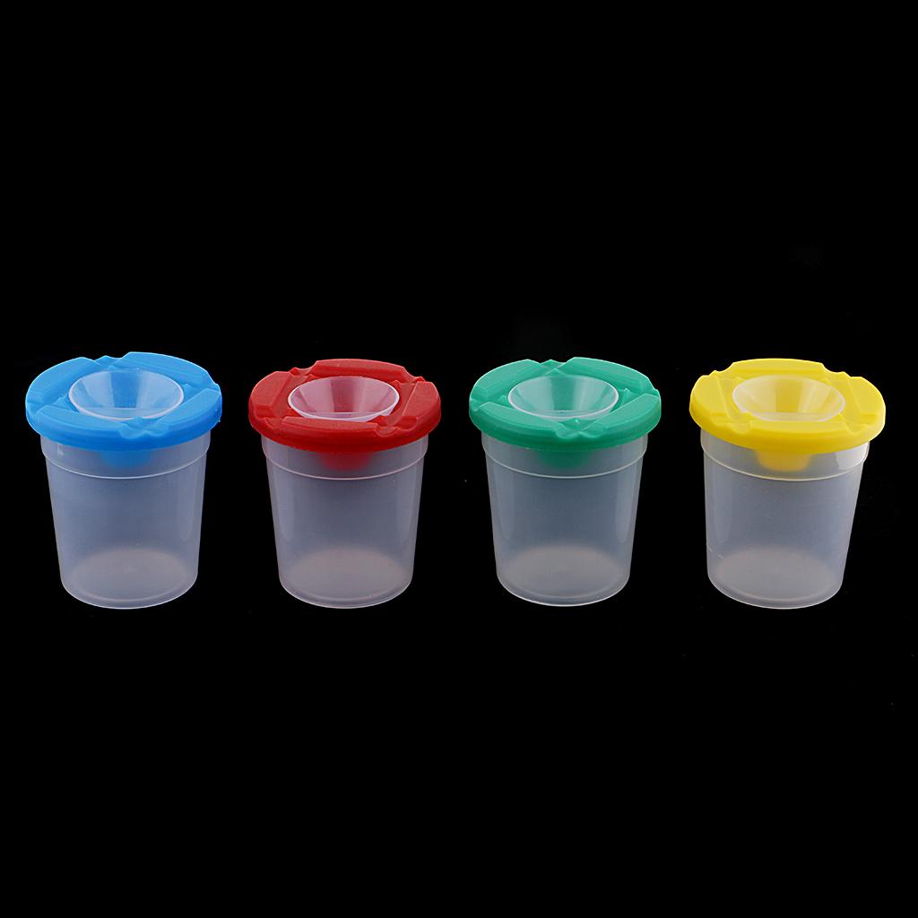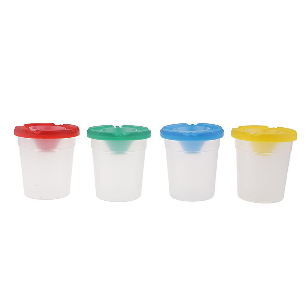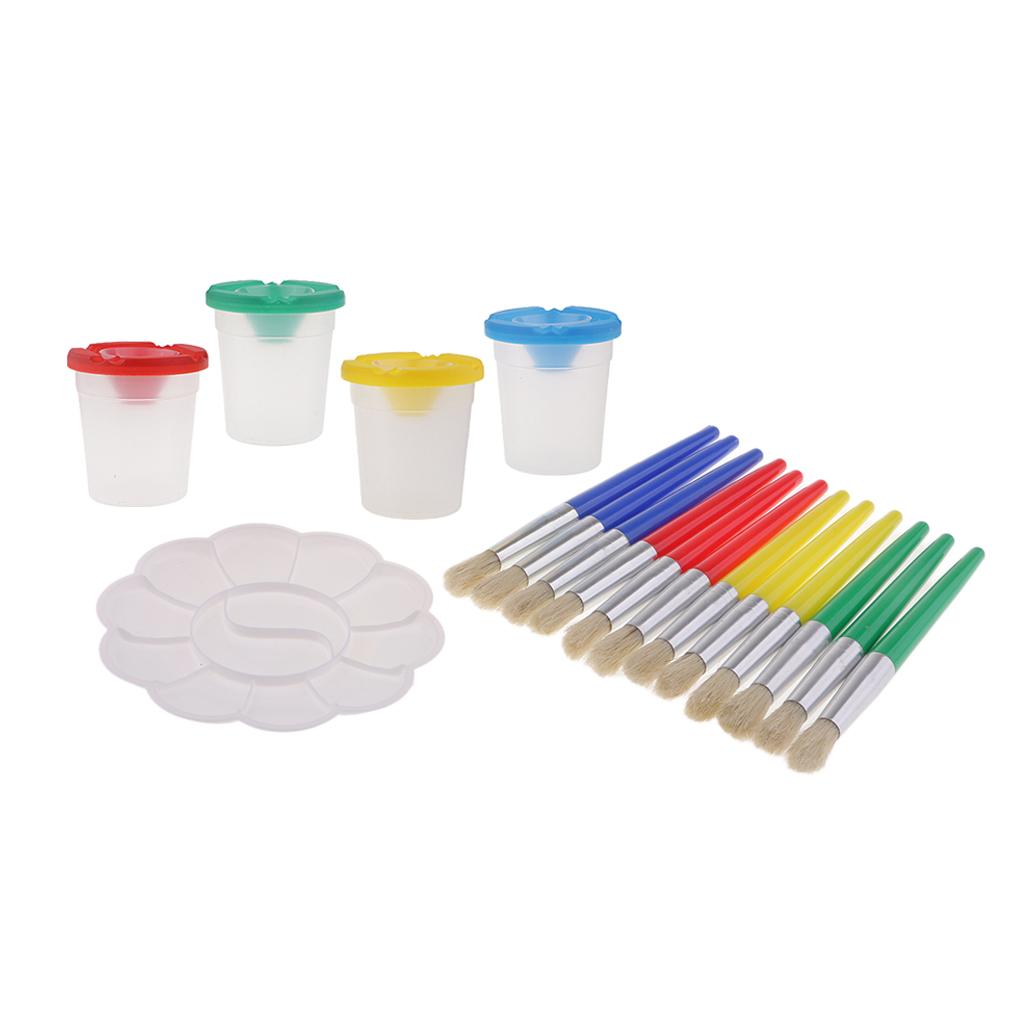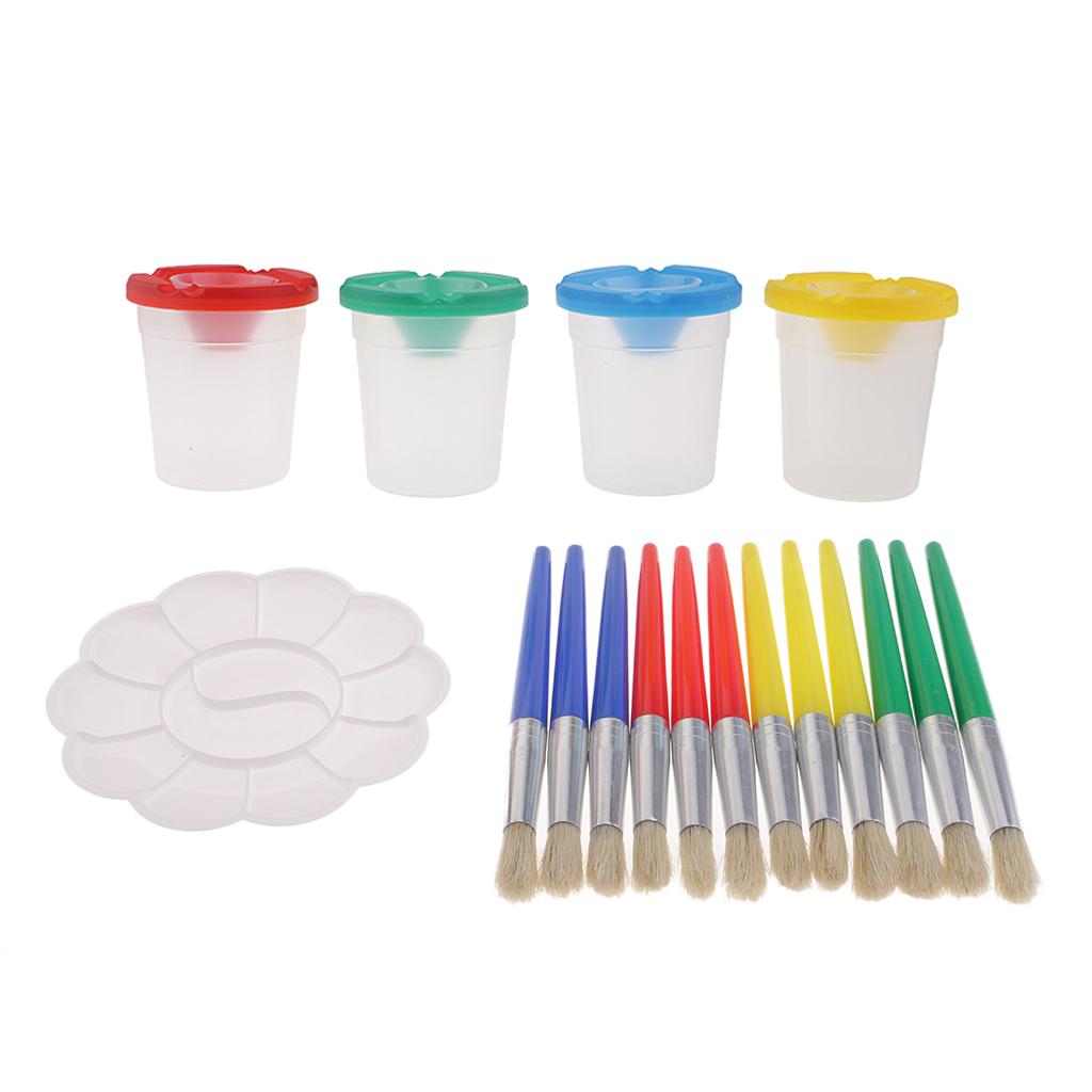 Art Supply 4 Piece Children No Spill Paint Cups with Colored Lids and 12 Piece Large Round Brush Set with Plastic Handles and Palette
