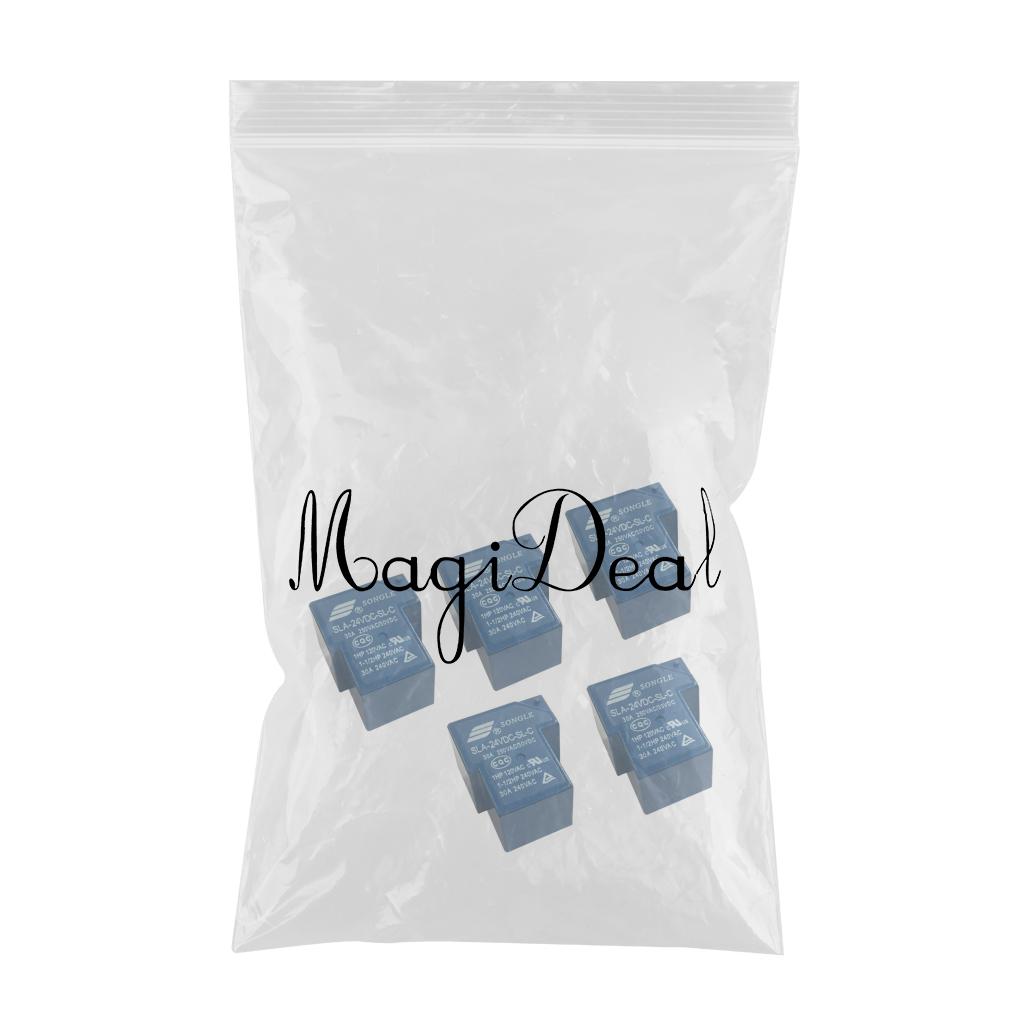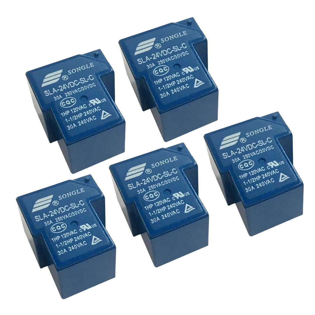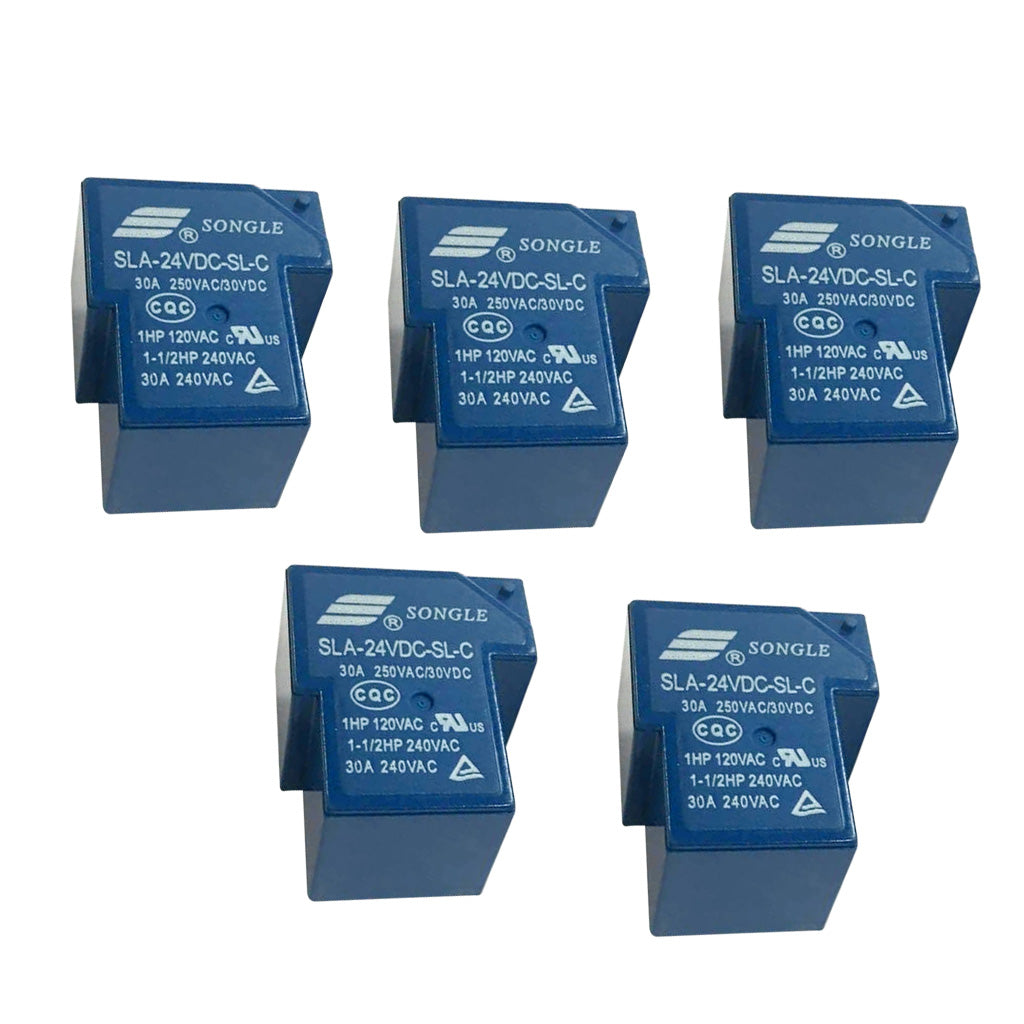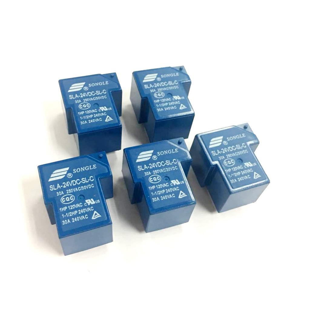 Songle power relays with a coil rated voltage of 24V DC and SPDT contacts with a 30A rating.