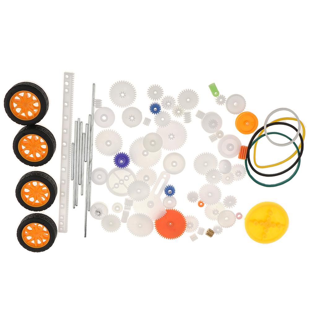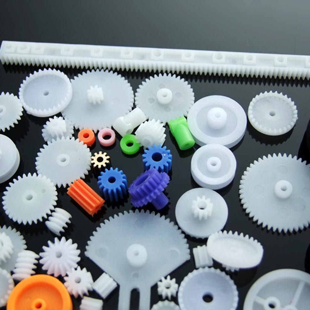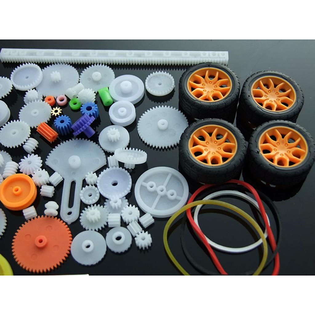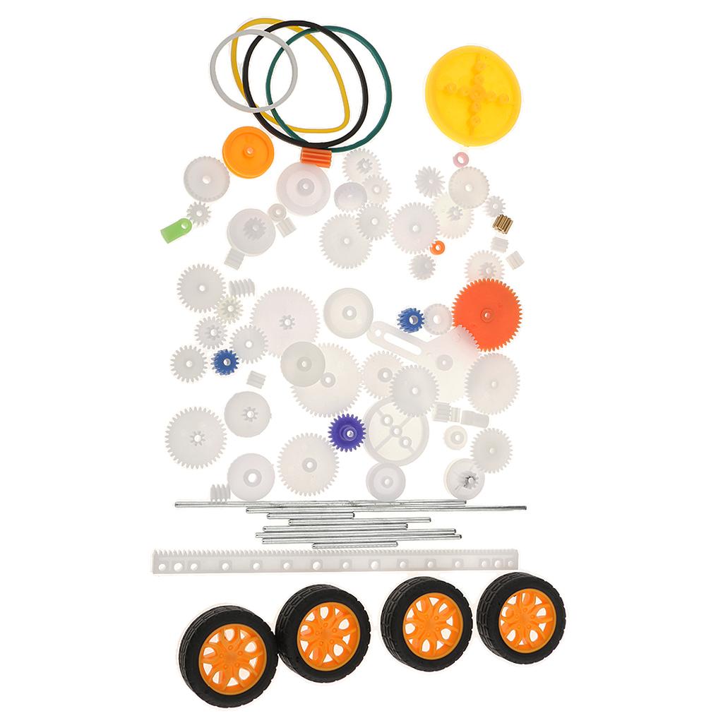 the most complete gear set, includes 78 kinds of gear parts,spindle gear,crown gear,single gear,double gear,worn gear,bevel gear,belt pulley,belt,axle sleeve,rack,tire. It can meet your DIY needs
