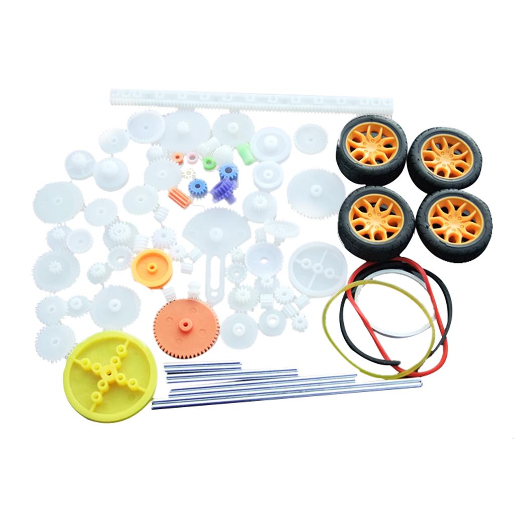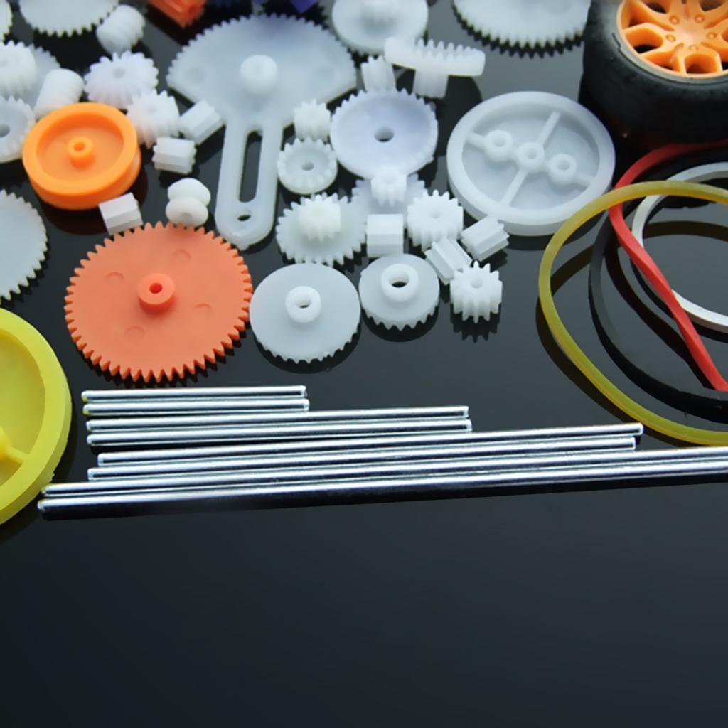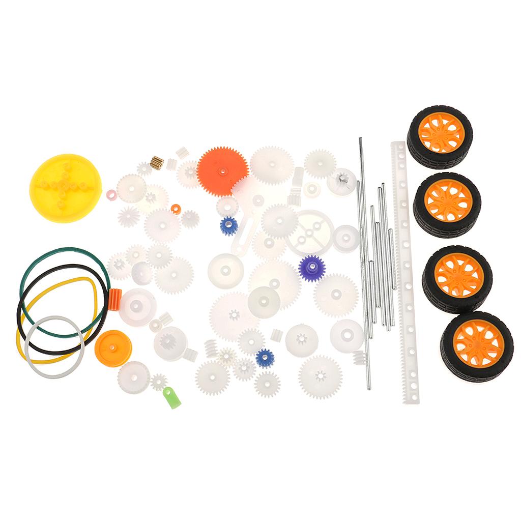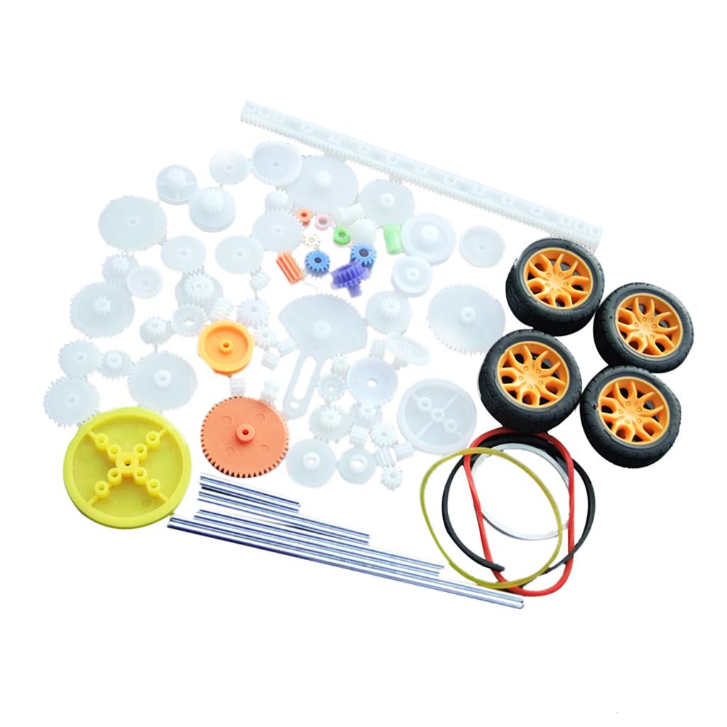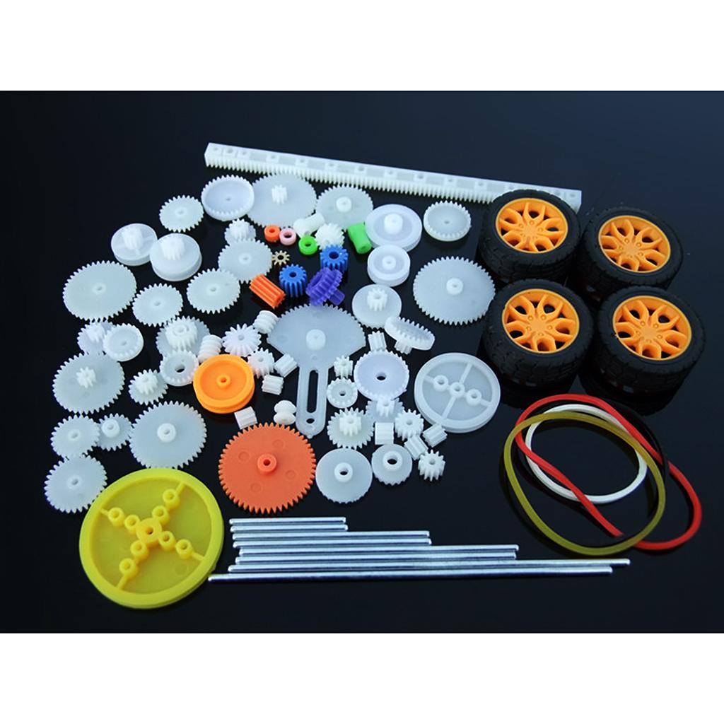 the most complete gear set, includes 78 kinds of gear parts,spindle gear,crown gear,single gear,double gear,worn gear,bevel gear,belt pulley,belt,axle sleeve,rack,tire. It can meet your DIY needs