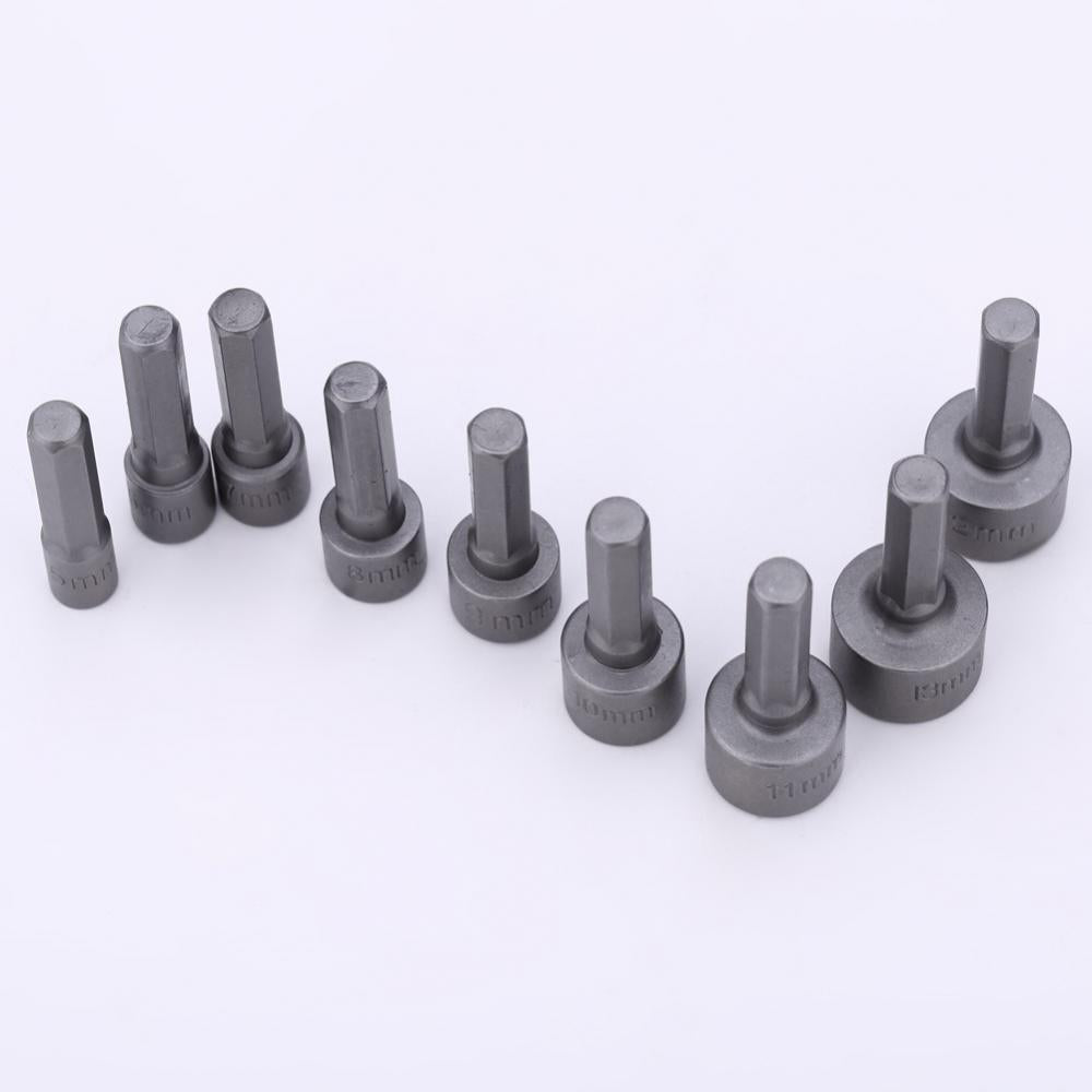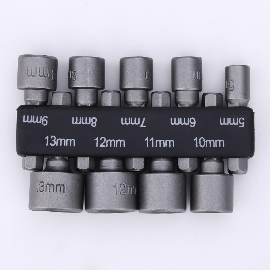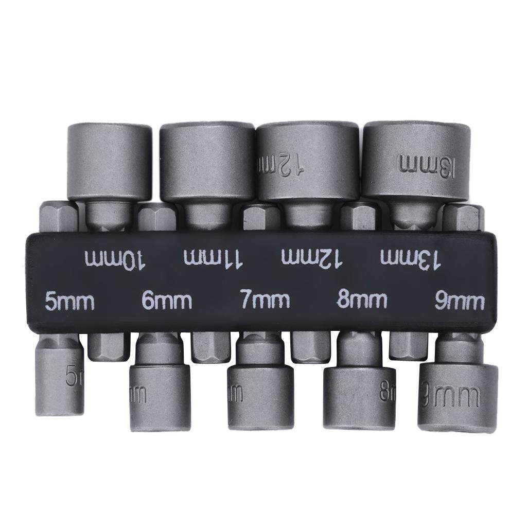 9-Piece metric hex bit socket set 1/4" drive includes: 5mm, 6mm, 7mm, 8mm, 9mm, 10mm, 11mm, 12mm, 13mm.