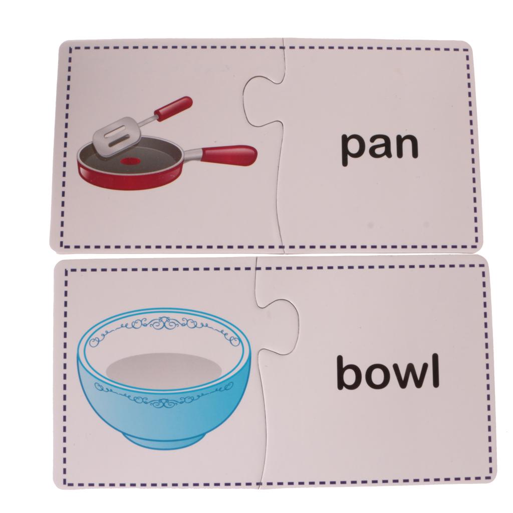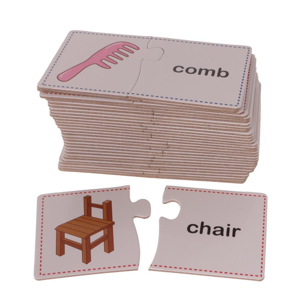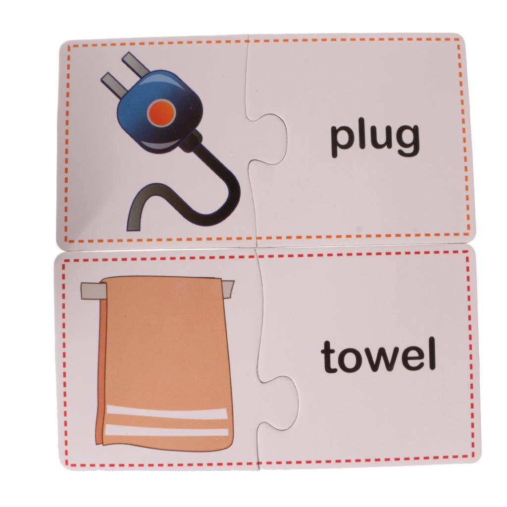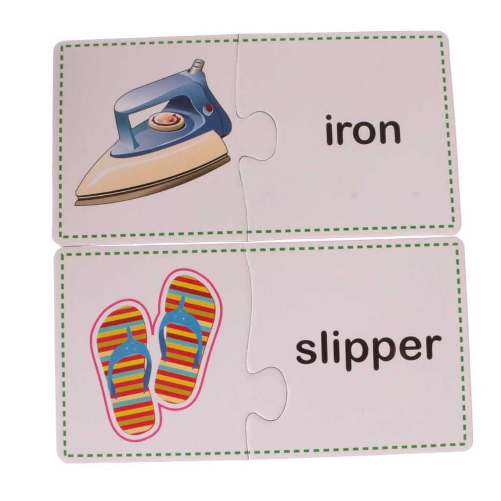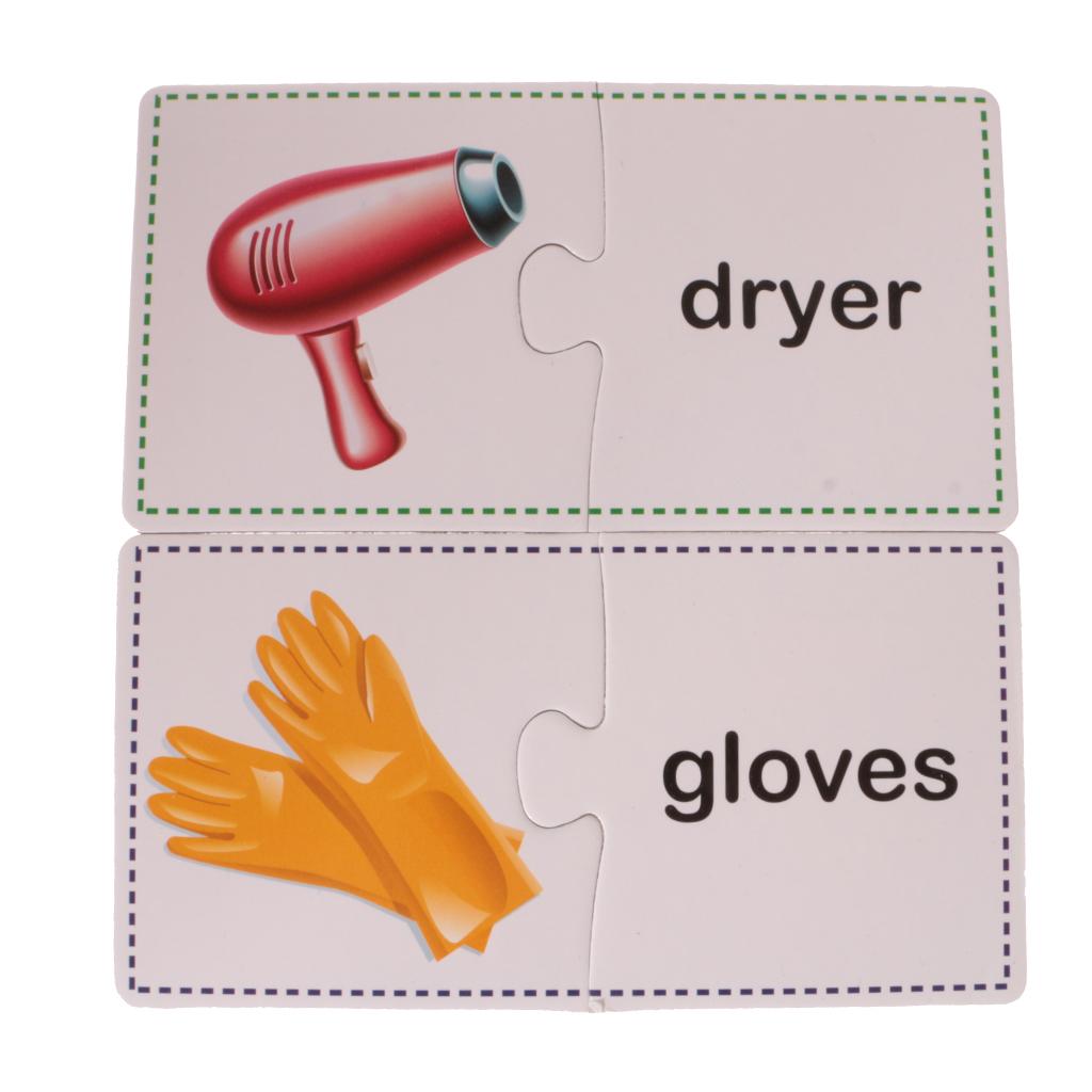 Puzzles contain 60 Pieces, 30 Sets. Including Chair, comb, mirror, plug, towel, laptop, stapler, fax machine, lipstick, umbrella, lock, knife, cup, light bulb, bucket, alarm clock, fan, slippers, gloves, Fridge, bowl, fork, pan, phone, table, brush images.
