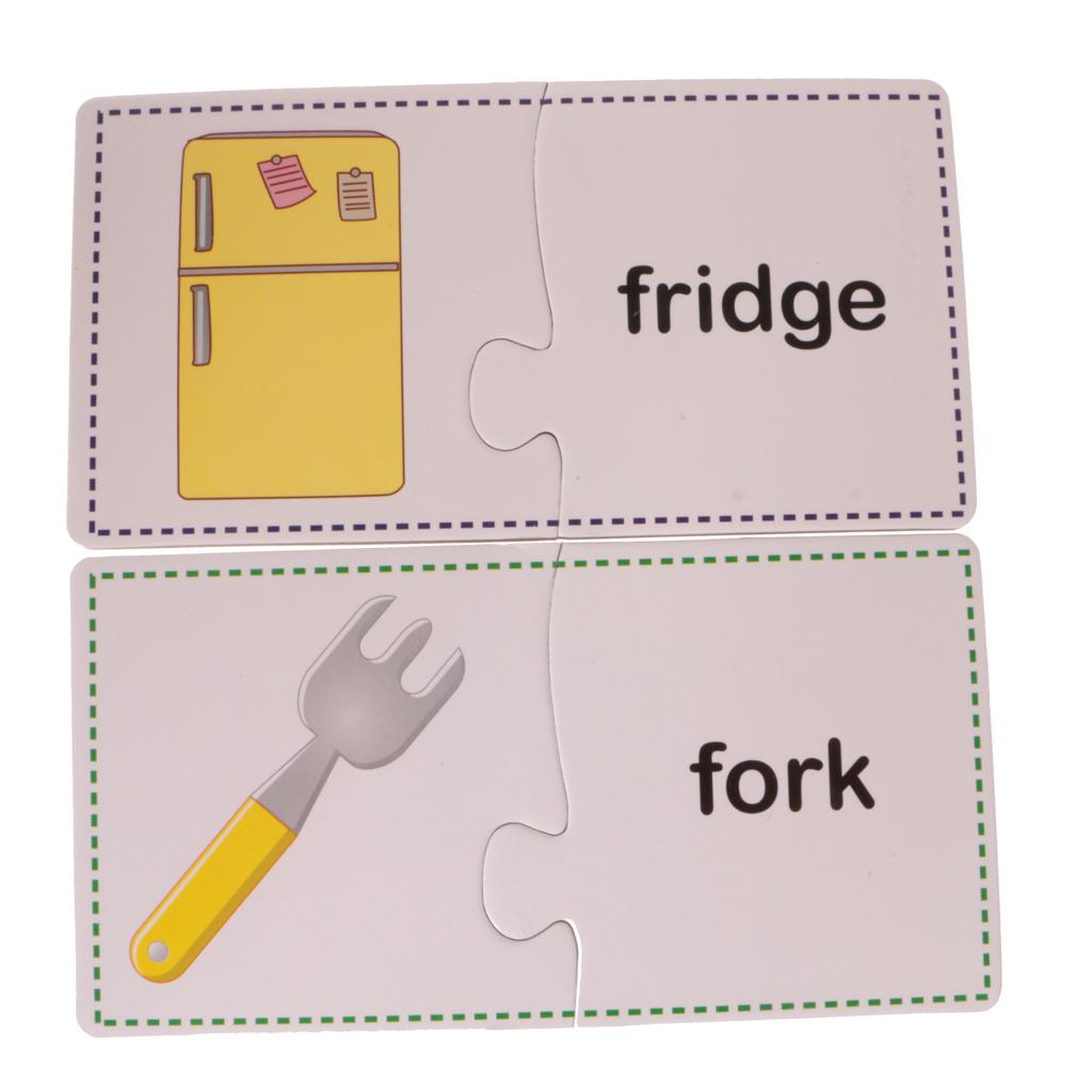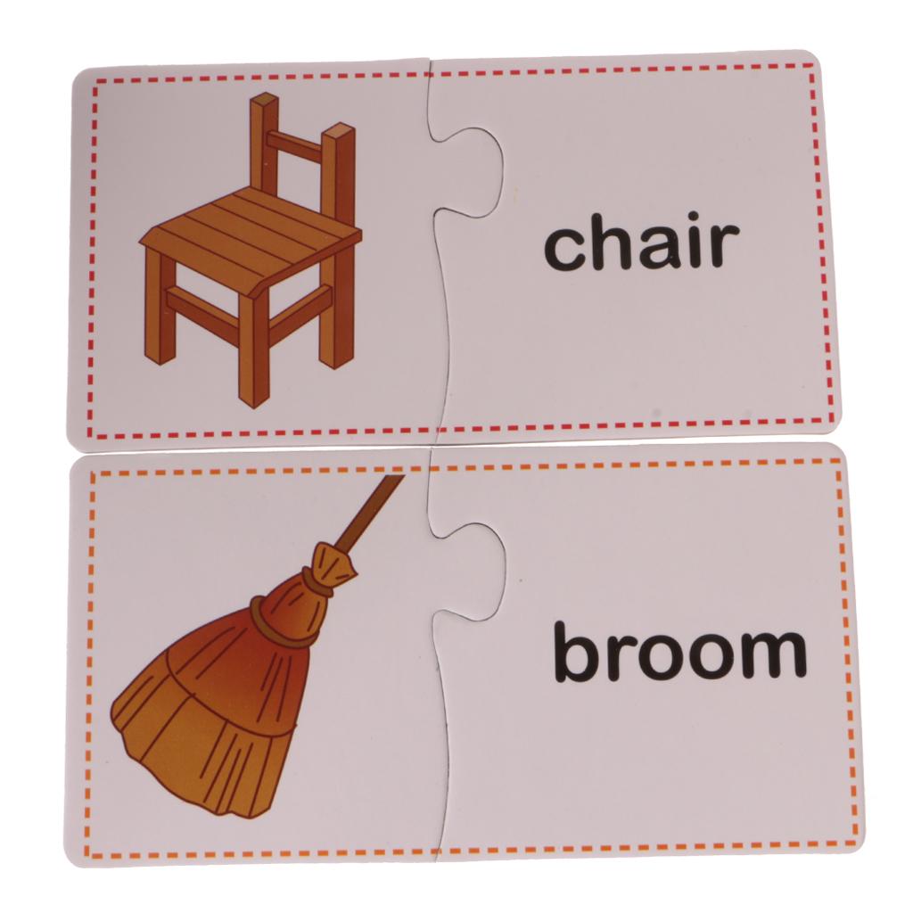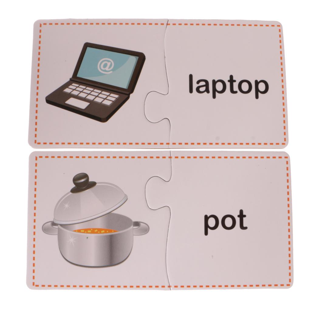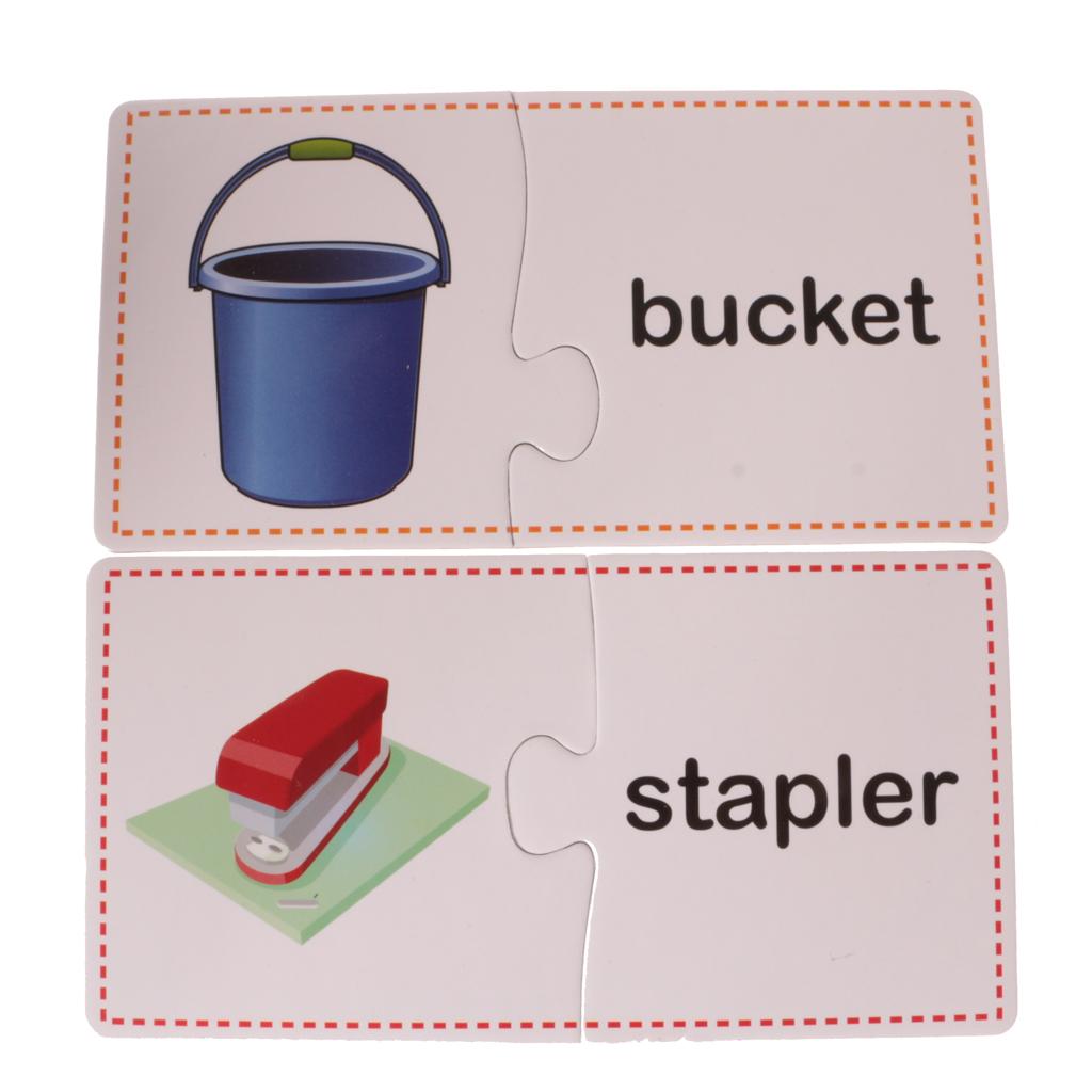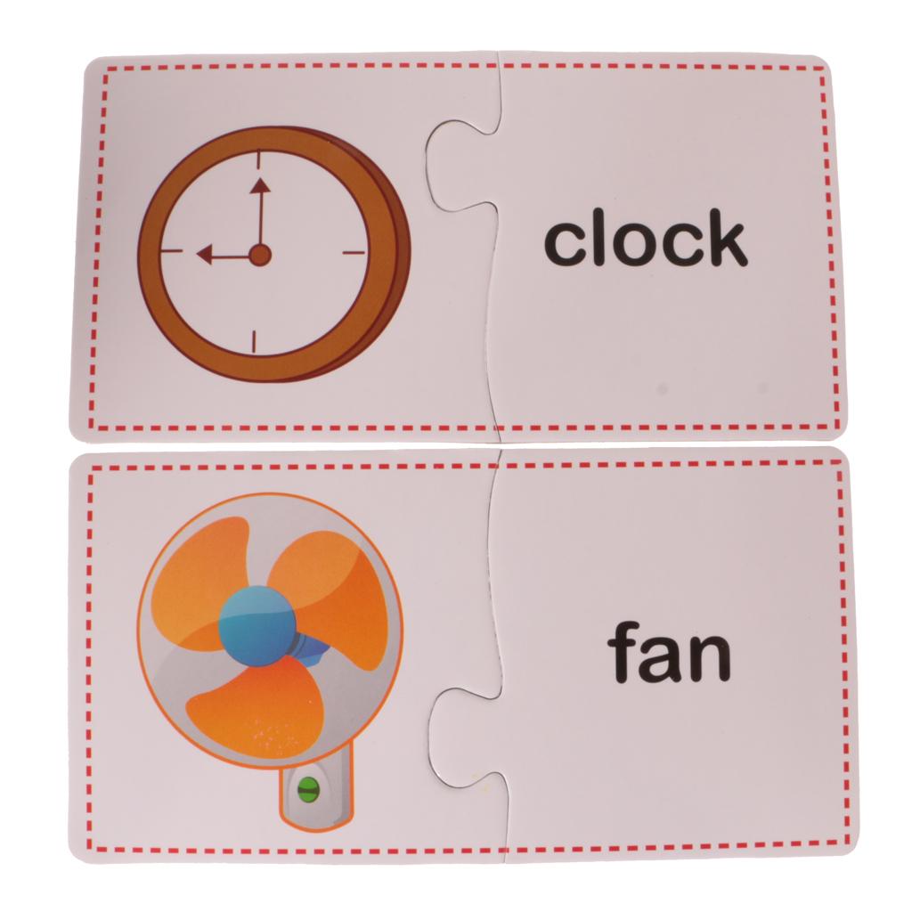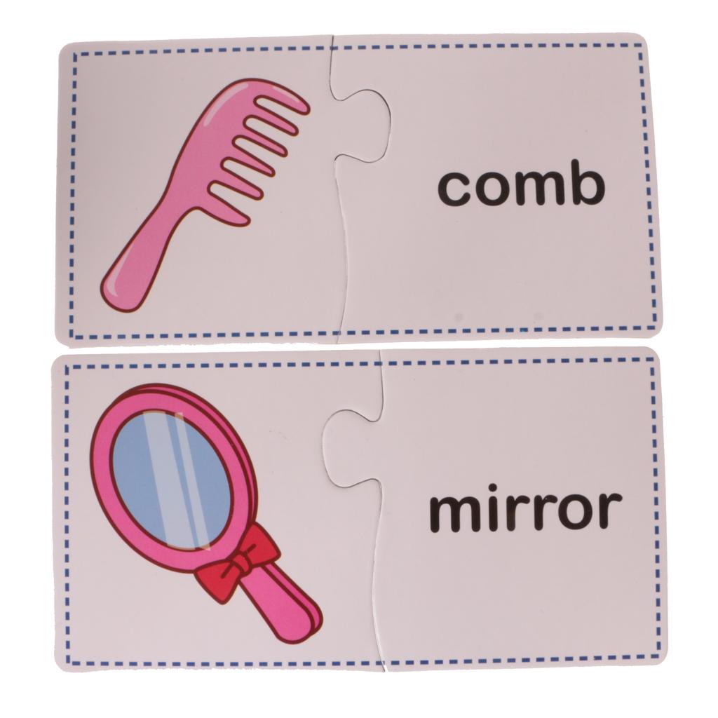 Puzzles contain 60 Pieces, 30 Sets. Including Chair, comb, mirror, plug, towel, laptop, stapler, fax machine, lipstick, umbrella, lock, knife, cup, light bulb, bucket, alarm clock, fan, slippers, gloves, Fridge, bowl, fork, pan, phone, table, brush images.