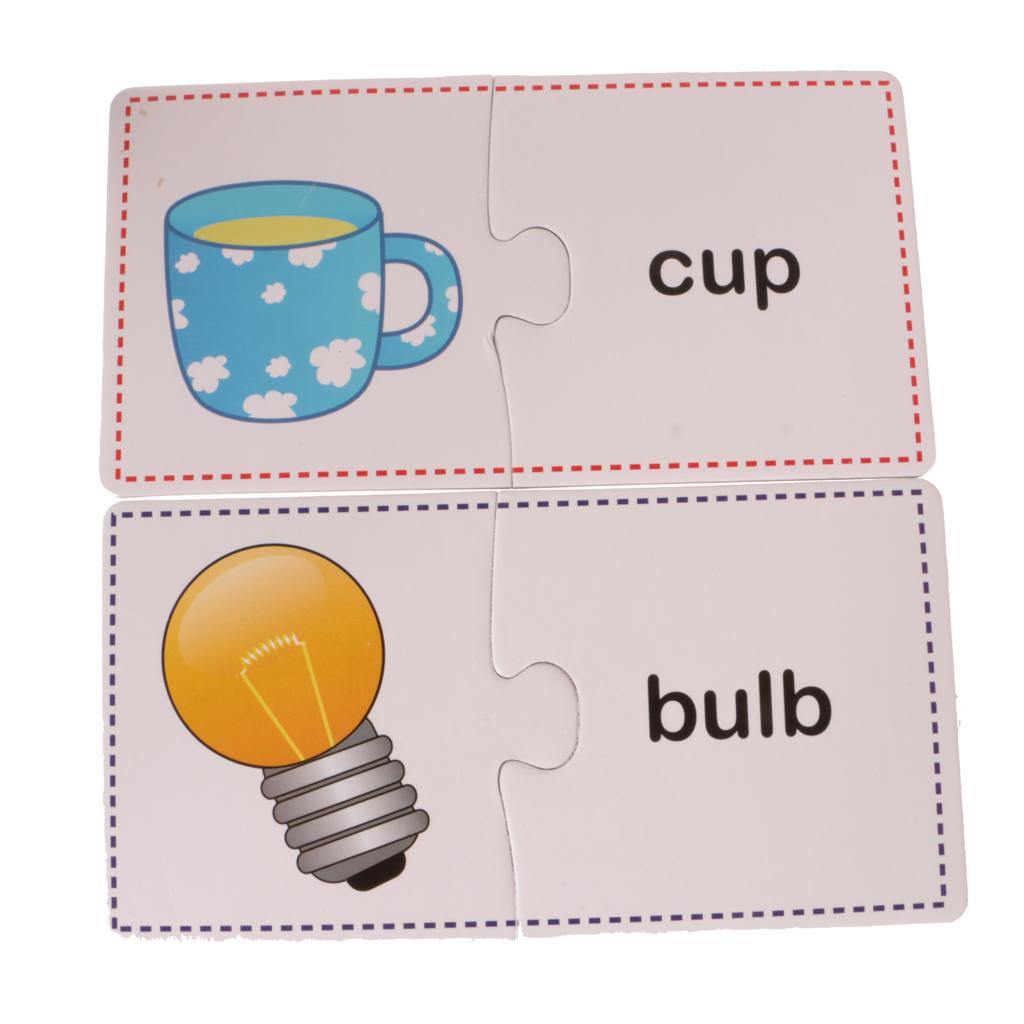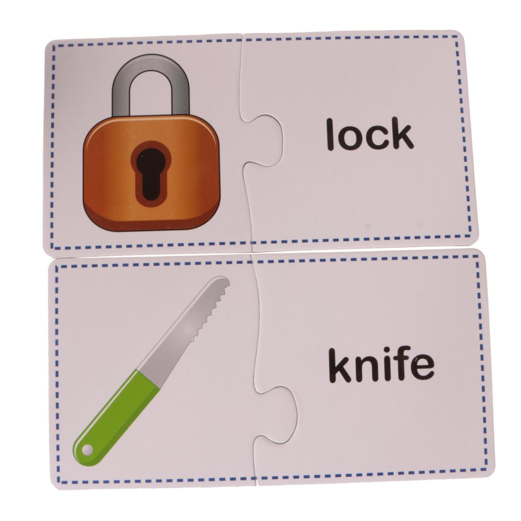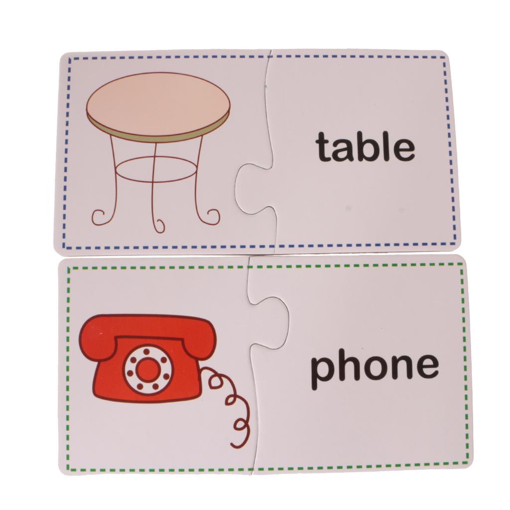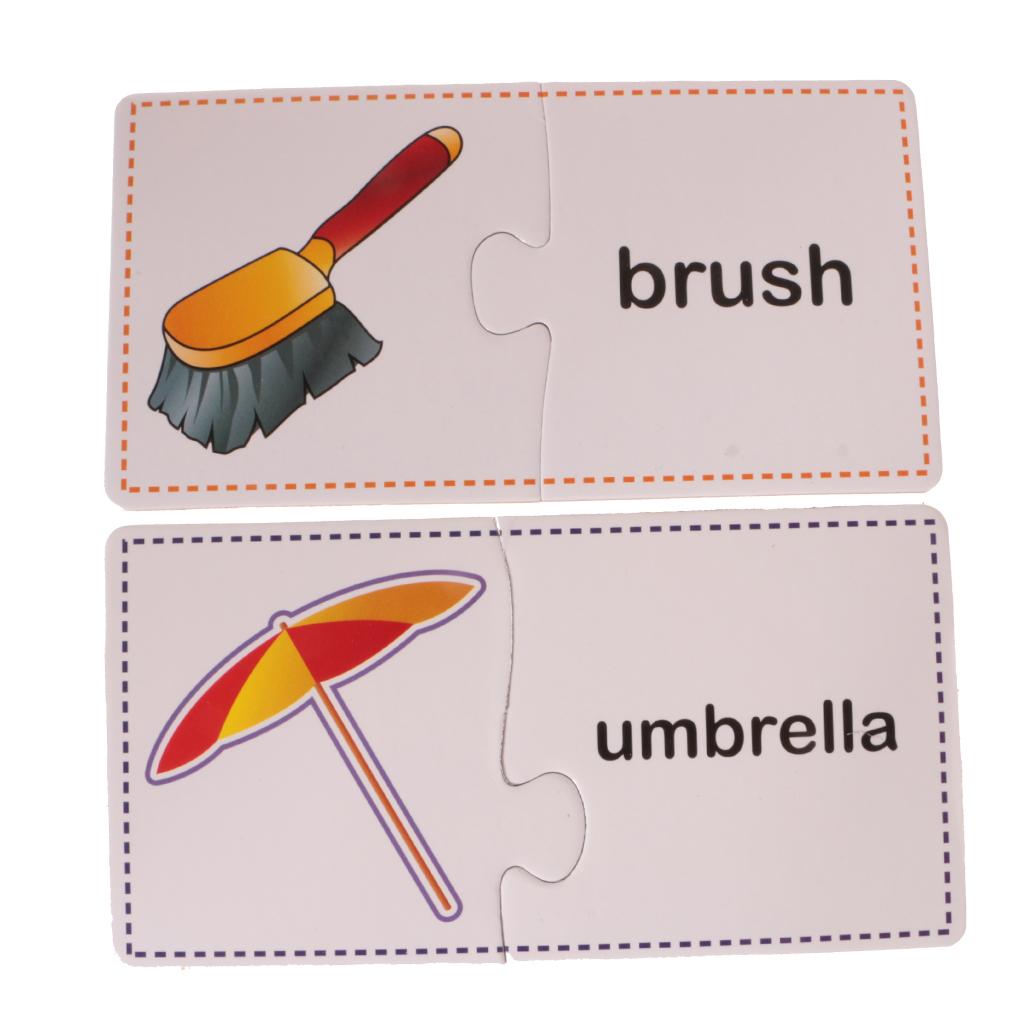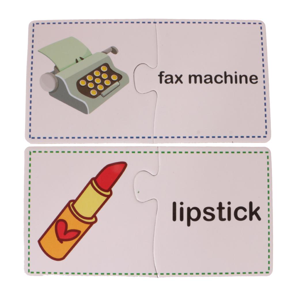 Puzzles contain 60 Pieces, 30 Sets. Including Chair, comb, mirror, plug, towel, laptop, stapler, fax machine, lipstick, umbrella, lock, knife, cup, light bulb, bucket, alarm clock, fan, slippers, gloves, Fridge, bowl, fork, pan, phone, table, brush images.