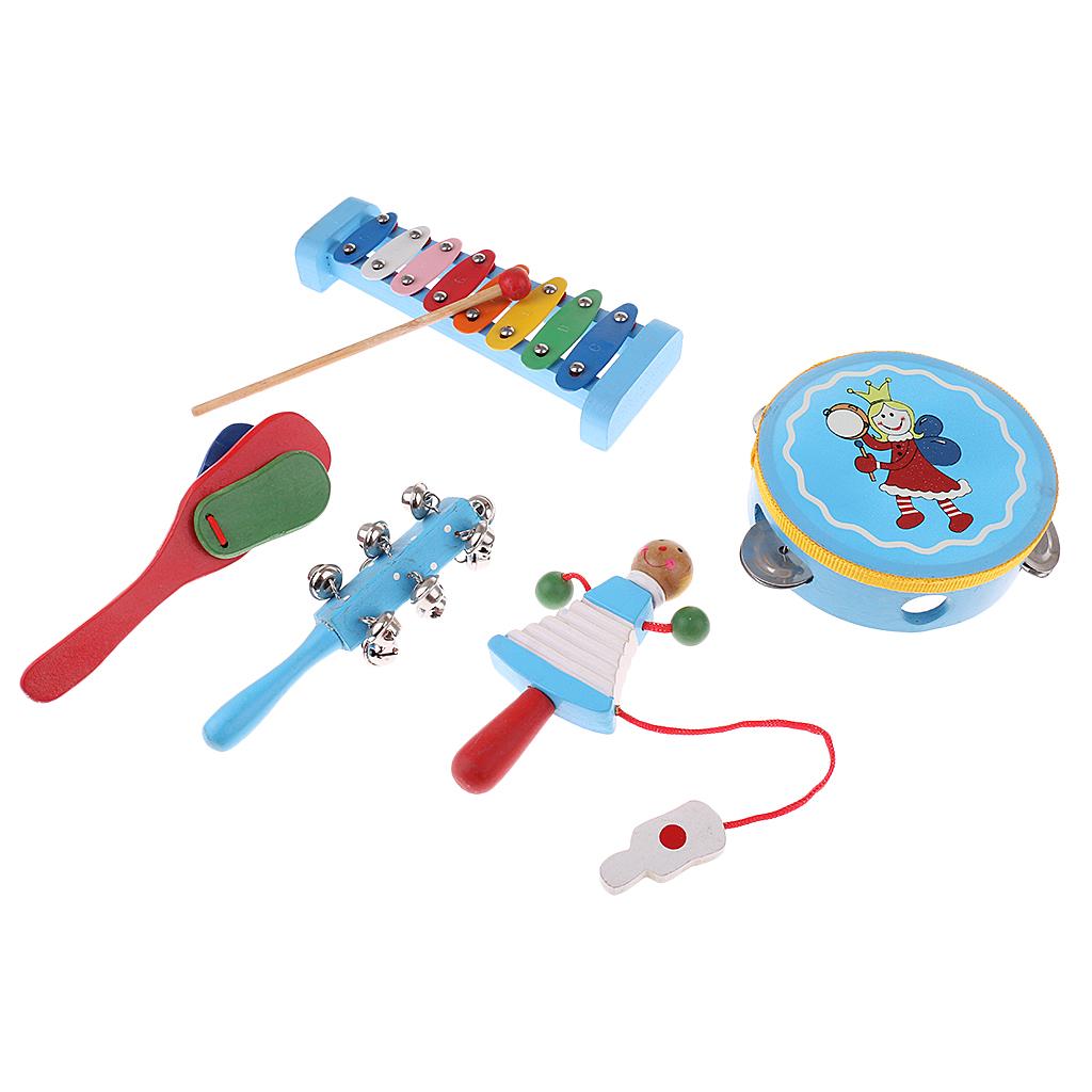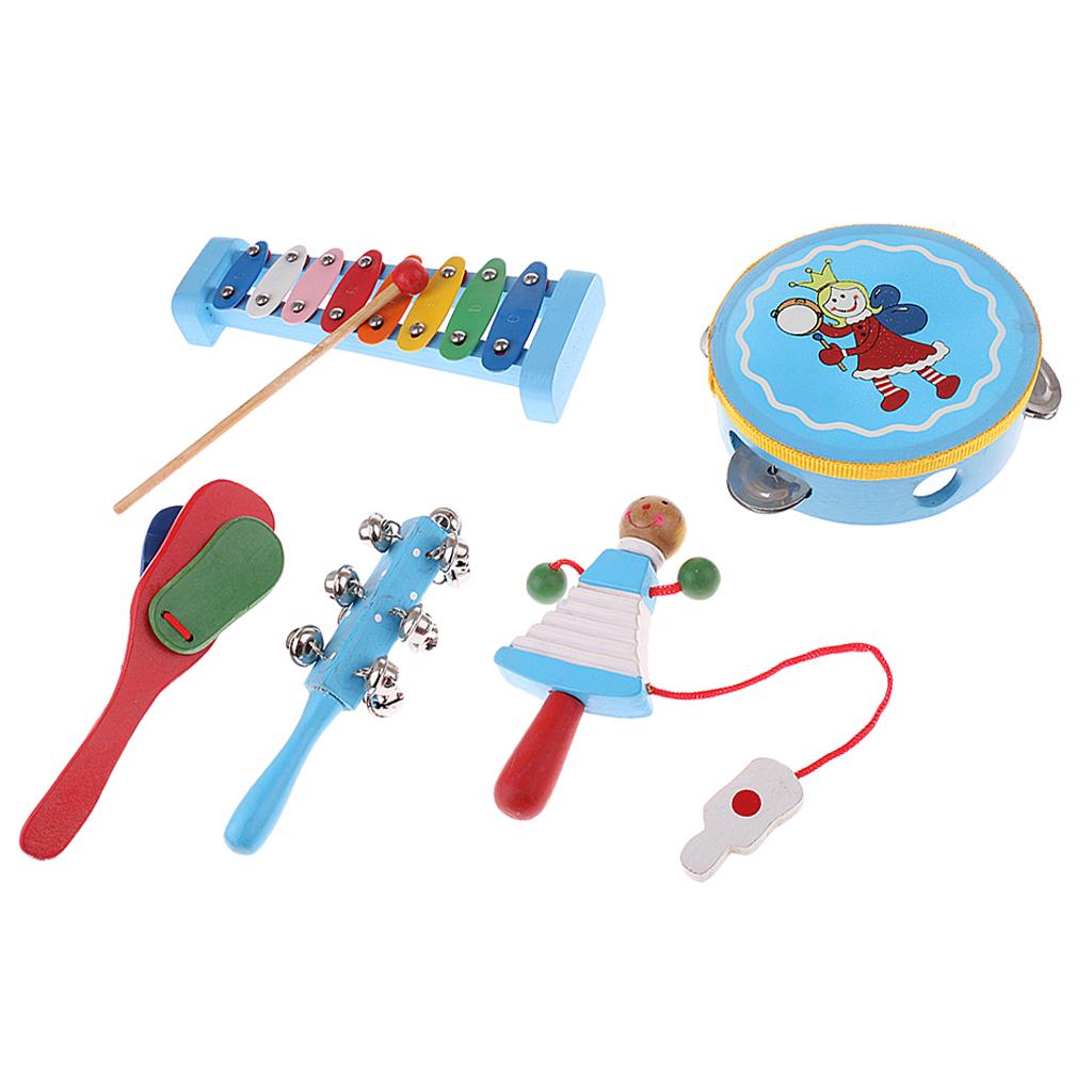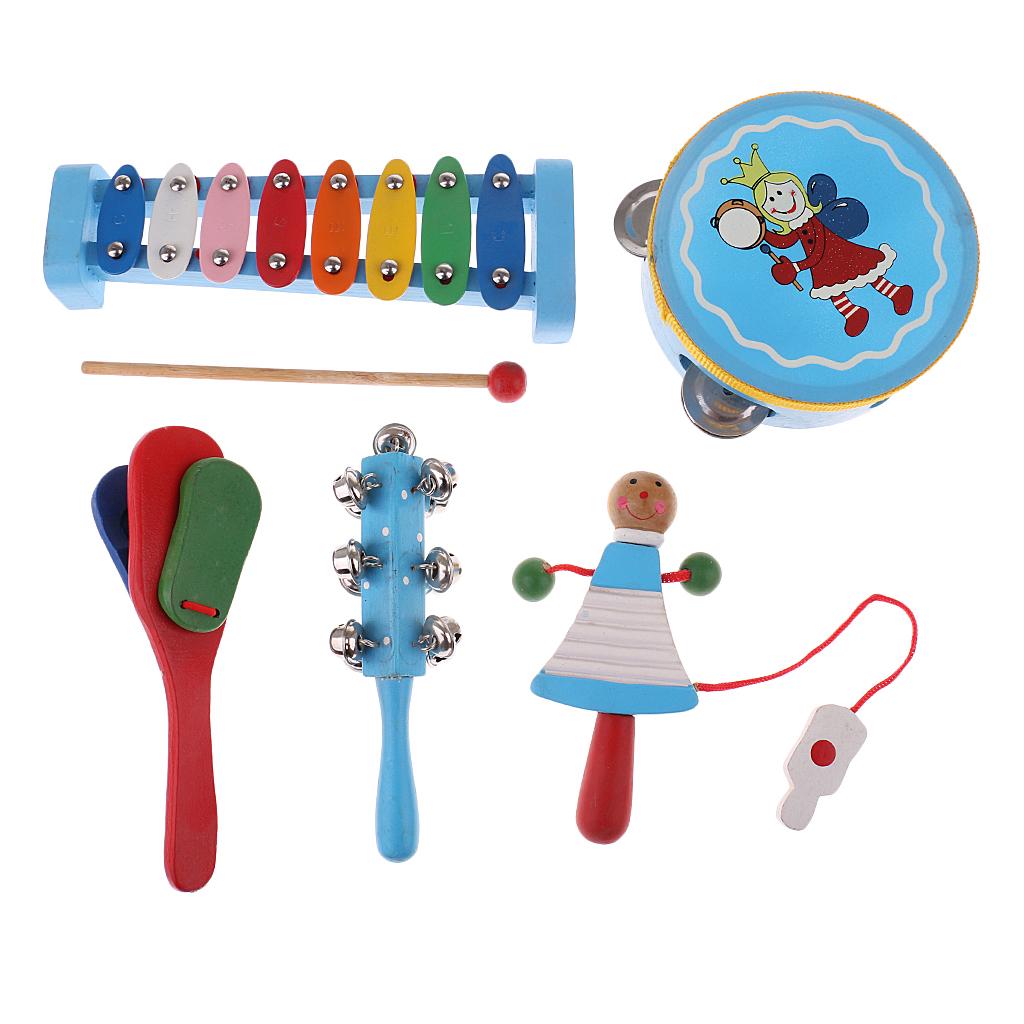 A complete rhythm instrument set in one wooden box, cartoon tambourine sand egg maracas hand bells castanets music educational toys