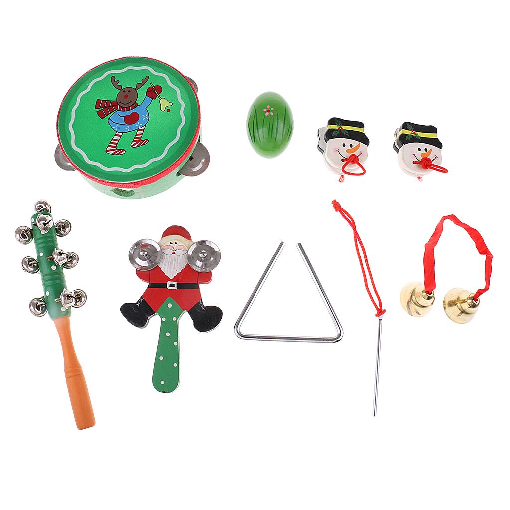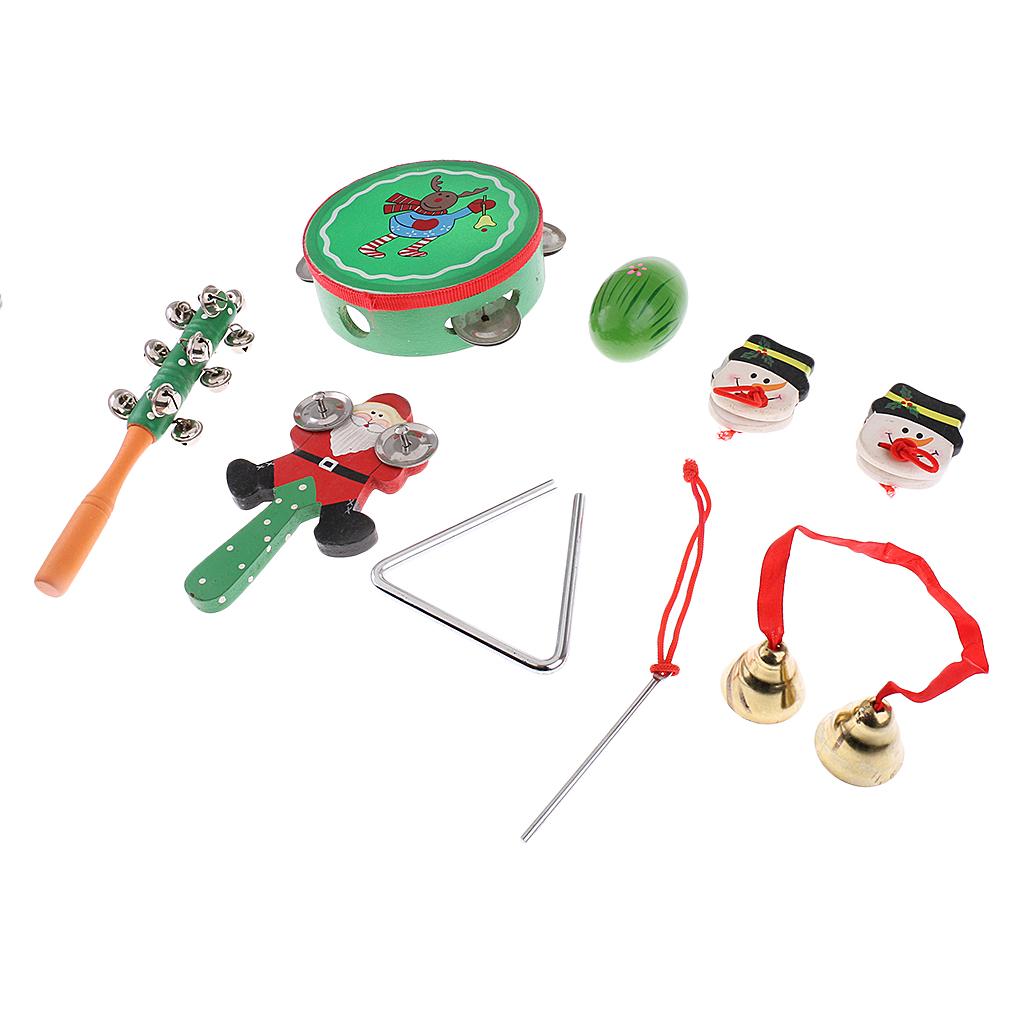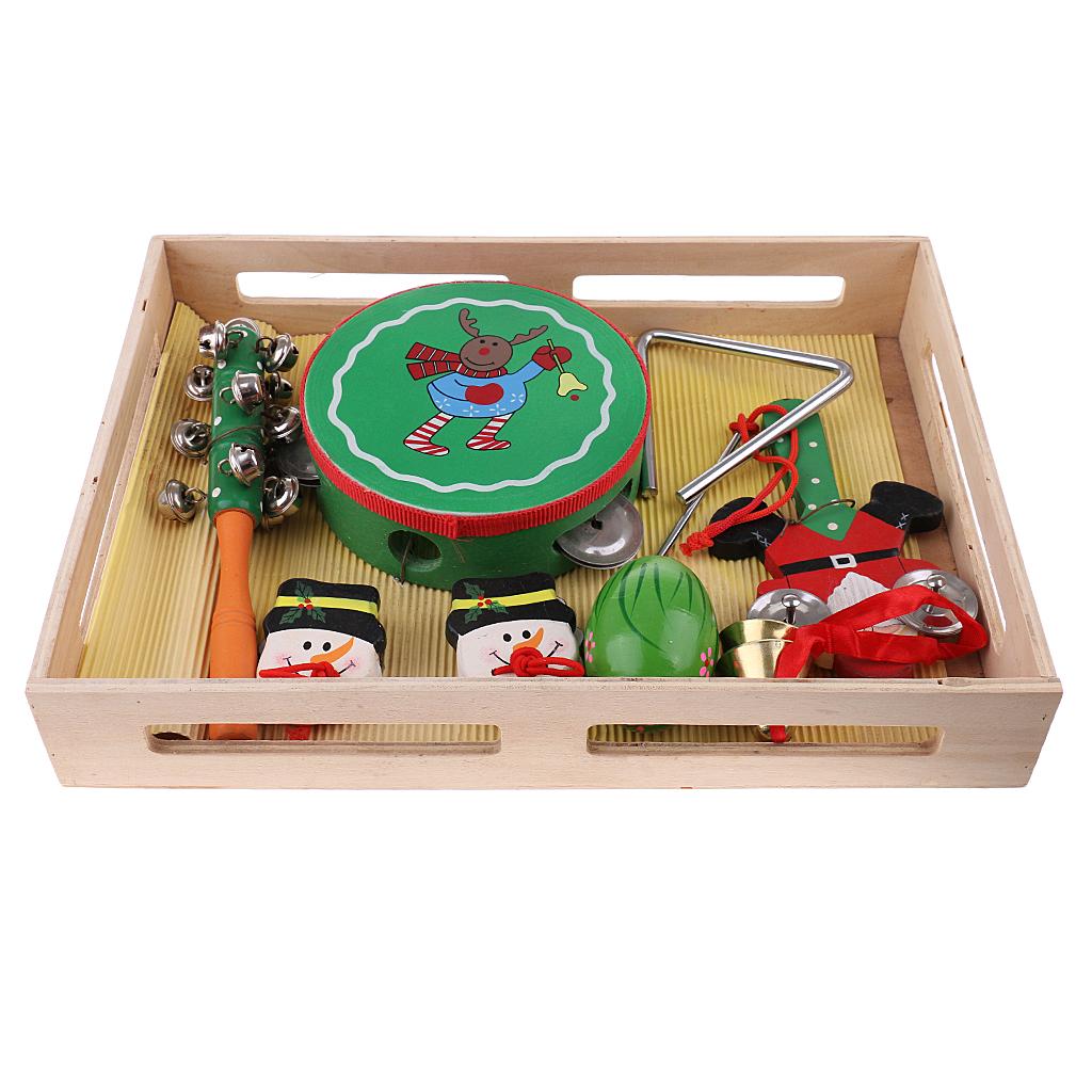 A complete rhythm instrument set in one wooden box, cartoon tambourine sand egg maracas hand bells castanets music educational toys