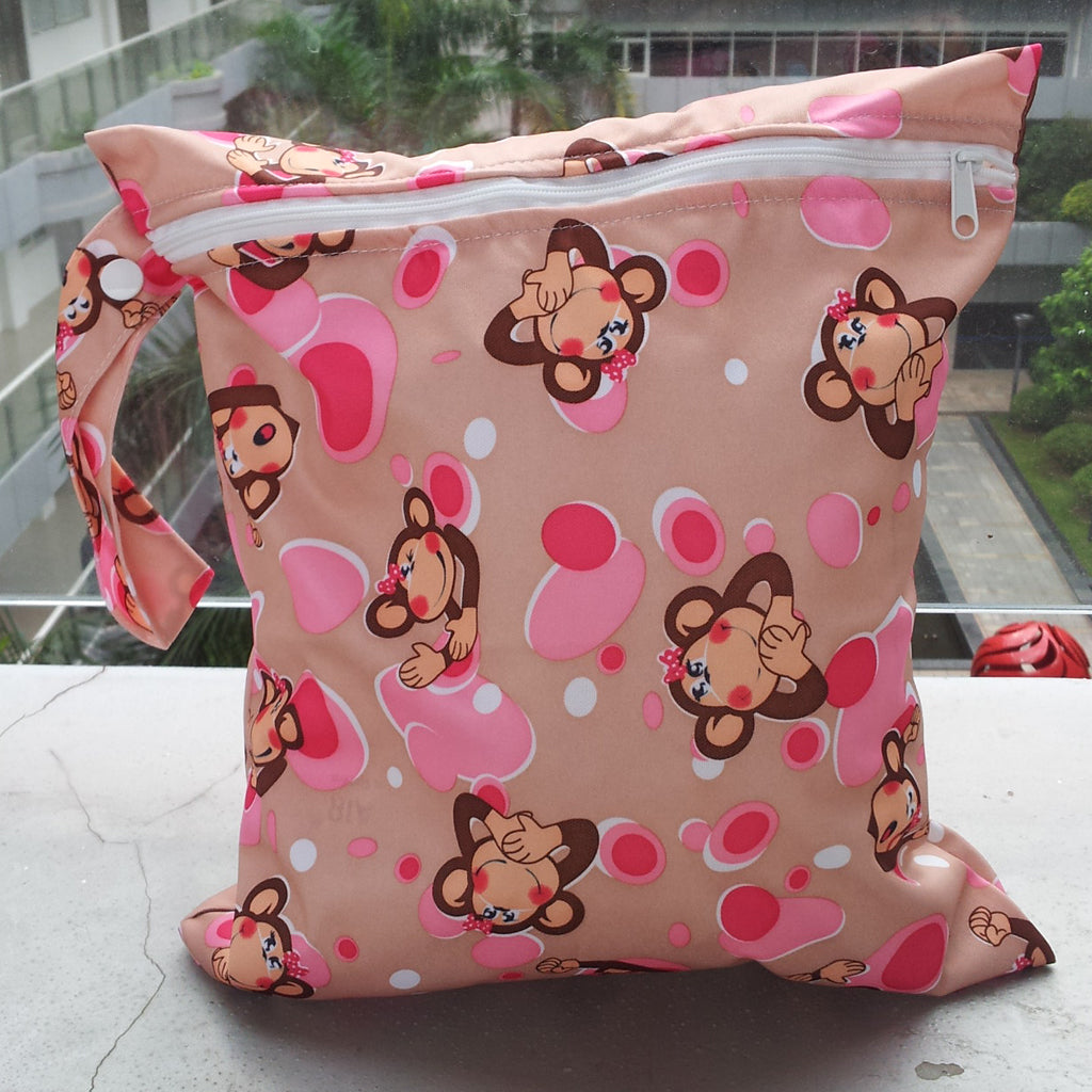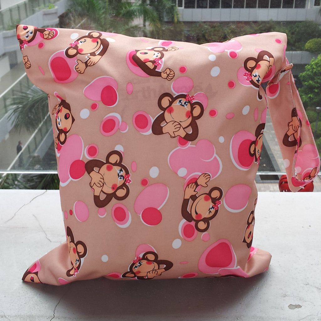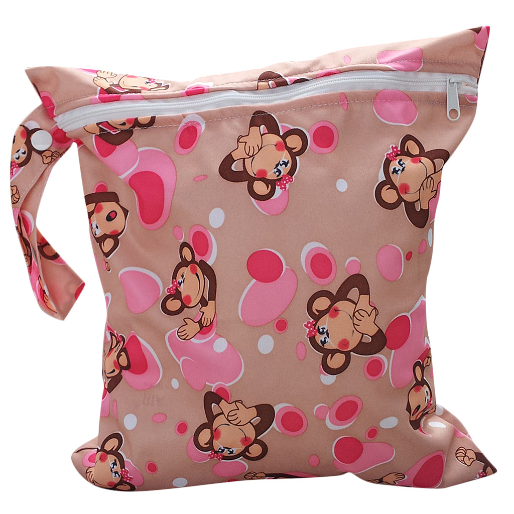 Baby Infants Wet Diaper Nappy Storage Waterproof Zippered Reusable Tote Style Bag Monkey Print Handbag Light Brown