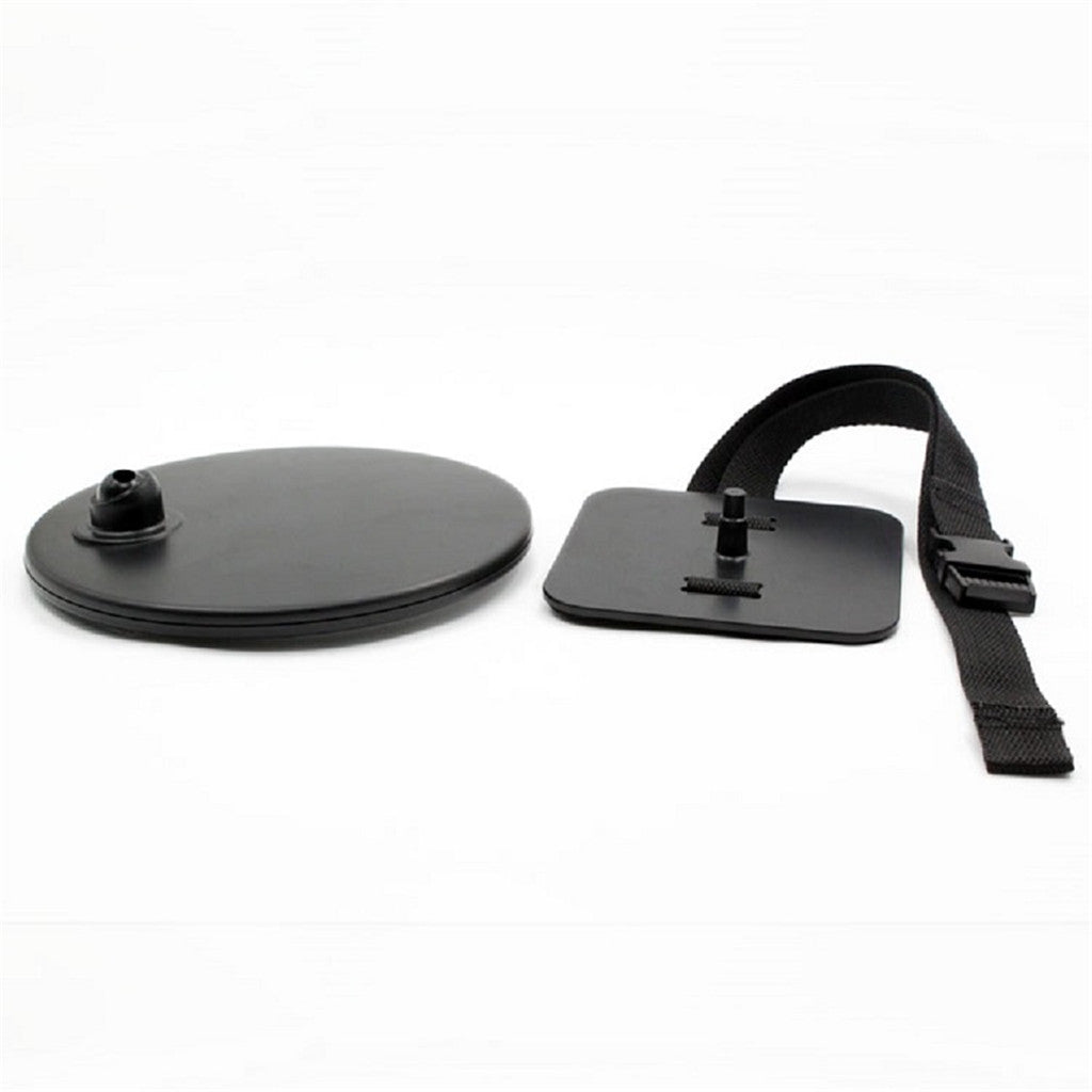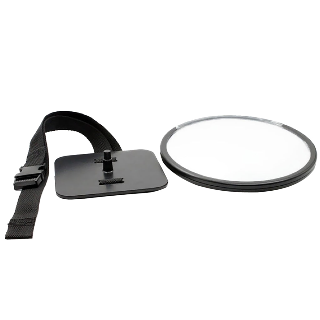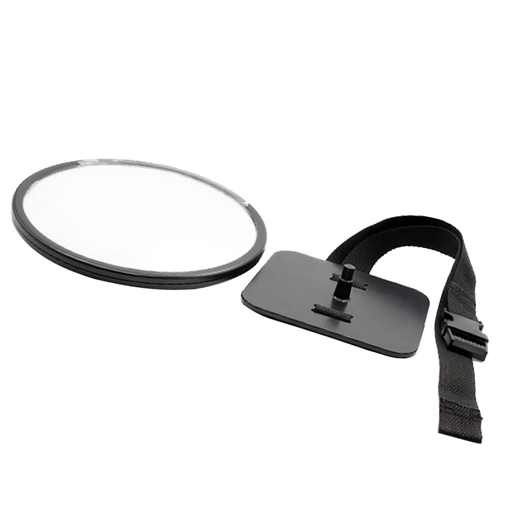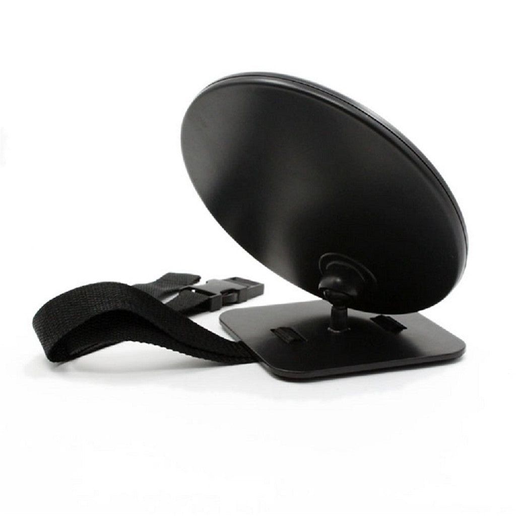 Position on rear seat headrest and view via car's rear view mirror. Rotates and pivots for a clear view.