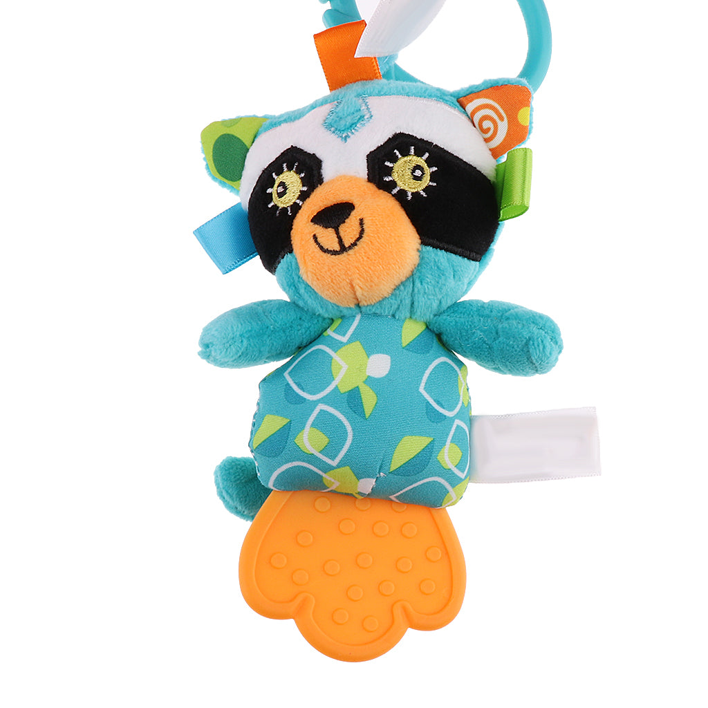 Soft body and head; teether rings around neck; colorful ribbons, knots, and ties make up legs