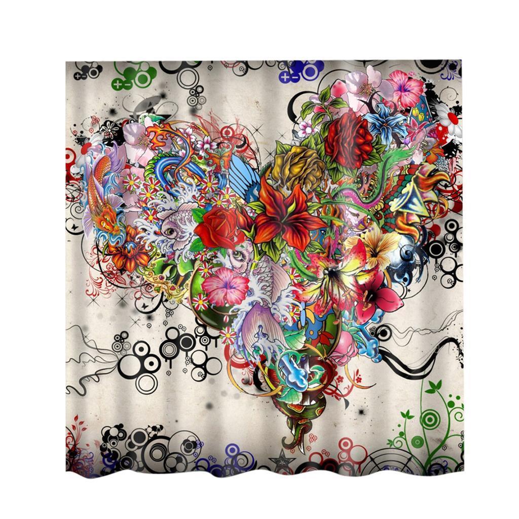 Folk Style Bathroom Polyester Shower Curtain with 12 Hooks Set Heart