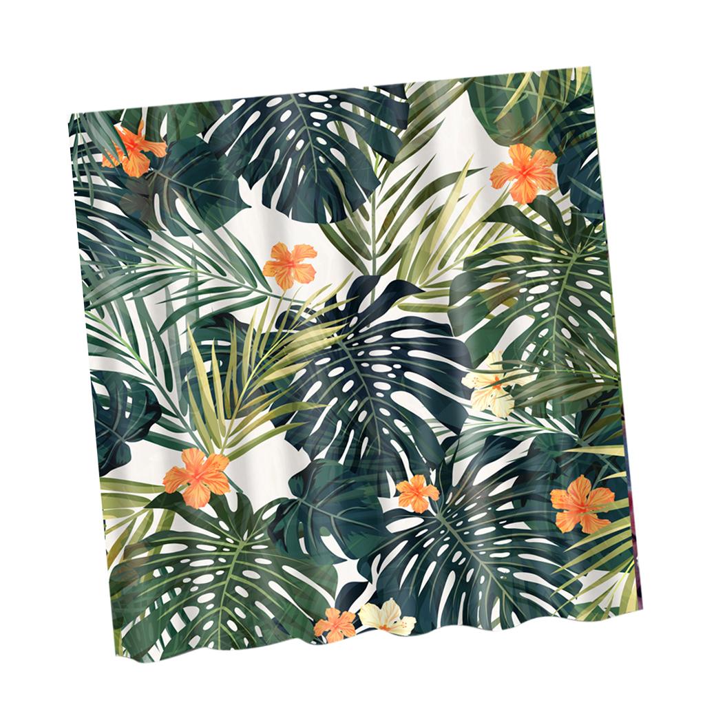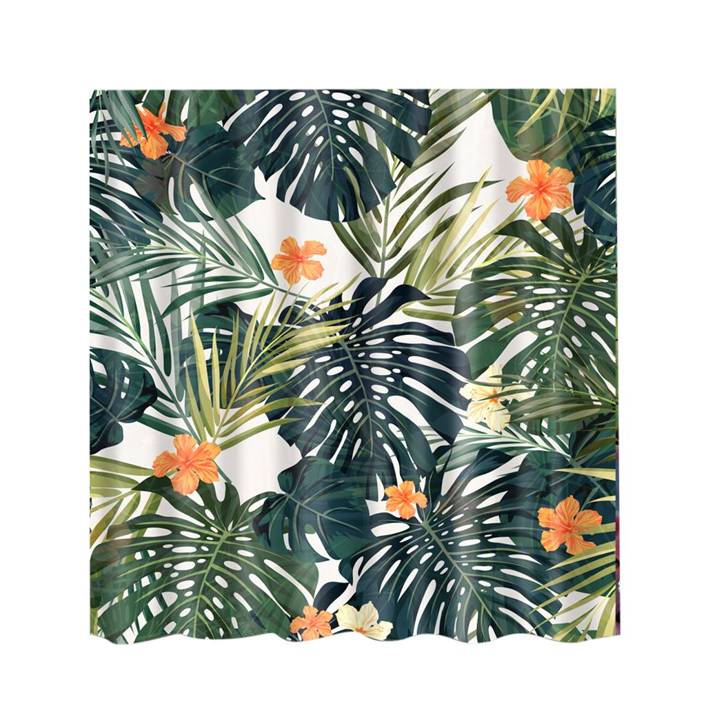 Folk Style Bathroom Polyester Shower Curtain with 12 Hooks Set Leaf