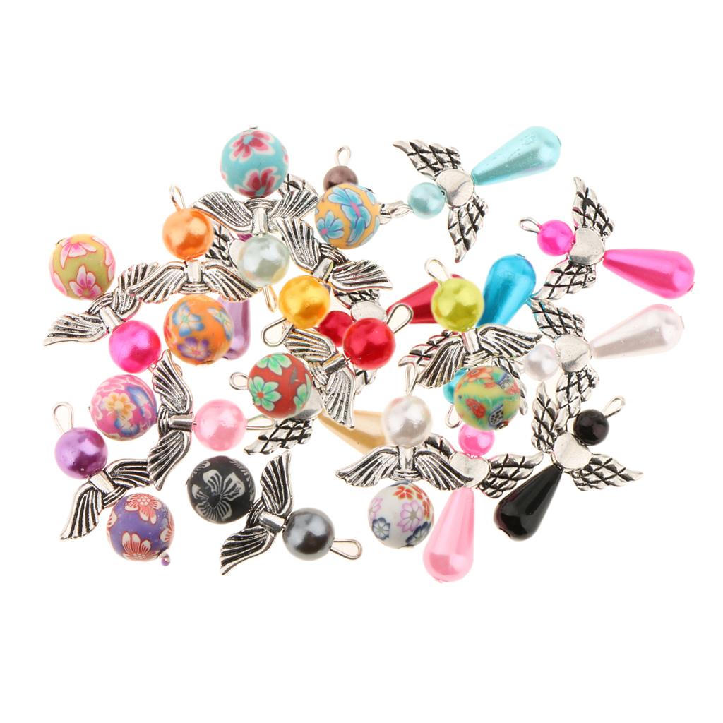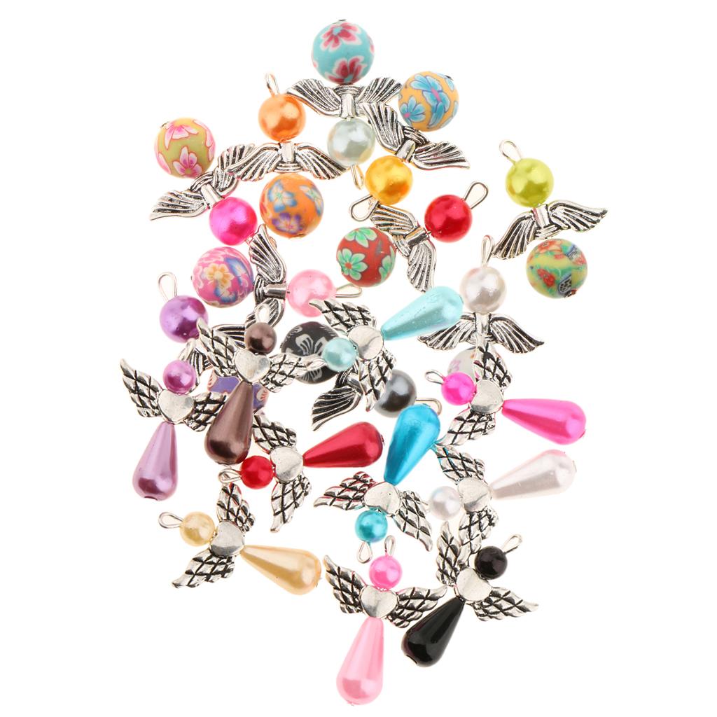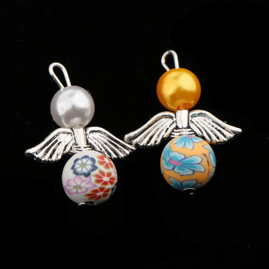 Made using pearl and polymer clay beads, tibetan silver alloy angel wings.