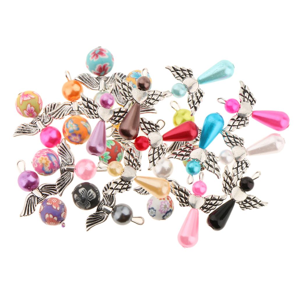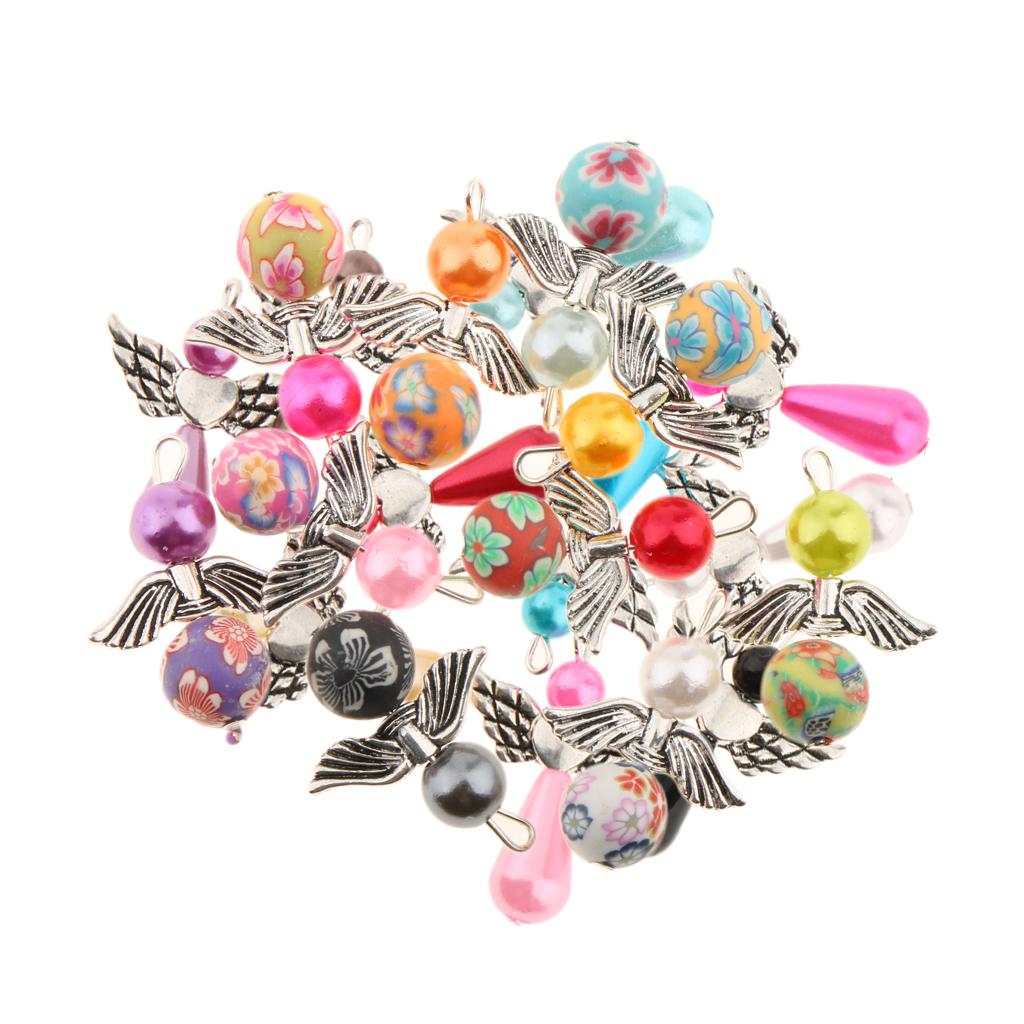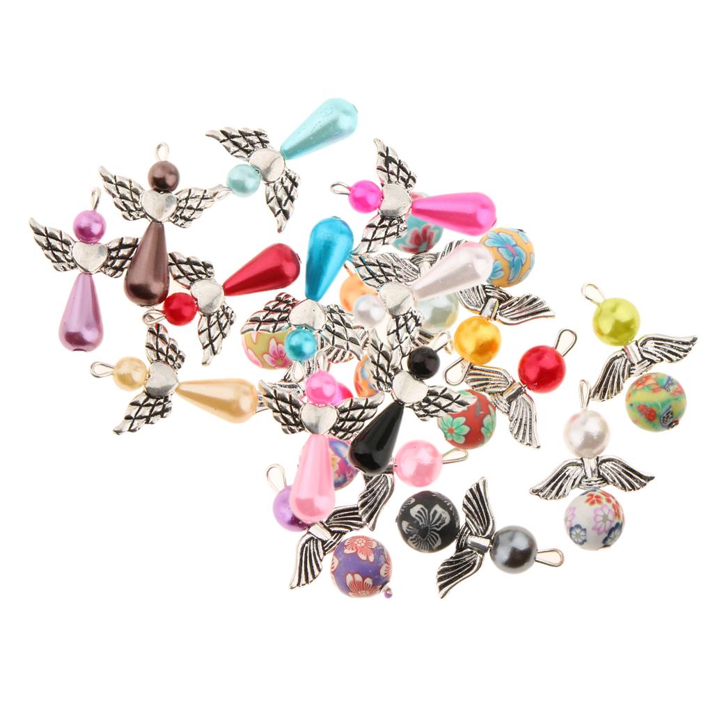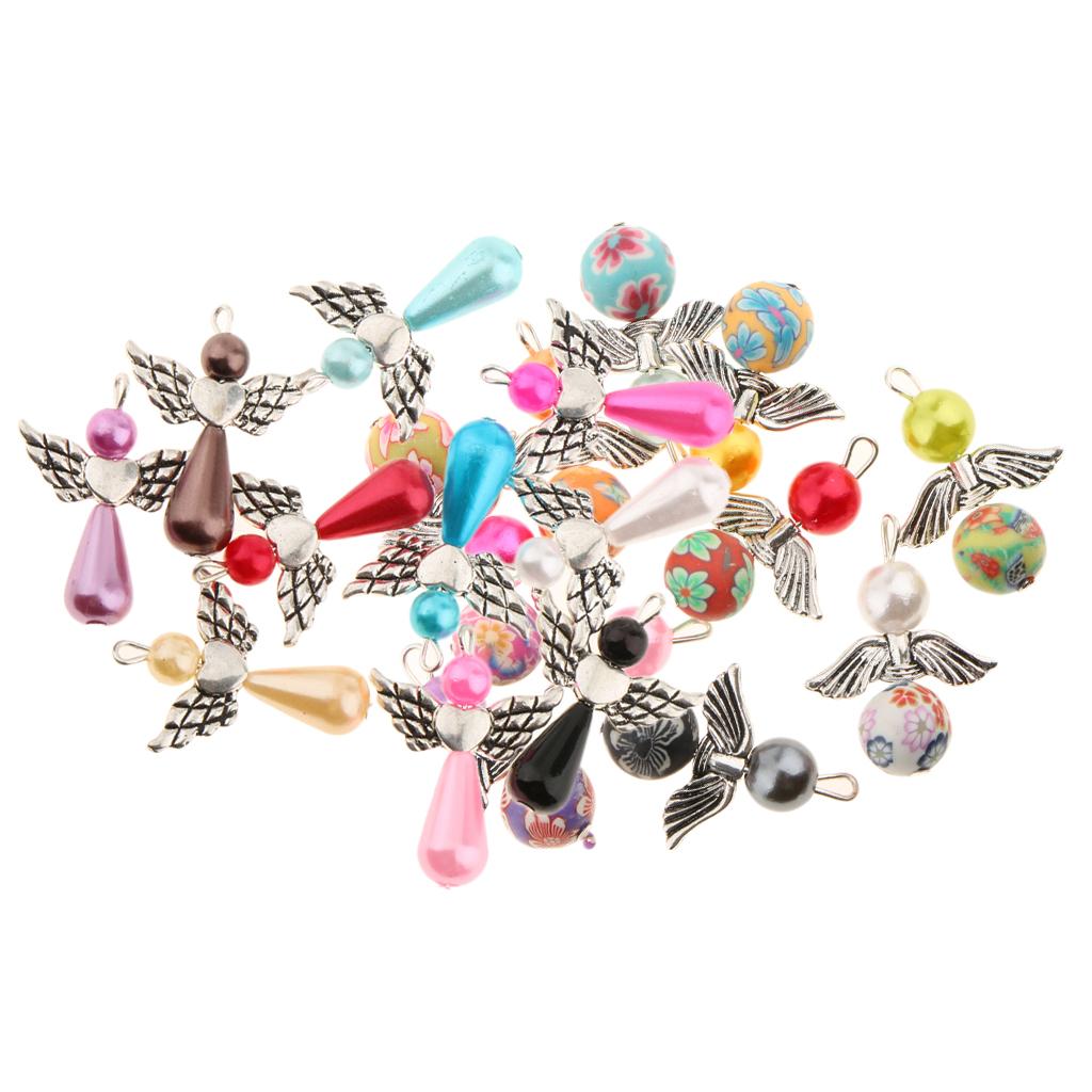 Made using pearl and polymer clay beads, tibetan silver alloy angel wings.