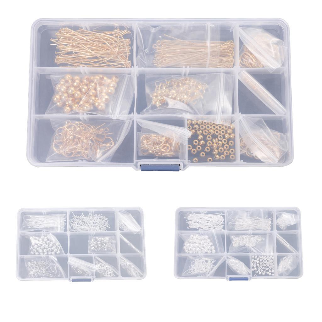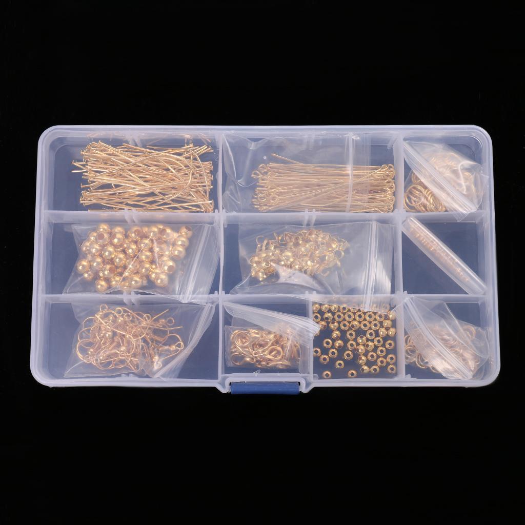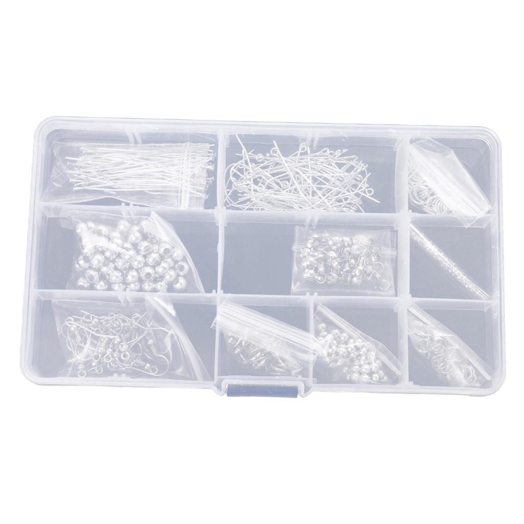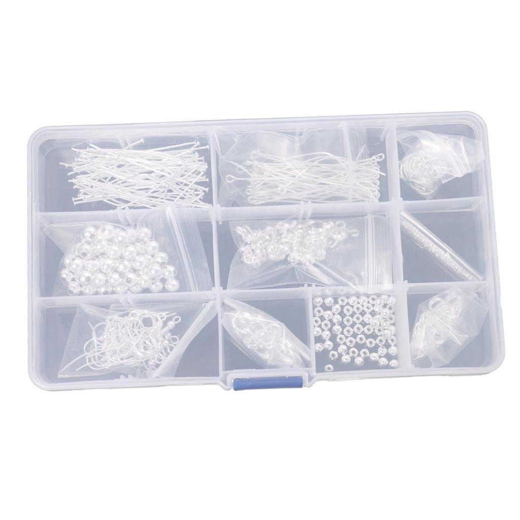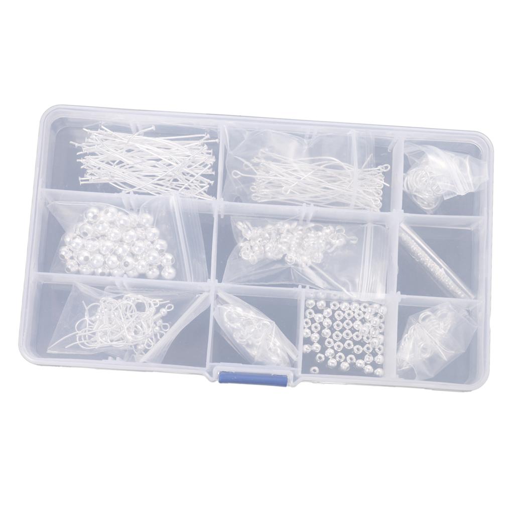 Jewelry making starter kit including lobster clasp, jump rings, head pins, eye pin, crimp end bead tips, spacer beads, positioning spacer beads and ear wires