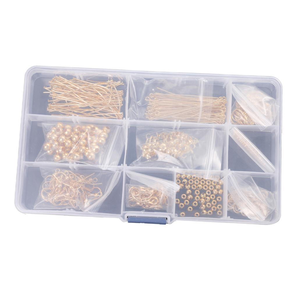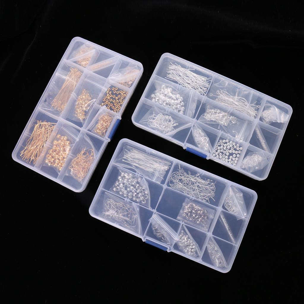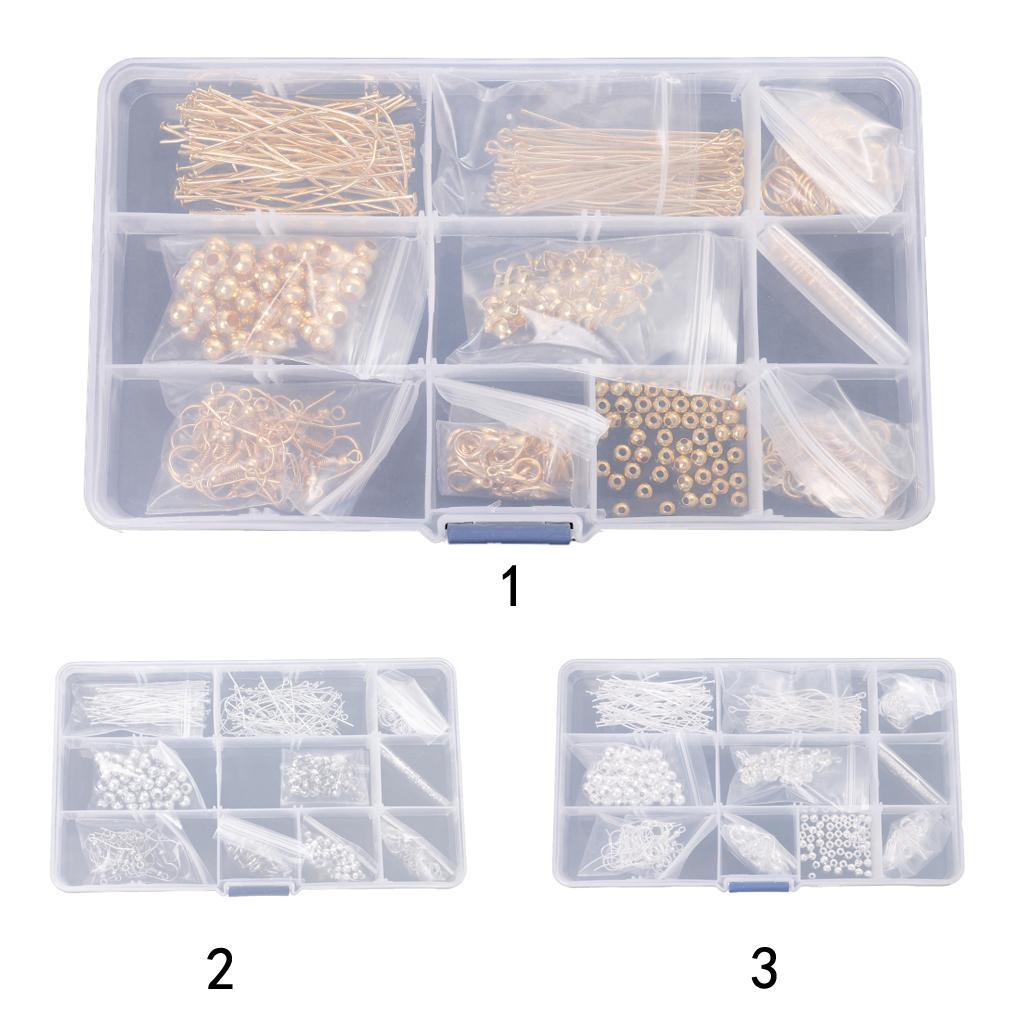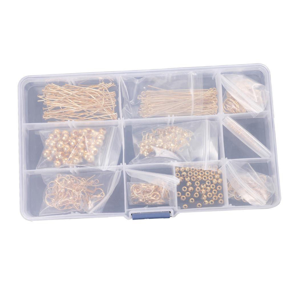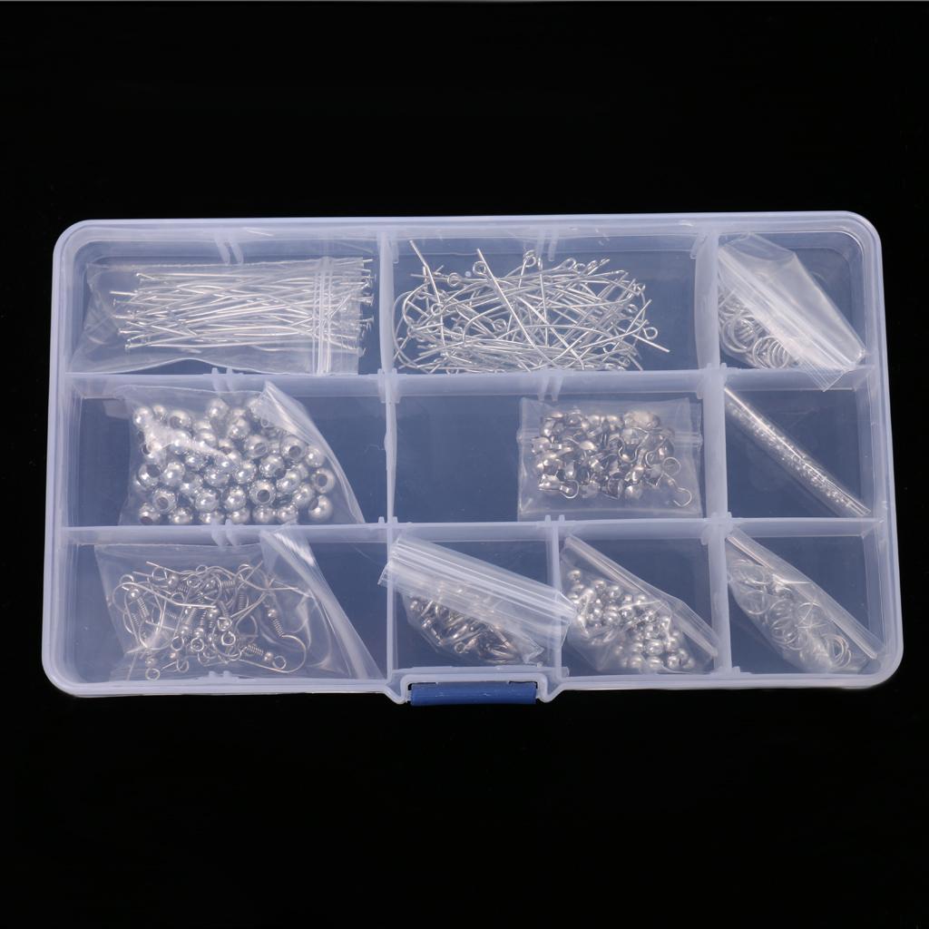 Jewelry making starter kit including lobster clasp, jump rings, head pins, eye pin, crimp end bead tips, spacer beads, positioning spacer beads and ear wires