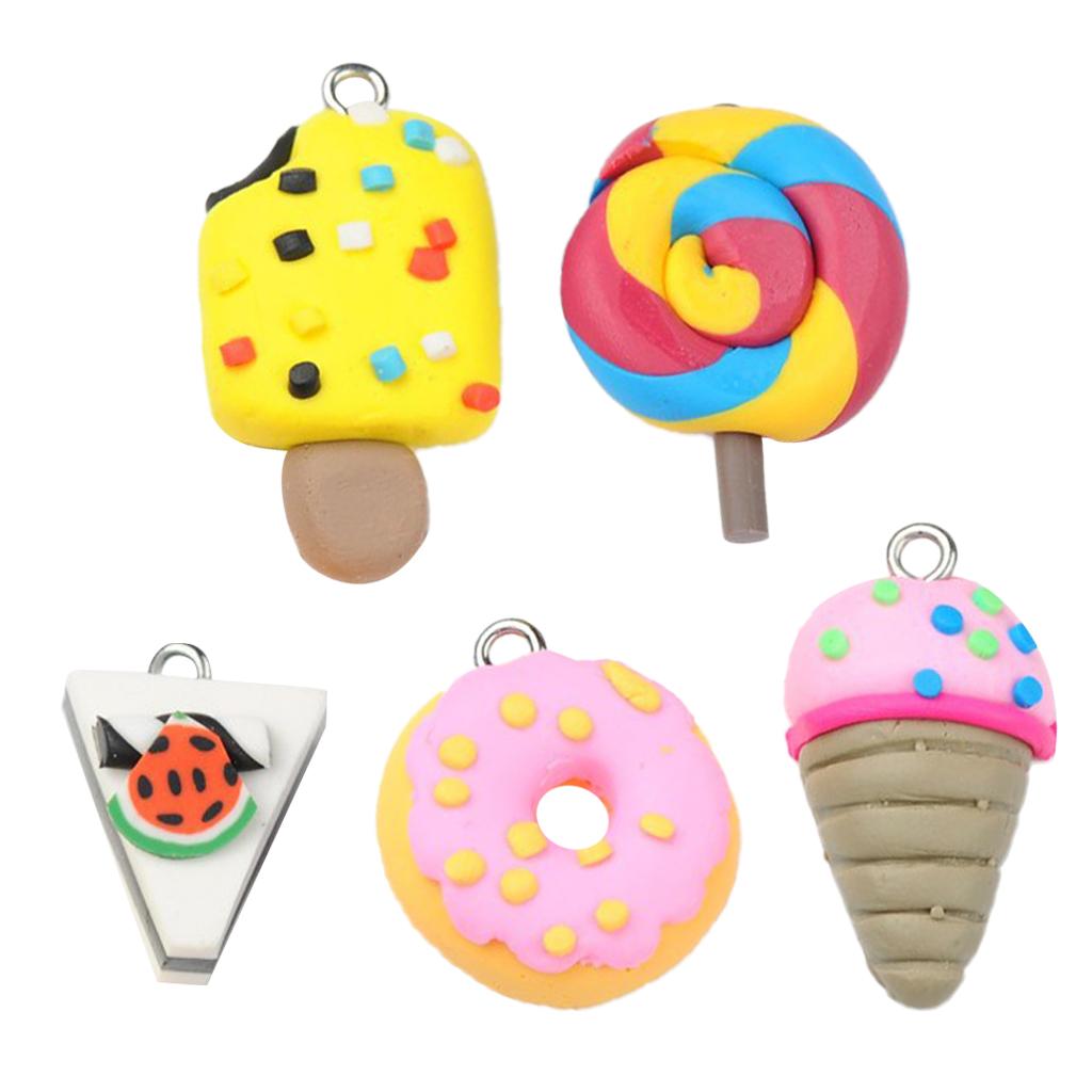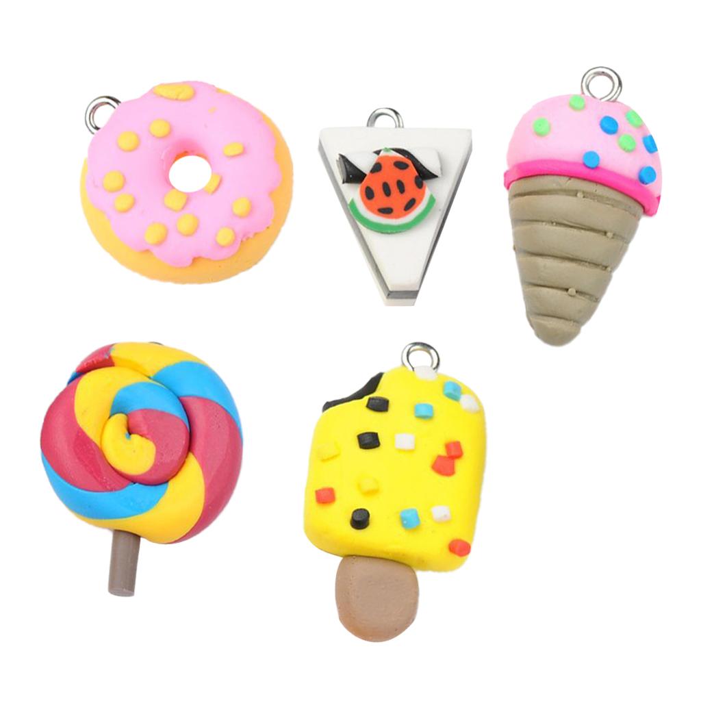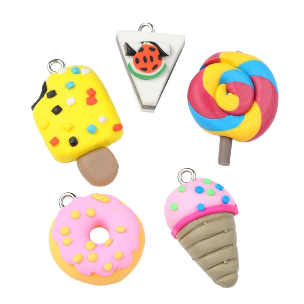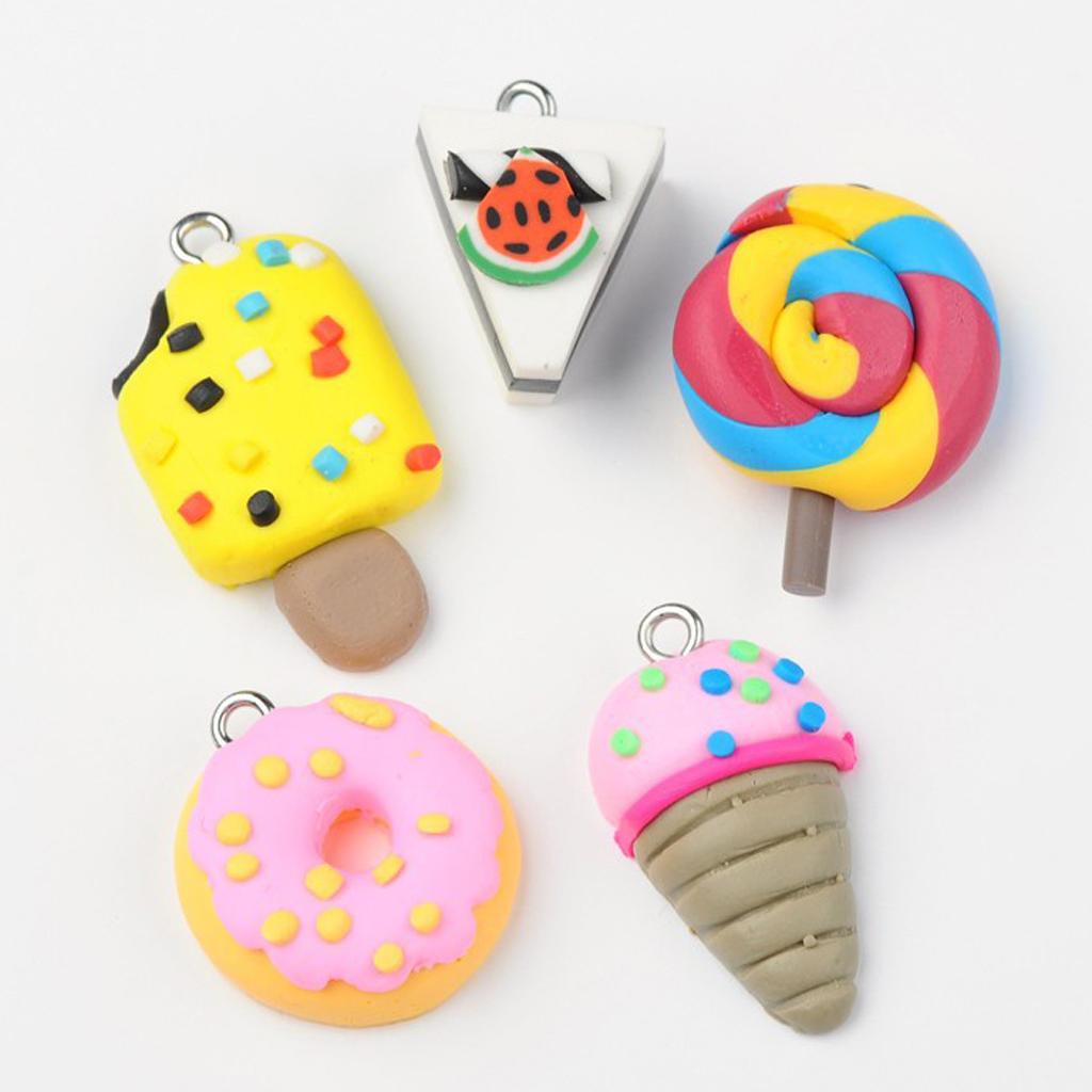 5 Pieces Kawaii Polymer Clay Charm Pendants Includes Ice Cream, Candy, Donut, Lollipop and Sandwich Shaped Pendant for Jewelry Findings DIY Craft