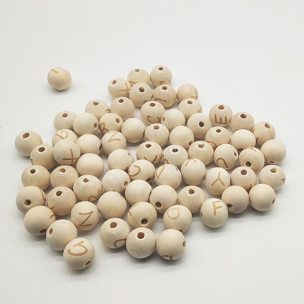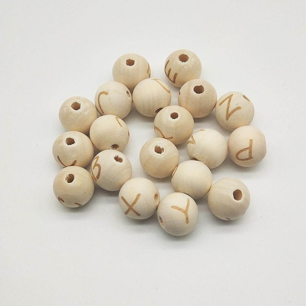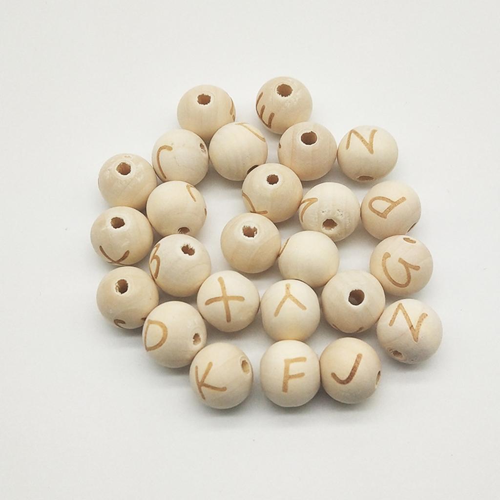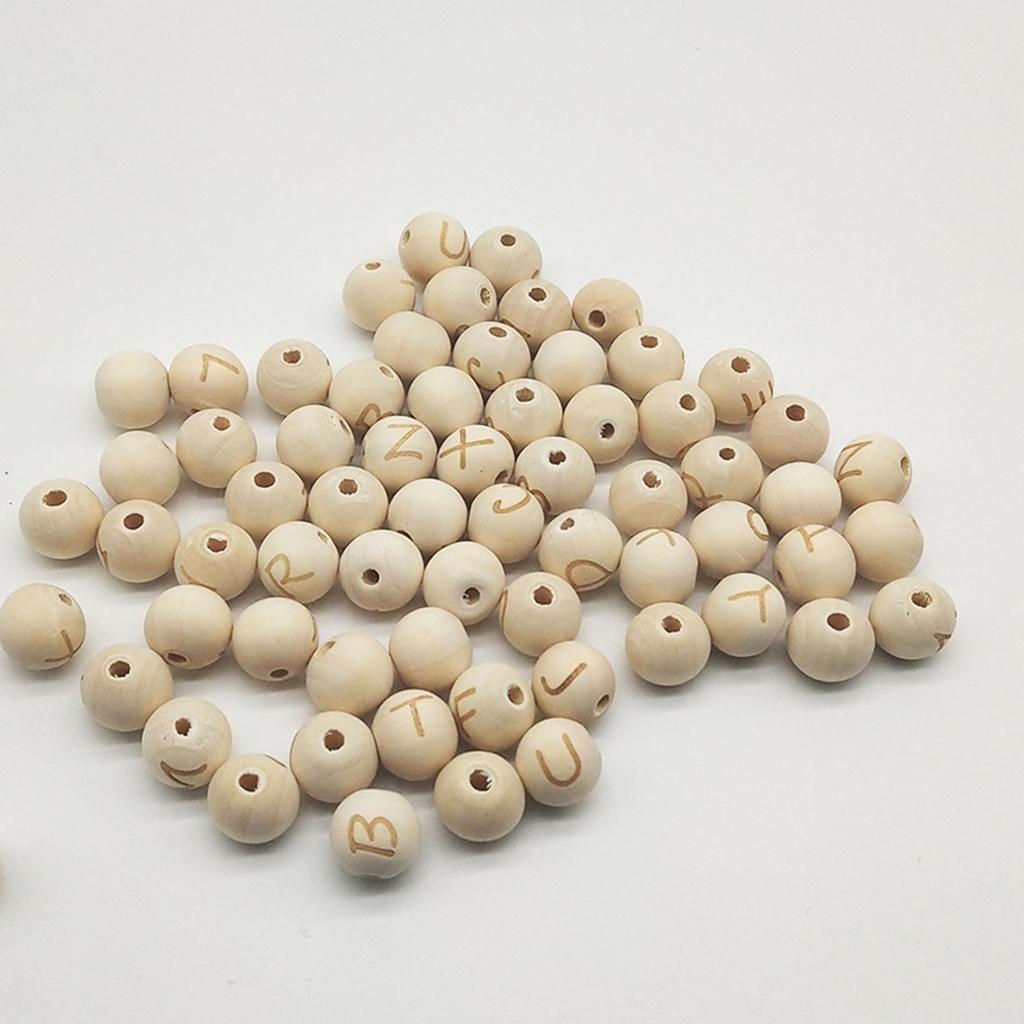 Unpainted natural wood round wood beads - with the alphabet letters printed on its intact sides, making it less dull.