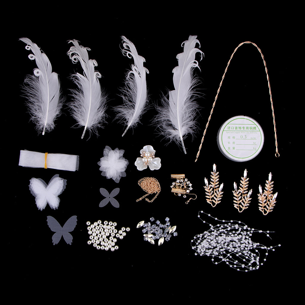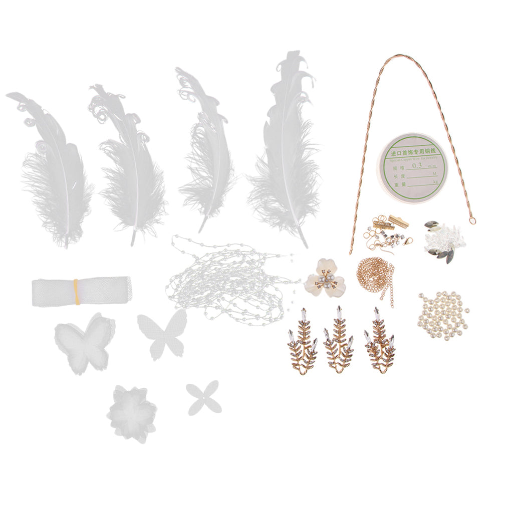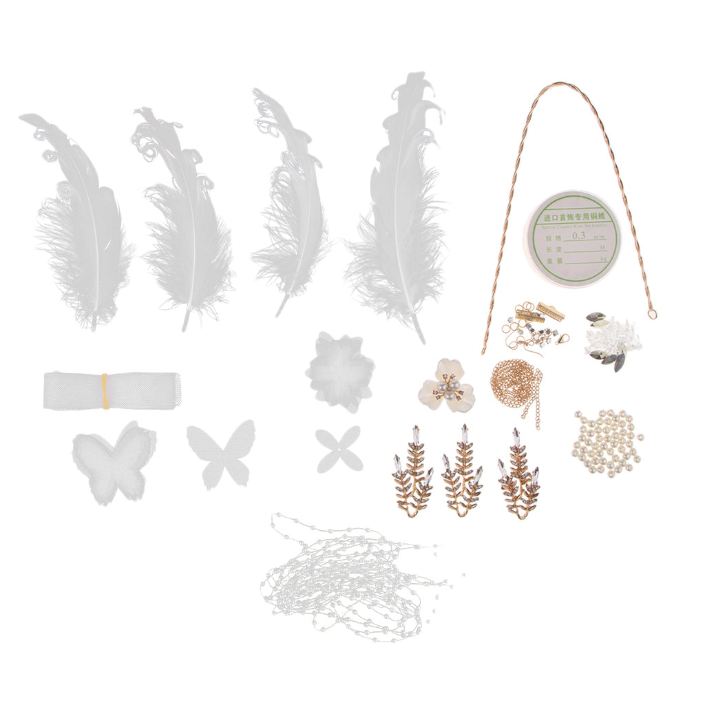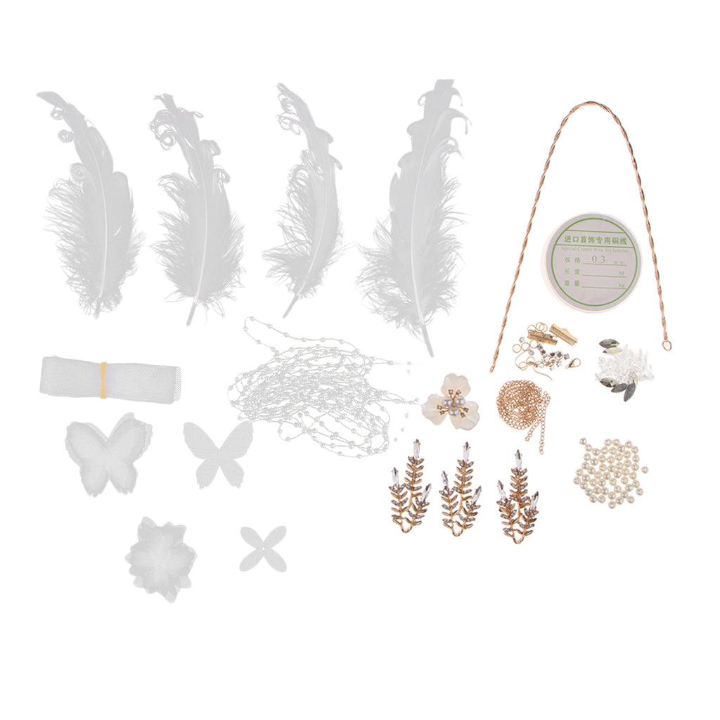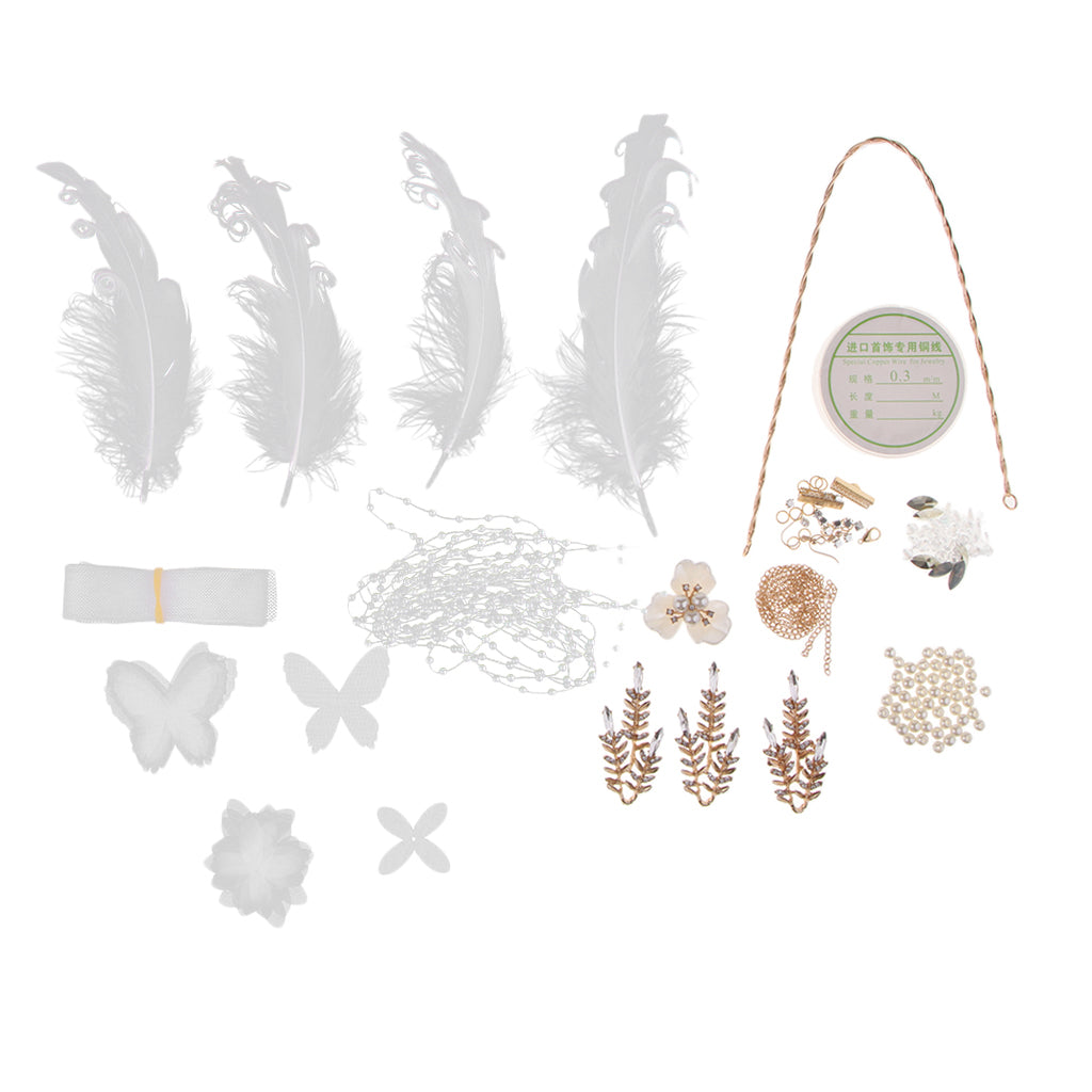 Include: 1 roll of copper wire, 4 pieces feather, many butterfly petals, diy tools and many accessories as pictures shown