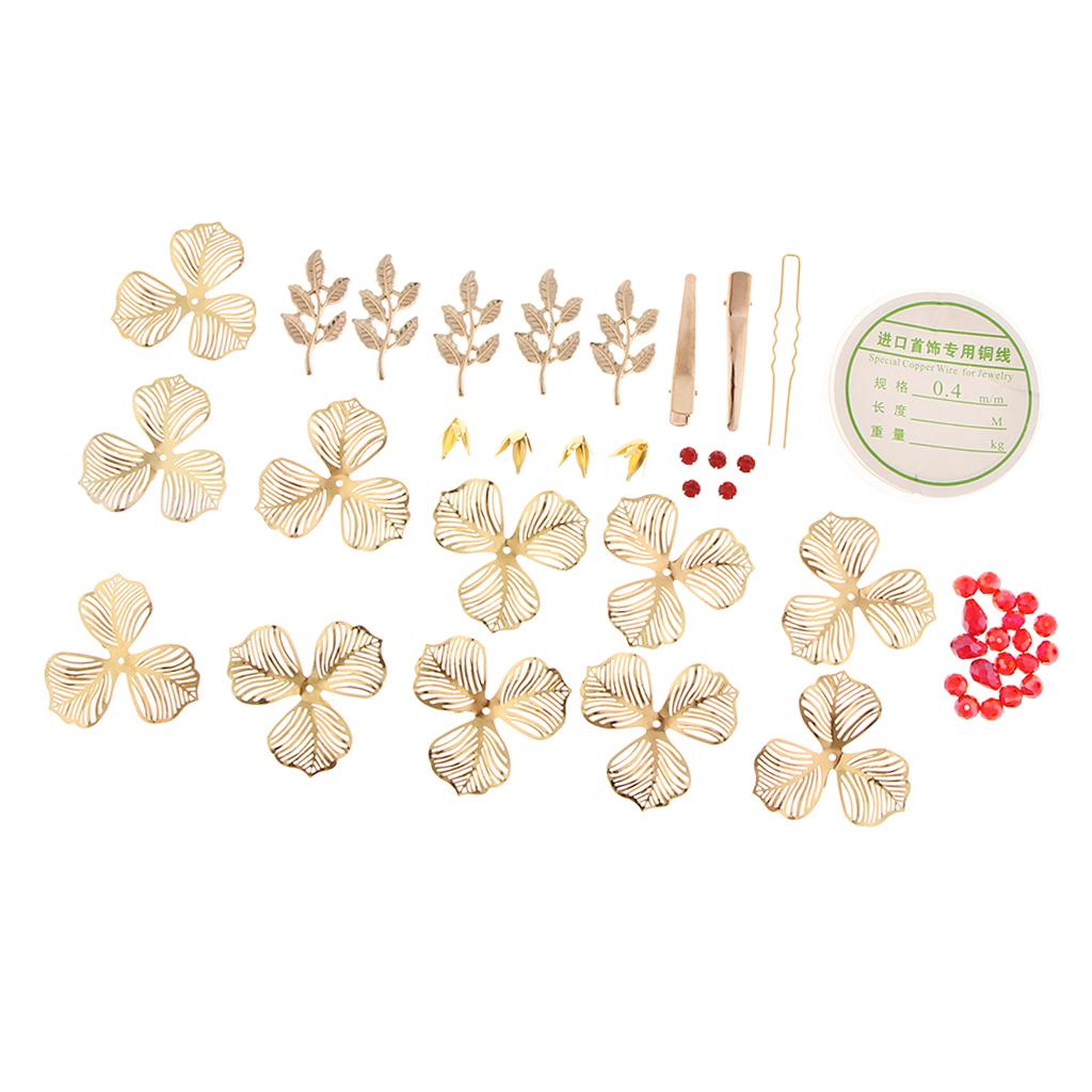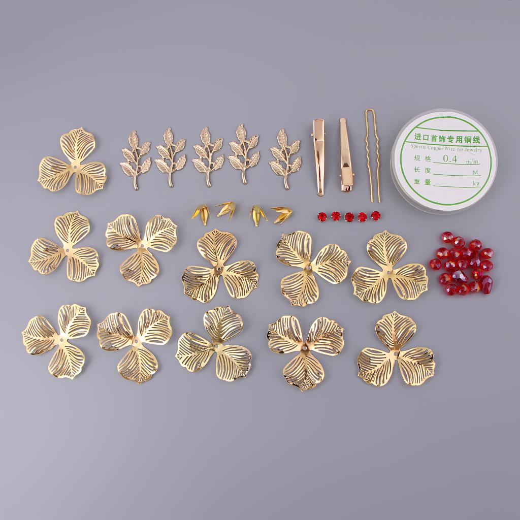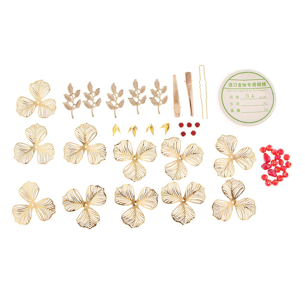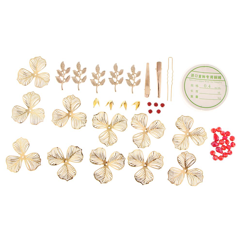 Include: 1 roll of copper wire, 11 pieces petals, 5 pieces leaves, many red beads, many yellow beads and diy tools