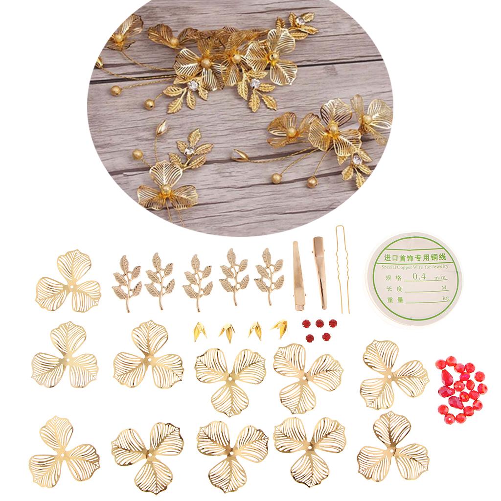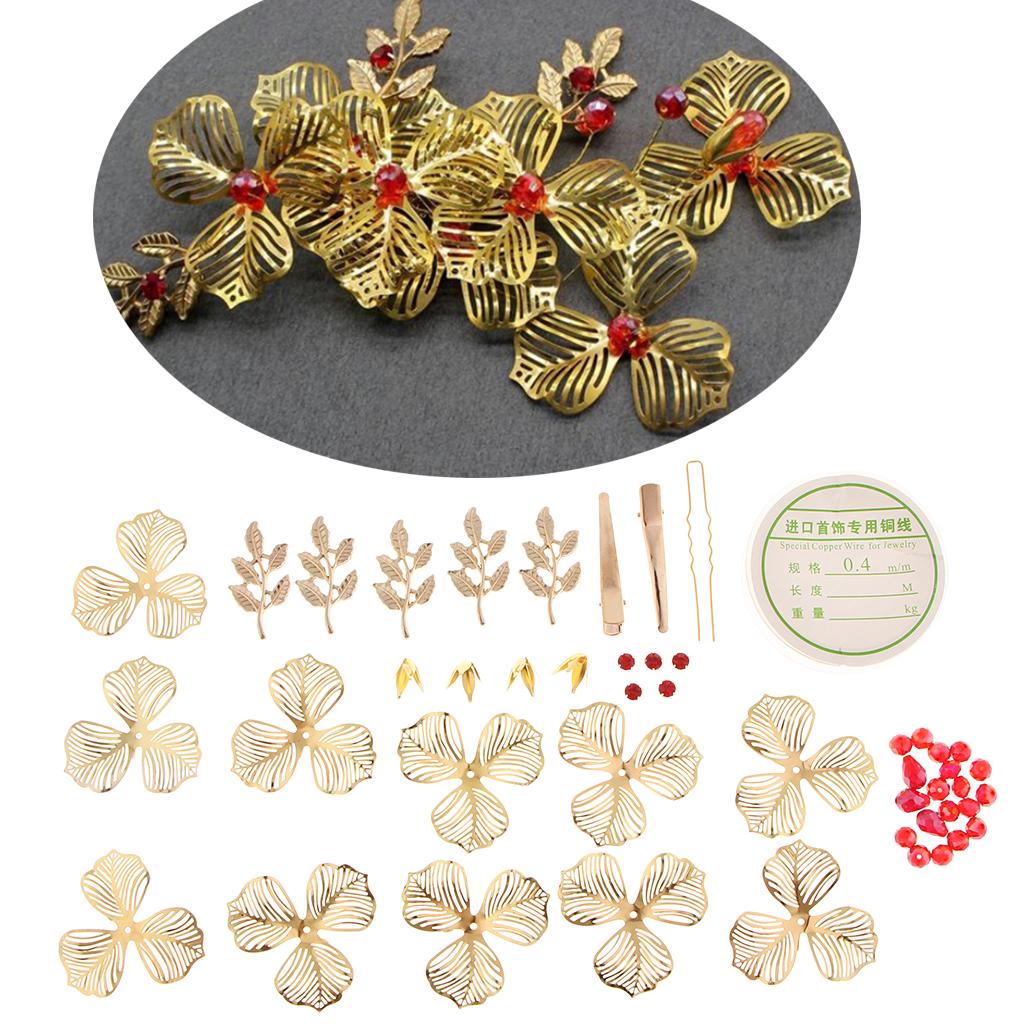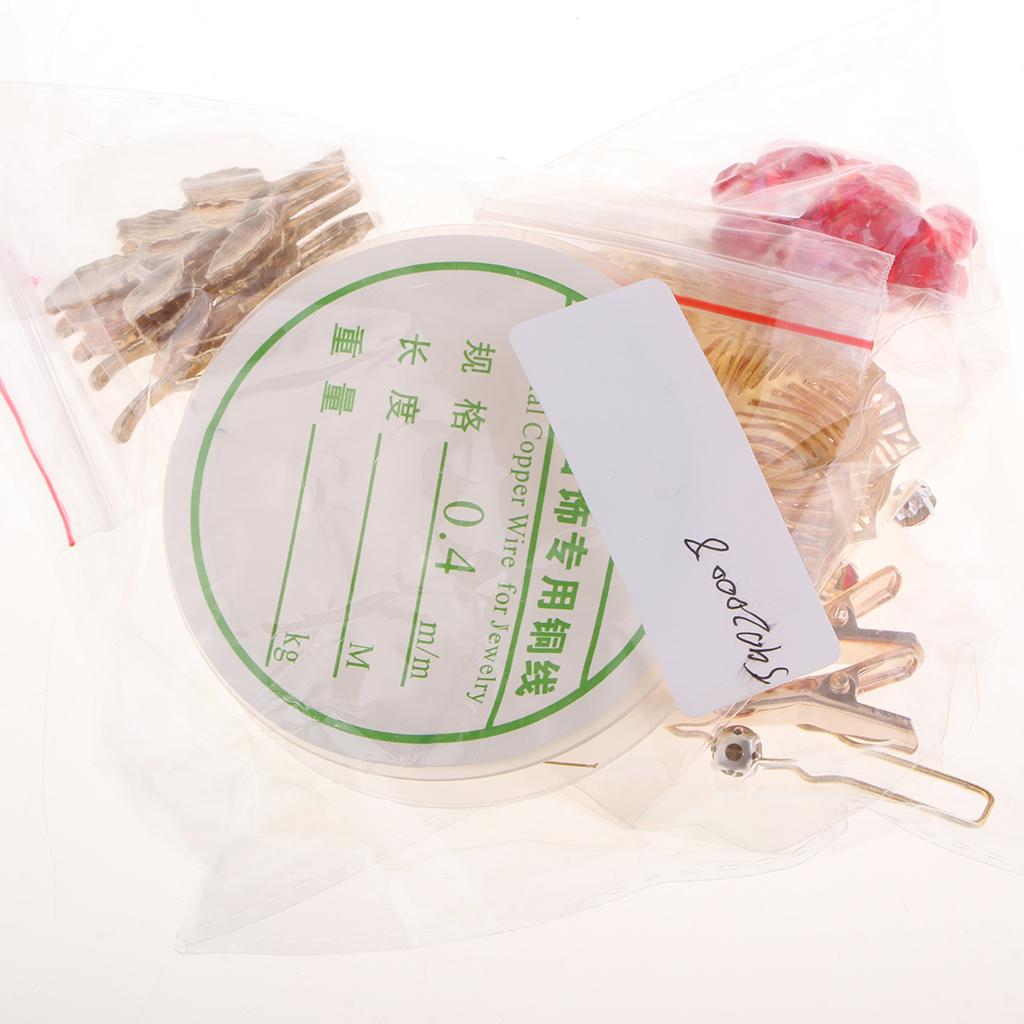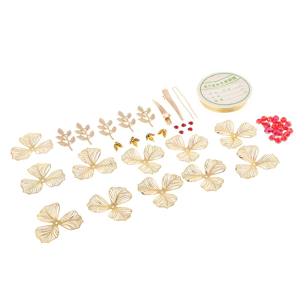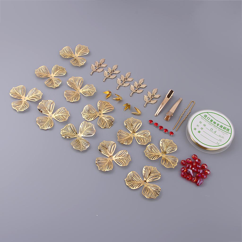 Include: 1 roll of copper wire, 11 pieces petals, 5 pieces leaves, many red beads, many yellow beads and diy tools