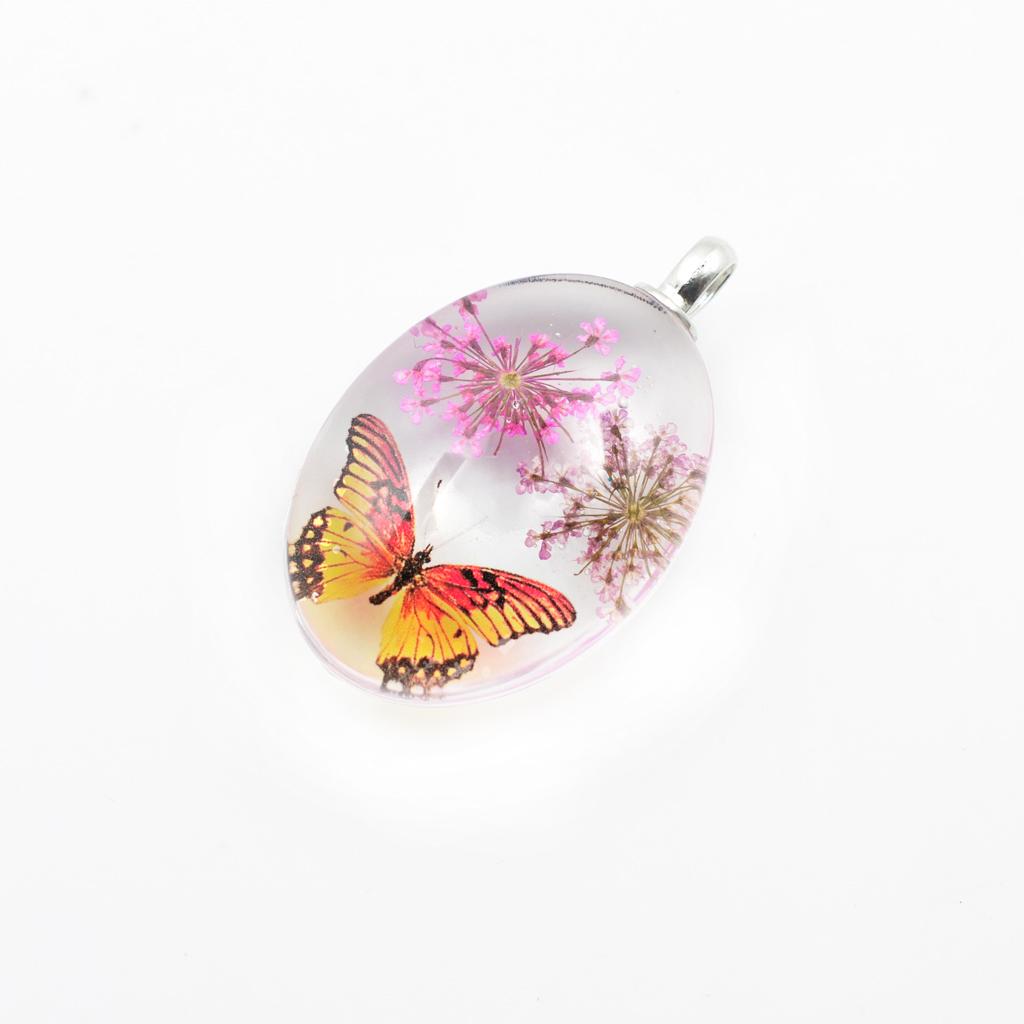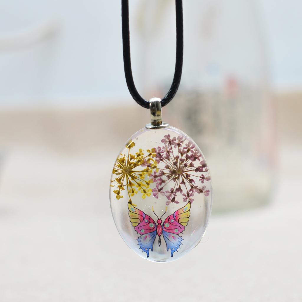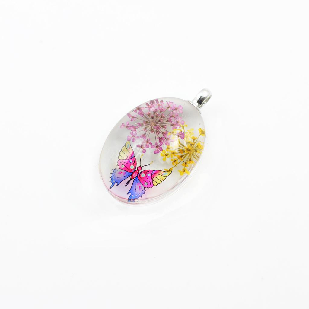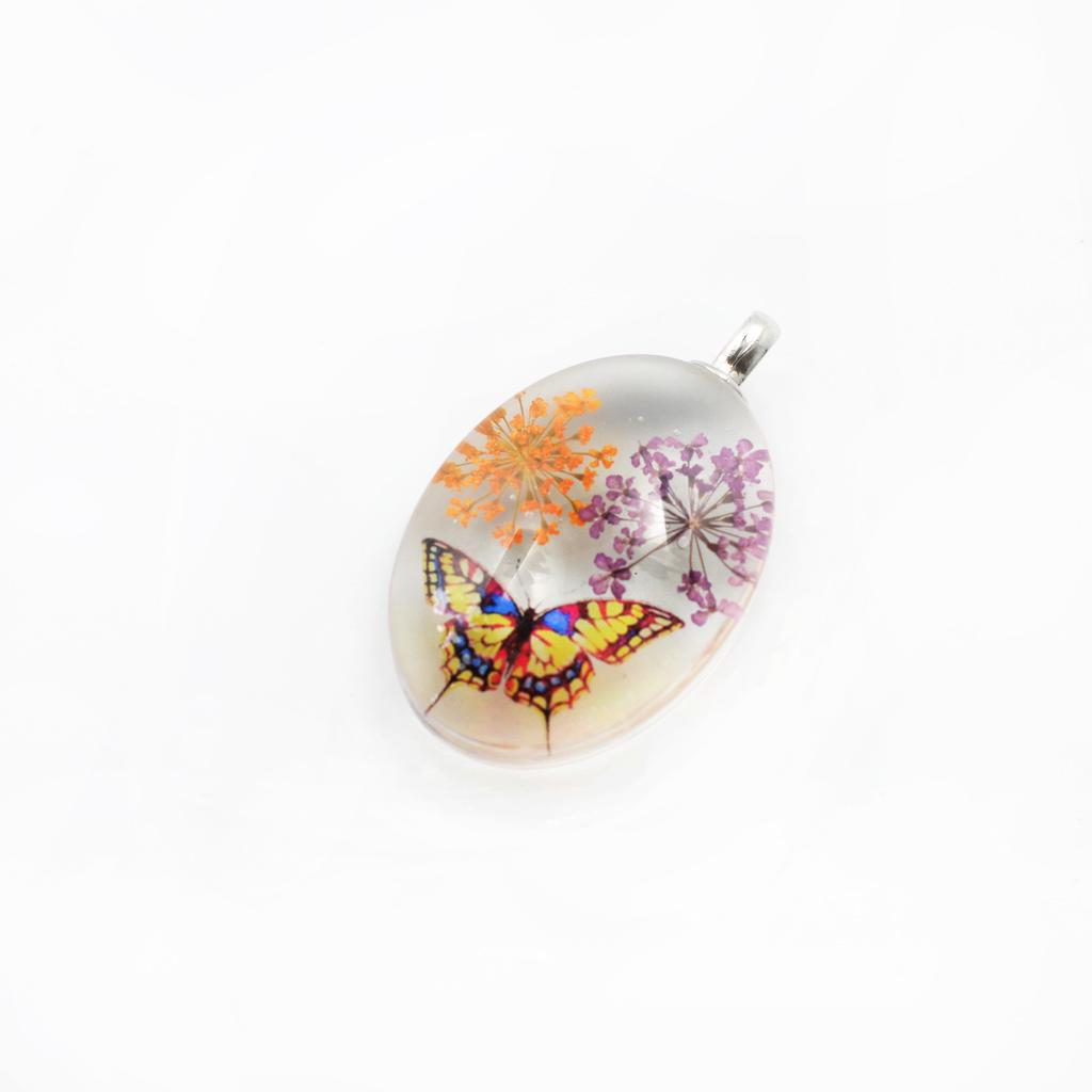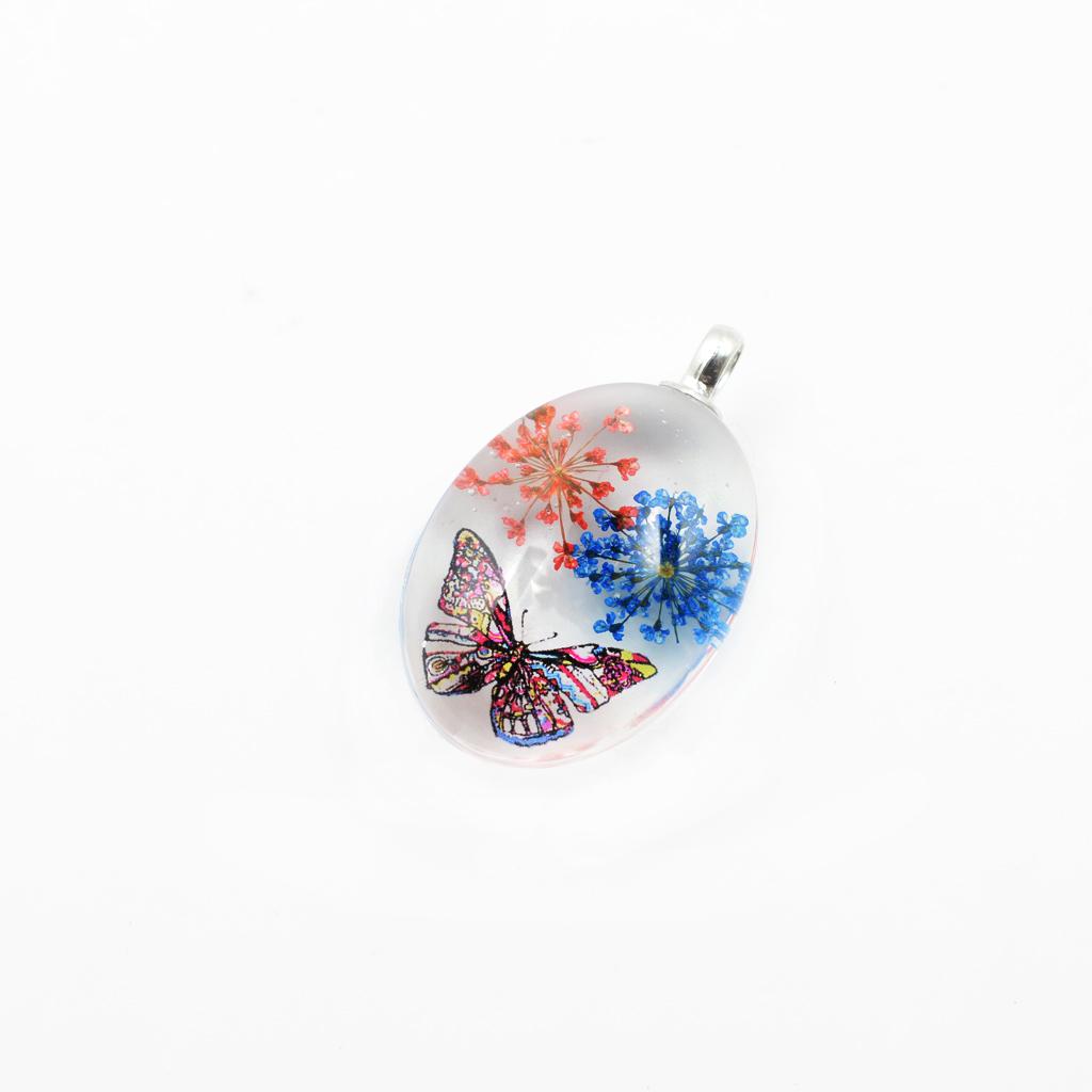 Unique transparent oval pendant featuring real dried flowers preserved in pendants