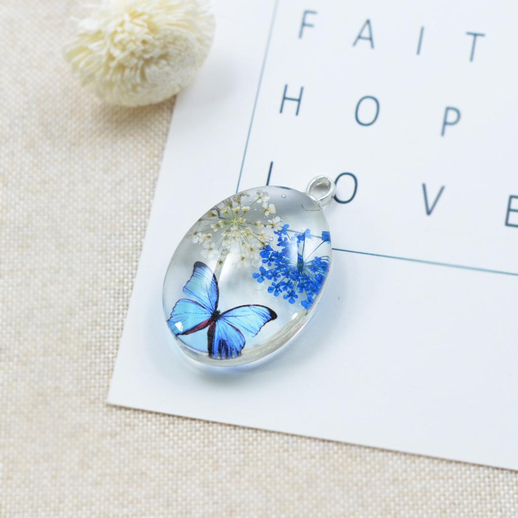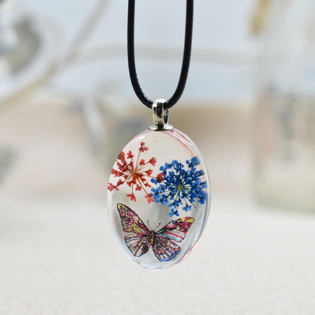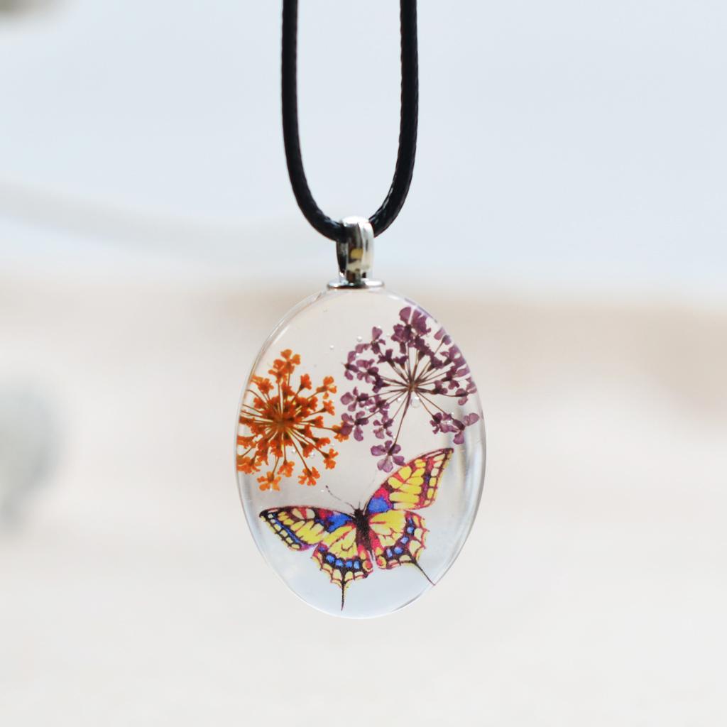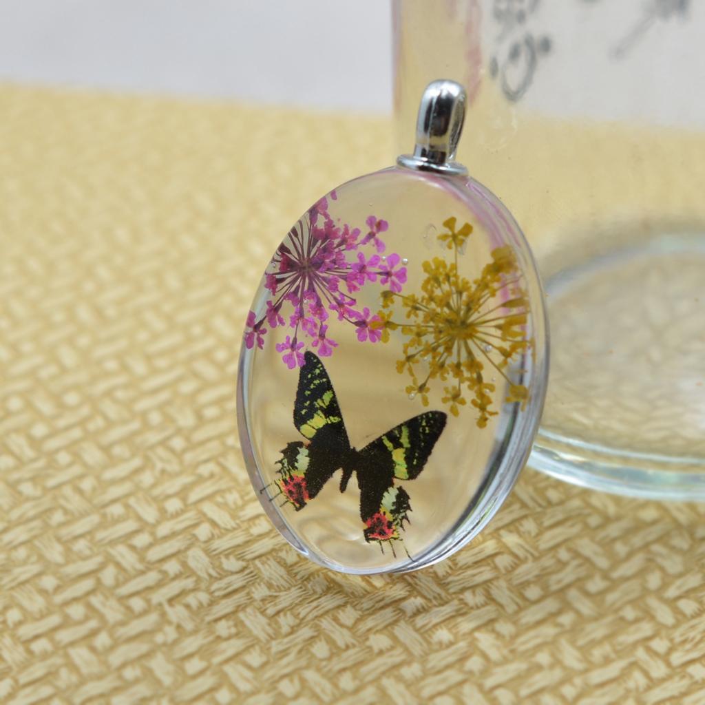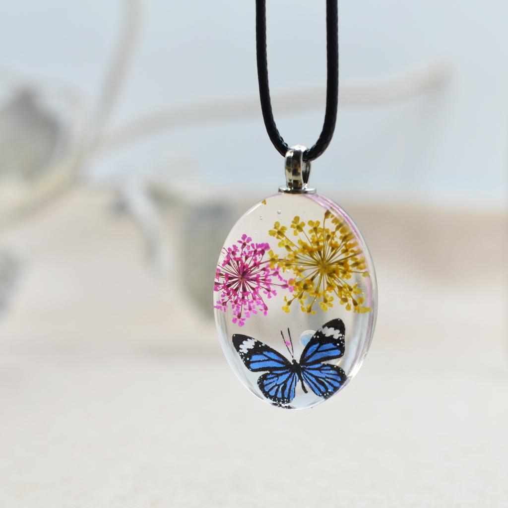 Unique transparent oval pendant featuring real dried flowers preserved in pendants