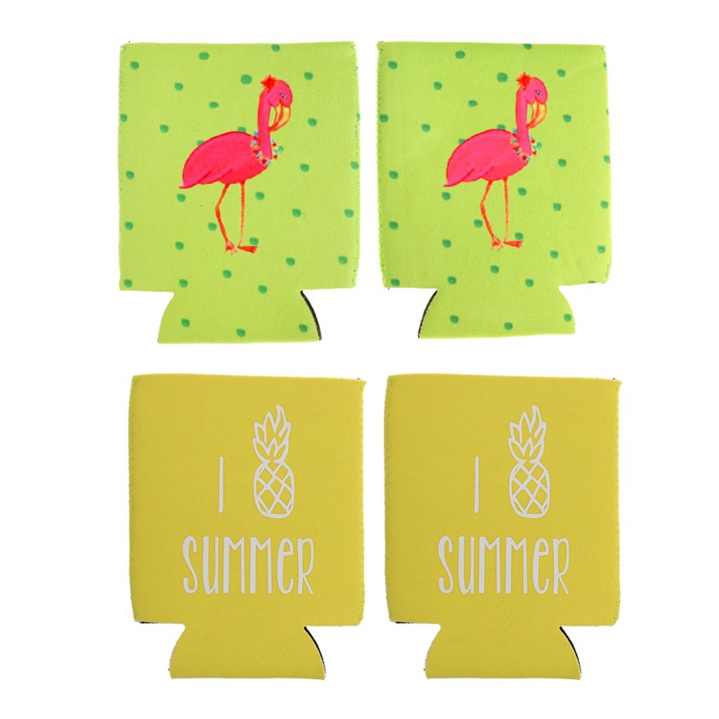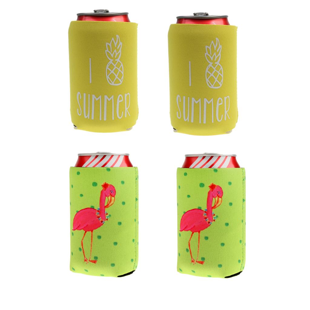 Novelty beer soda can sleeves with pineapple and flamingo summer decoration, perfect chilling cooler wrap.
